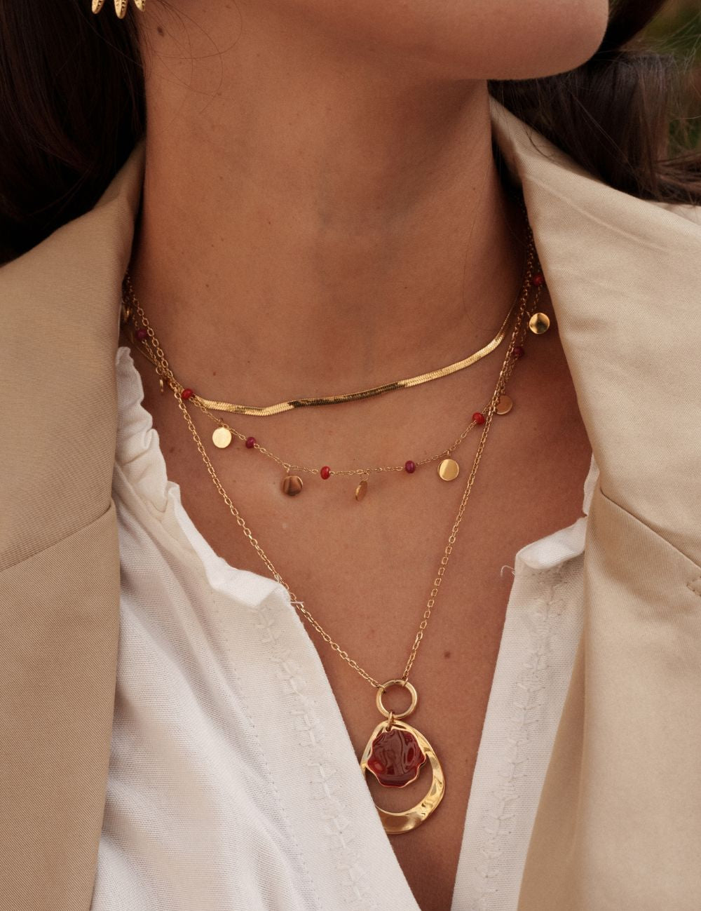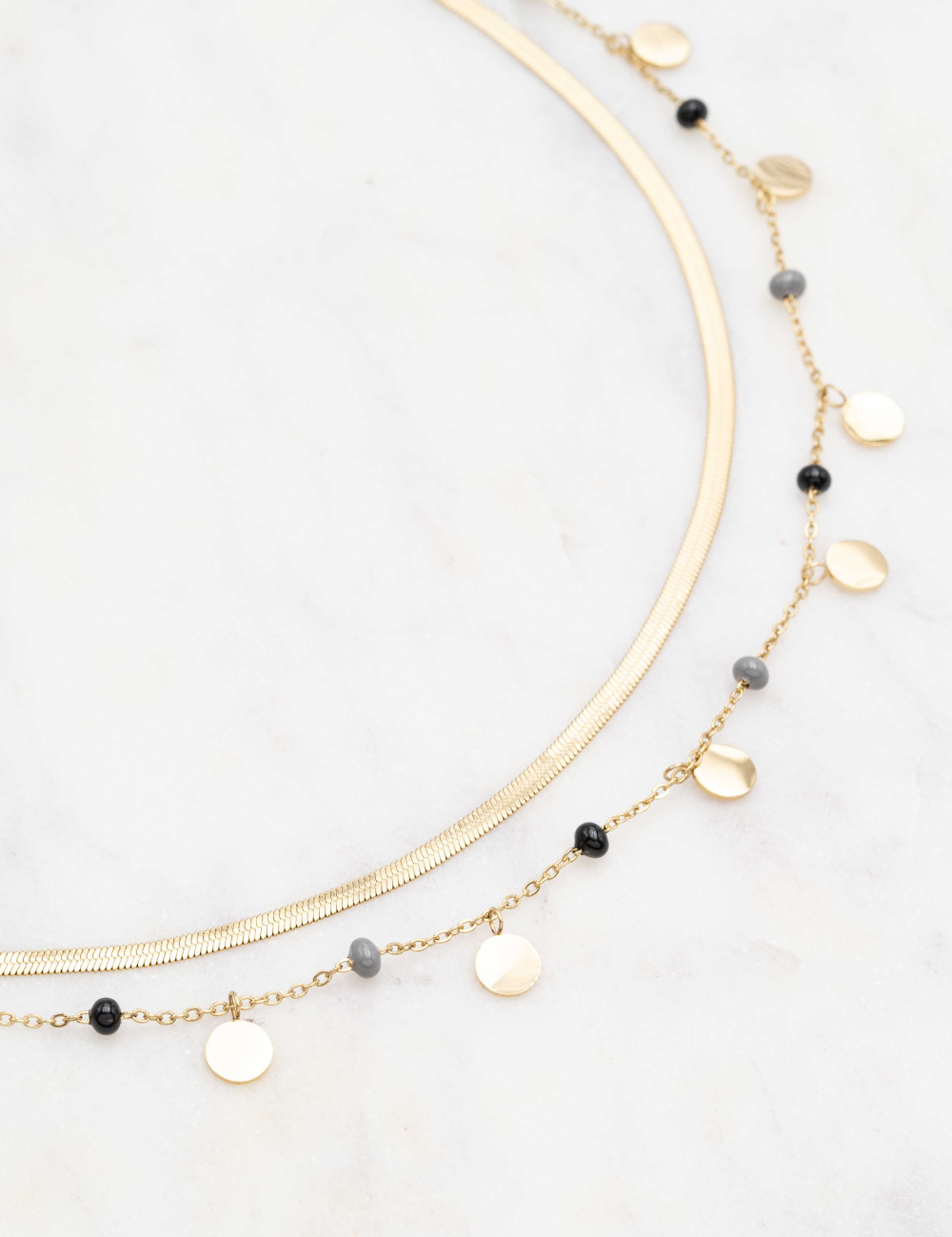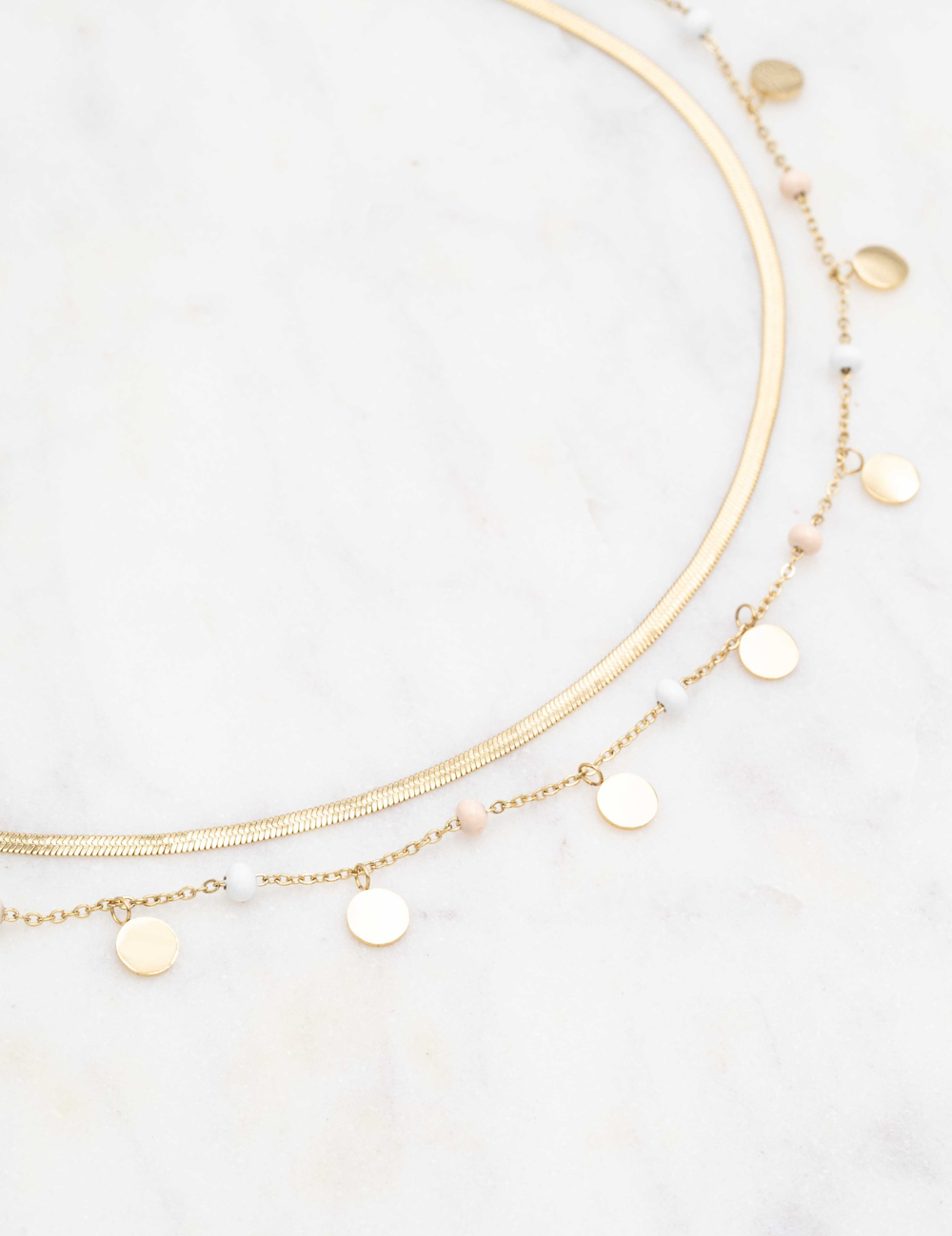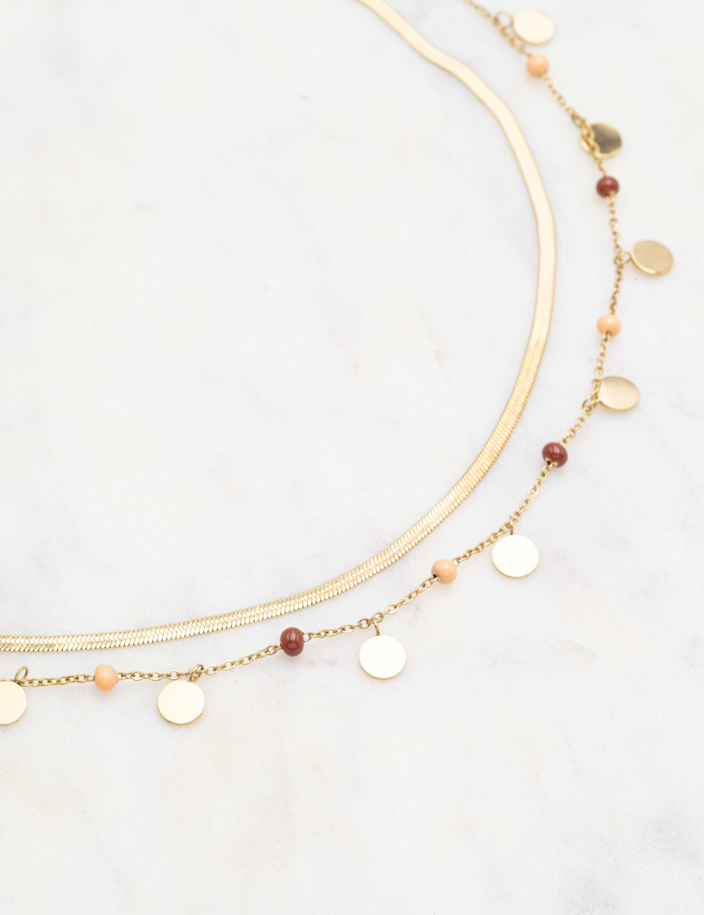 Collier réglable double rangs sur chaîne avec maille miroir composé de pampilles rondes et de petites perles émaillées colorées.