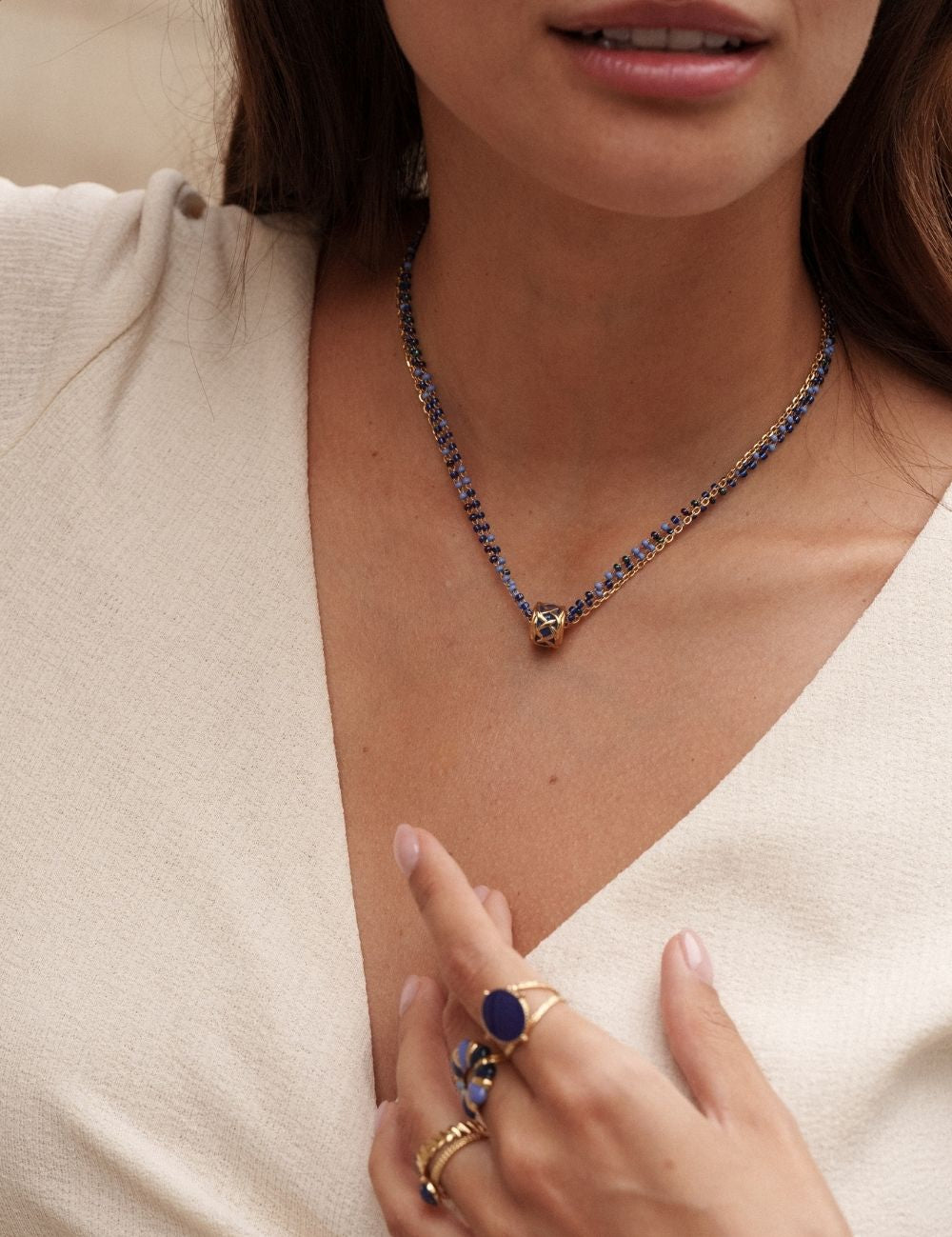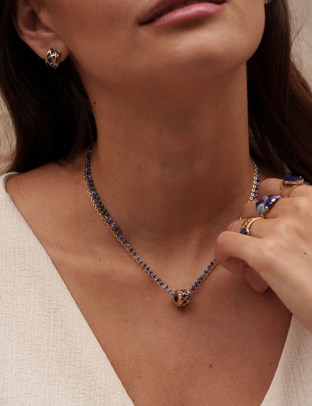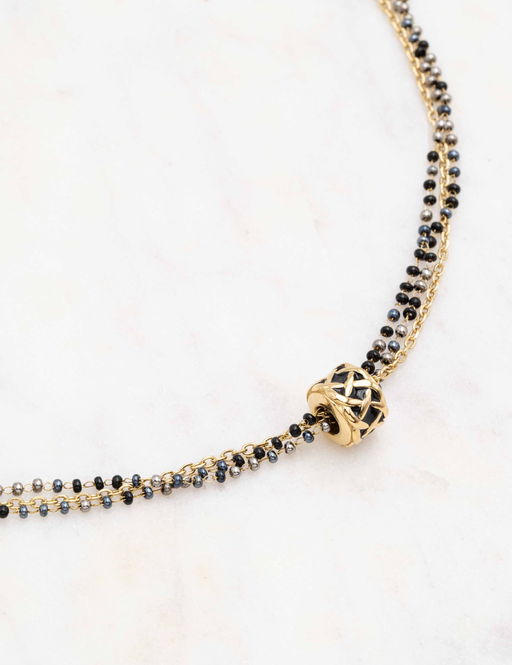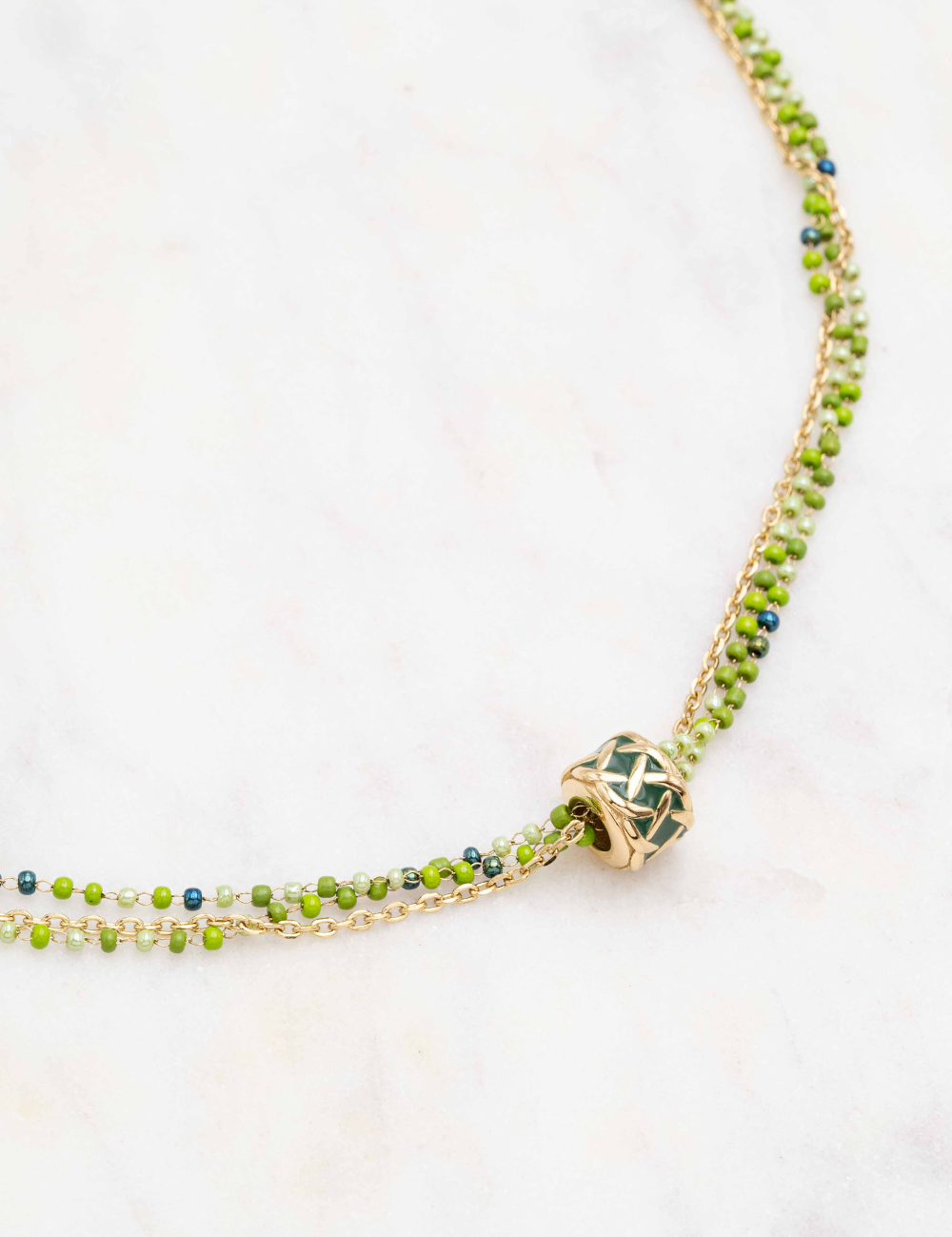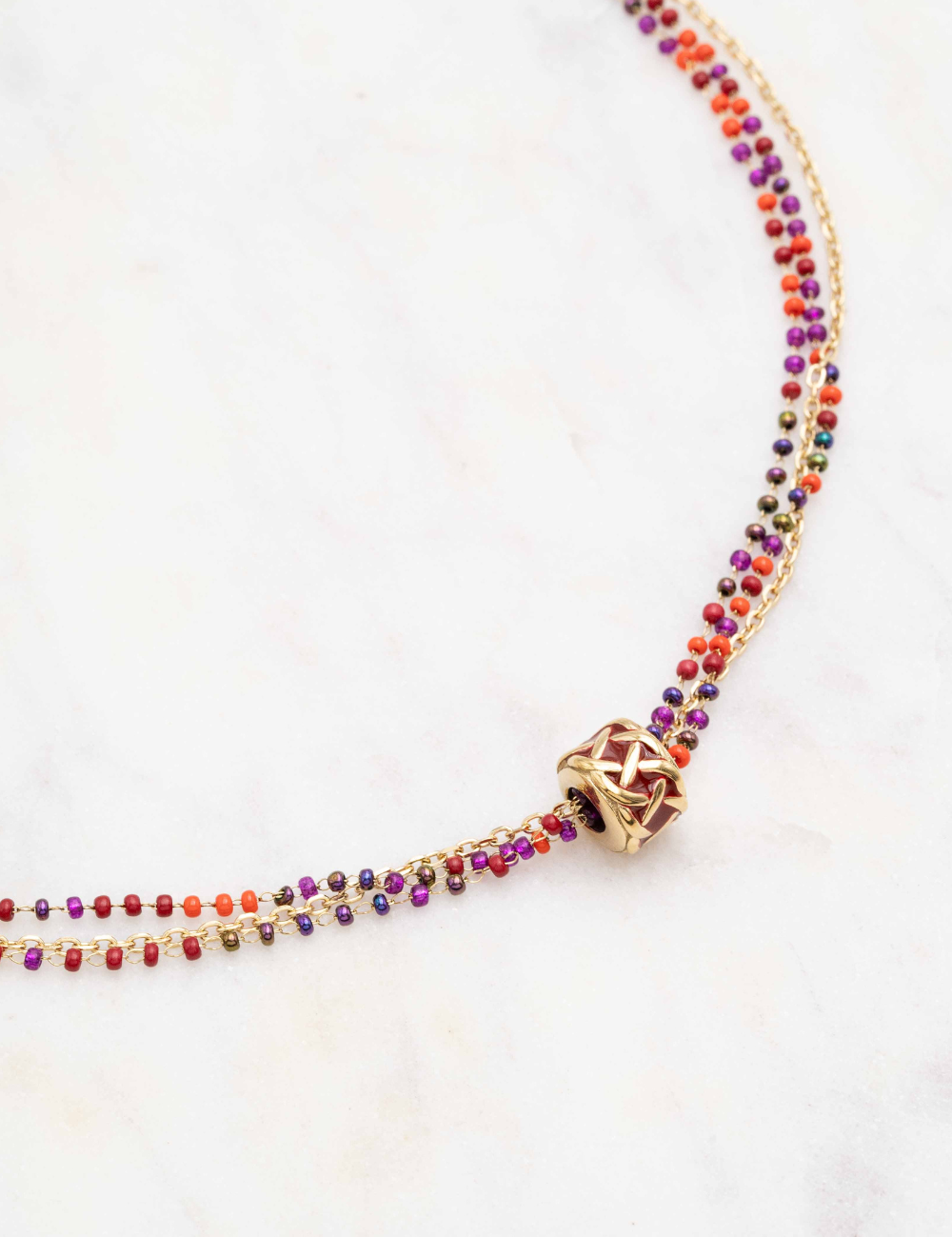 Collier réglable sur chaîne triple rangs embelli de pâtes de verre et composé d'un pendentif graphique émaillé coloré.