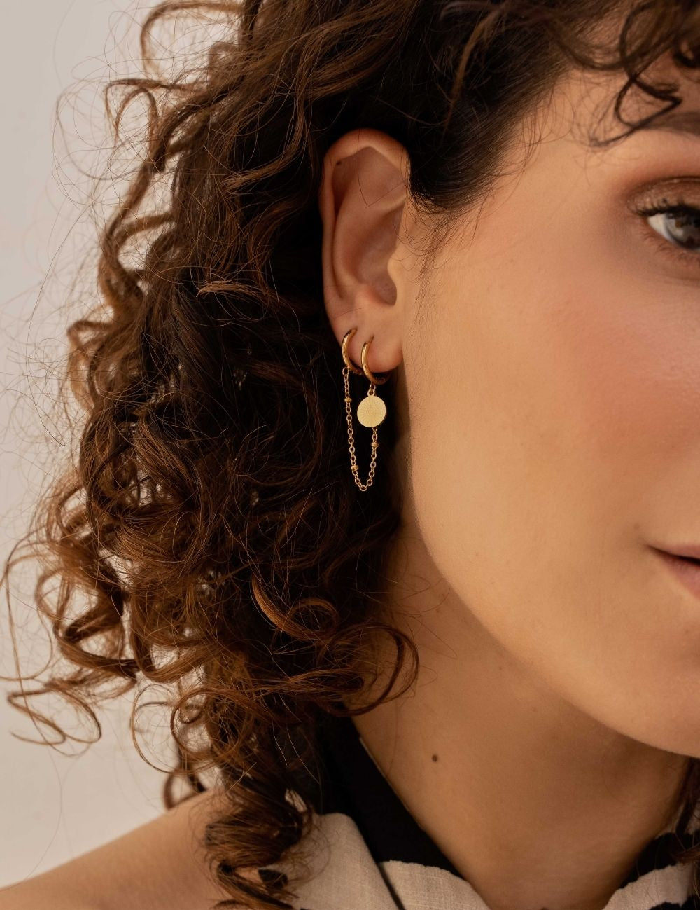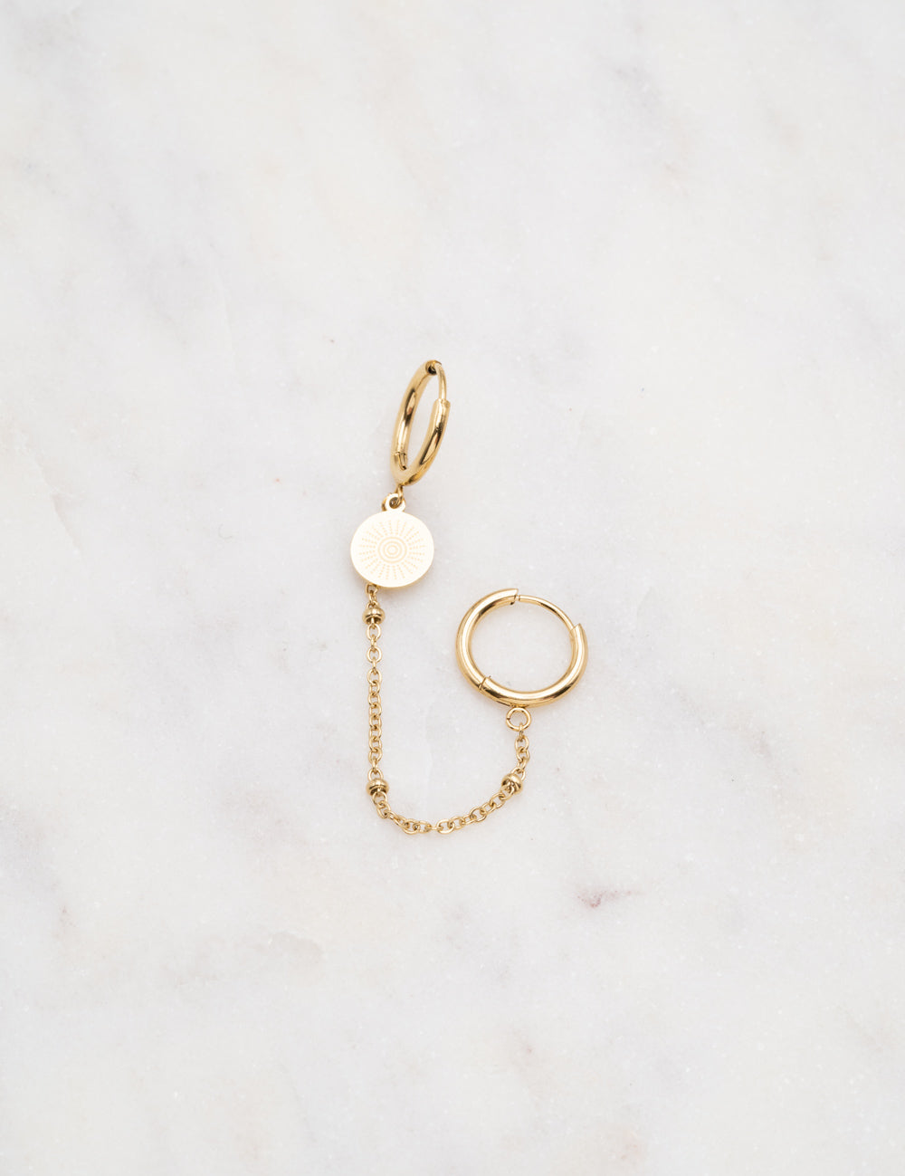 Mono boucle d'oreille type créoles composées d'une chaîne avec une pampille ronde au motif solaire. Fermoir charnière.