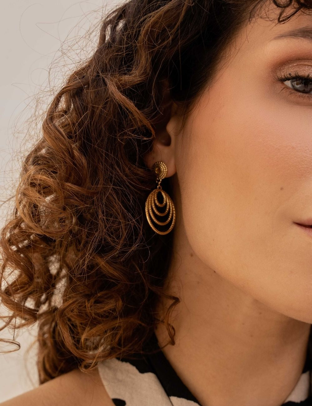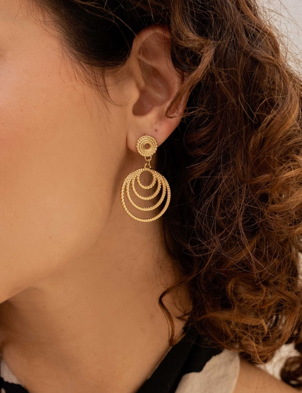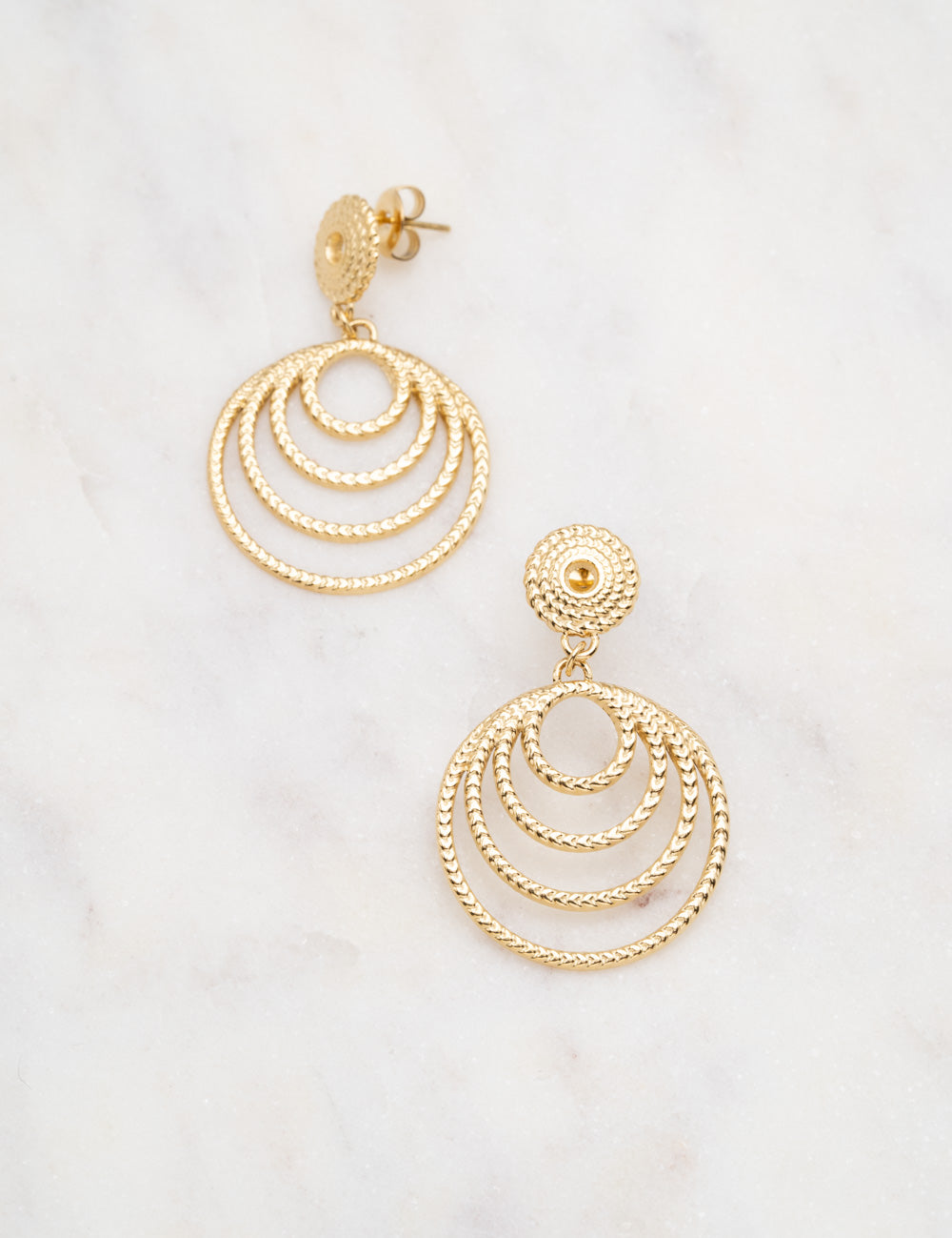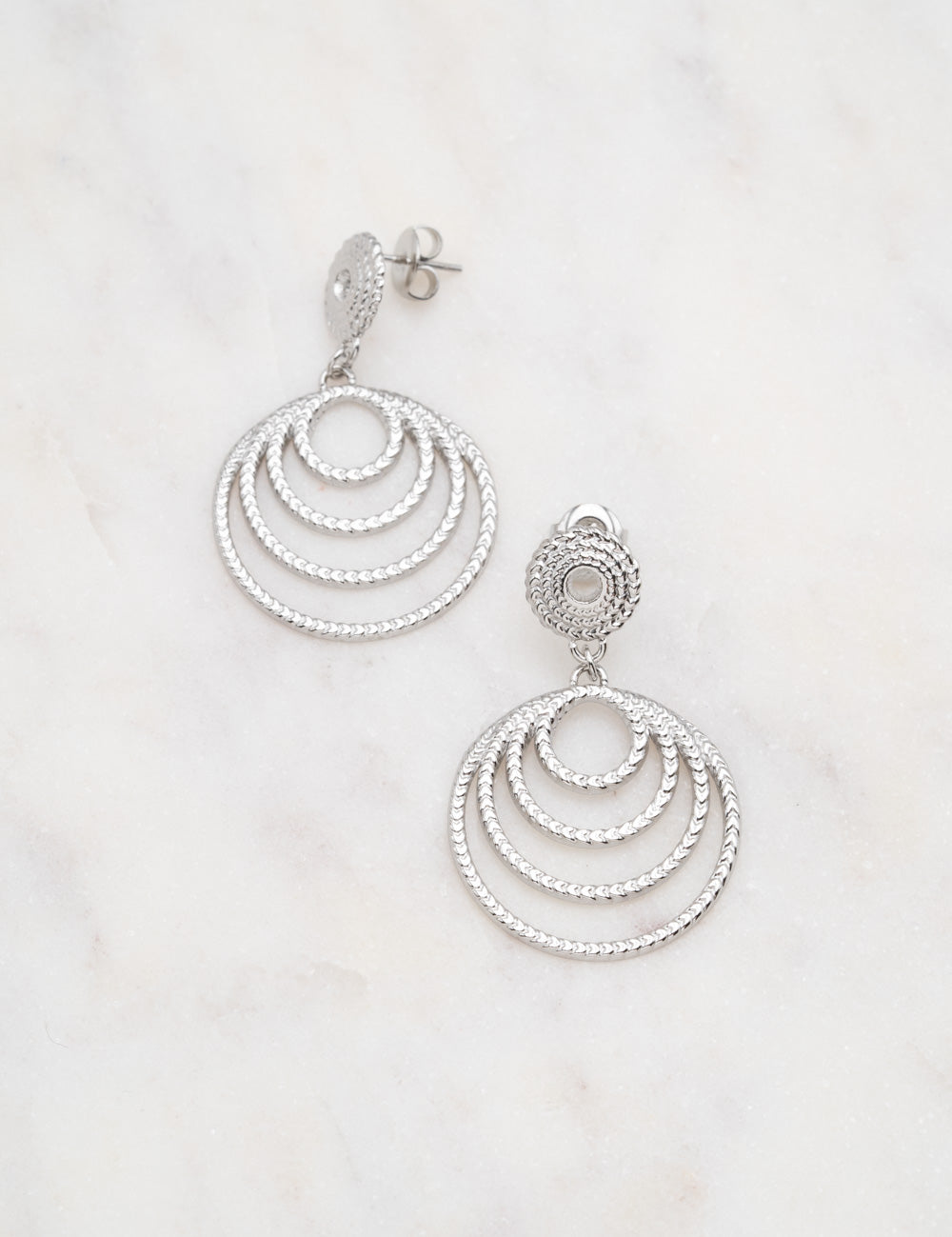Boucles d'oreilles à puce composées d'une pièce ronde ajourée et d'une pièce effet multi-anneaux martelés.