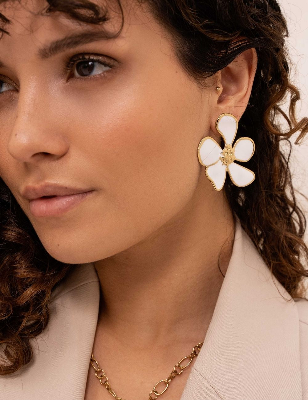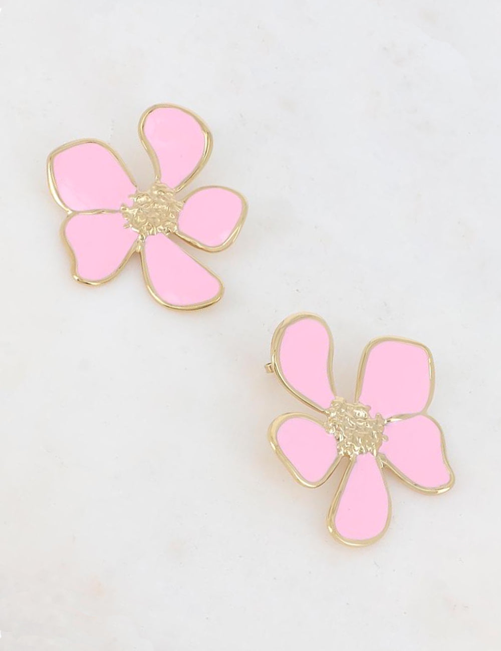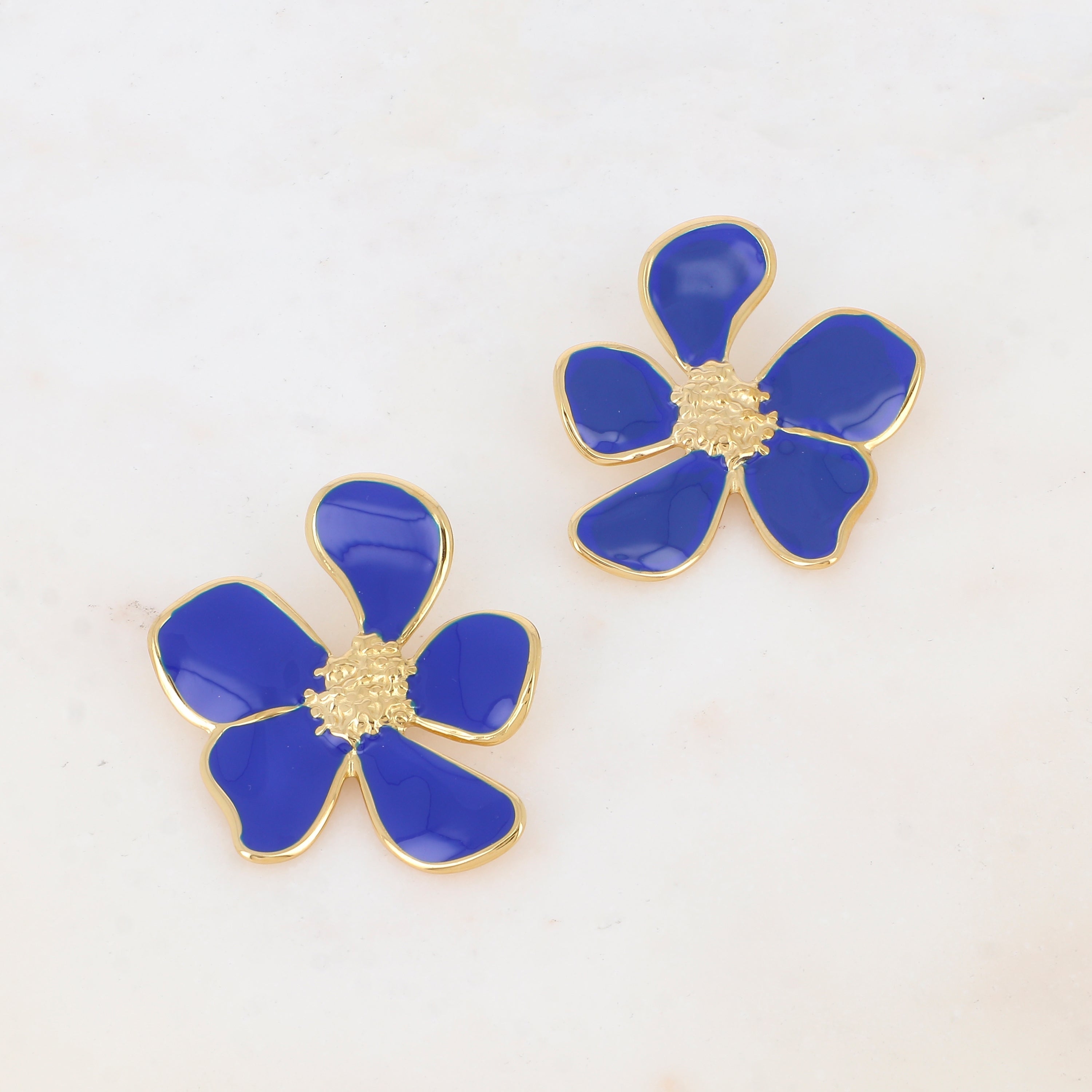 Boucles d'oreilles à puce formant une fleur émaillée colorée. Fermoir papillon.