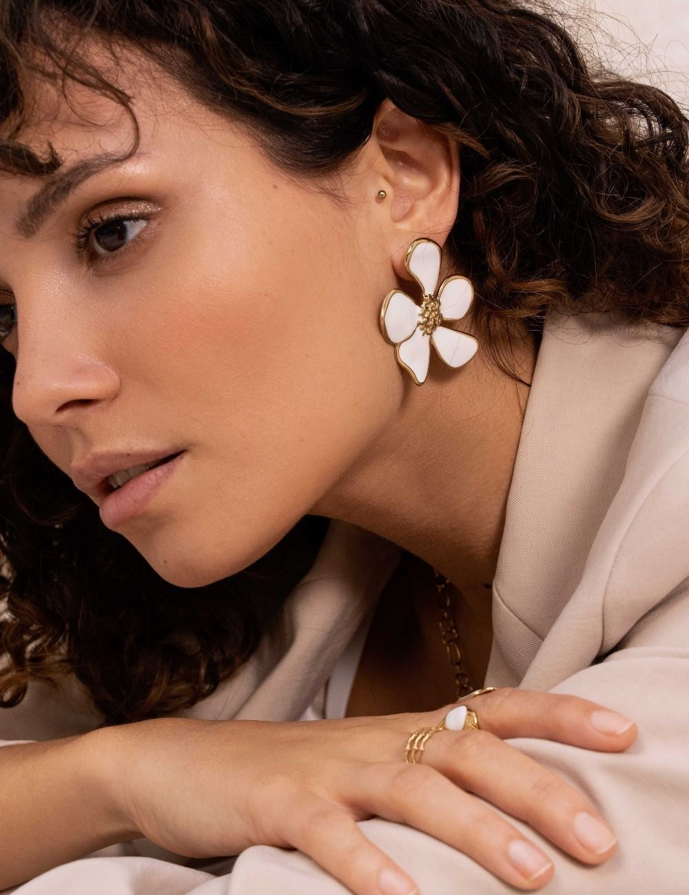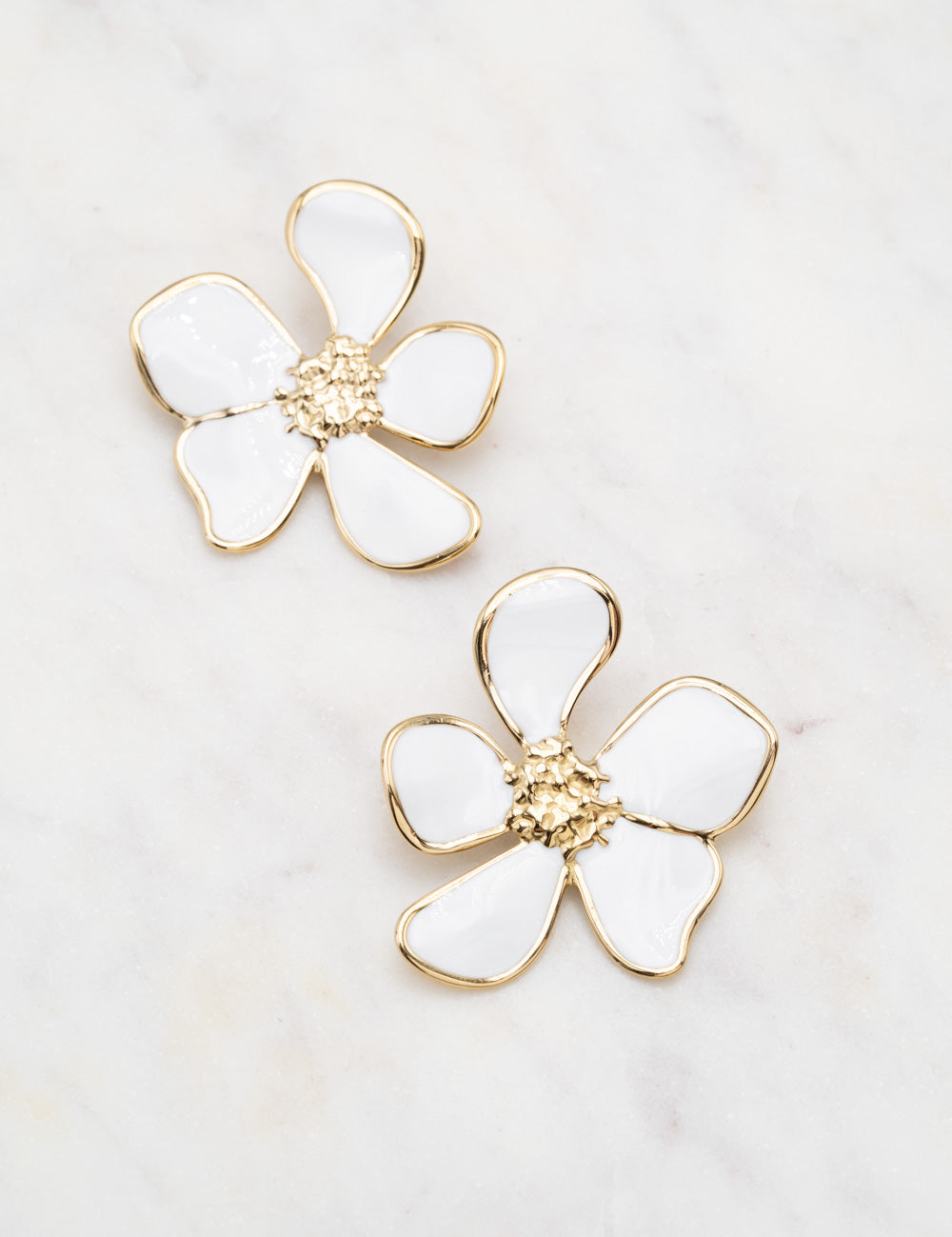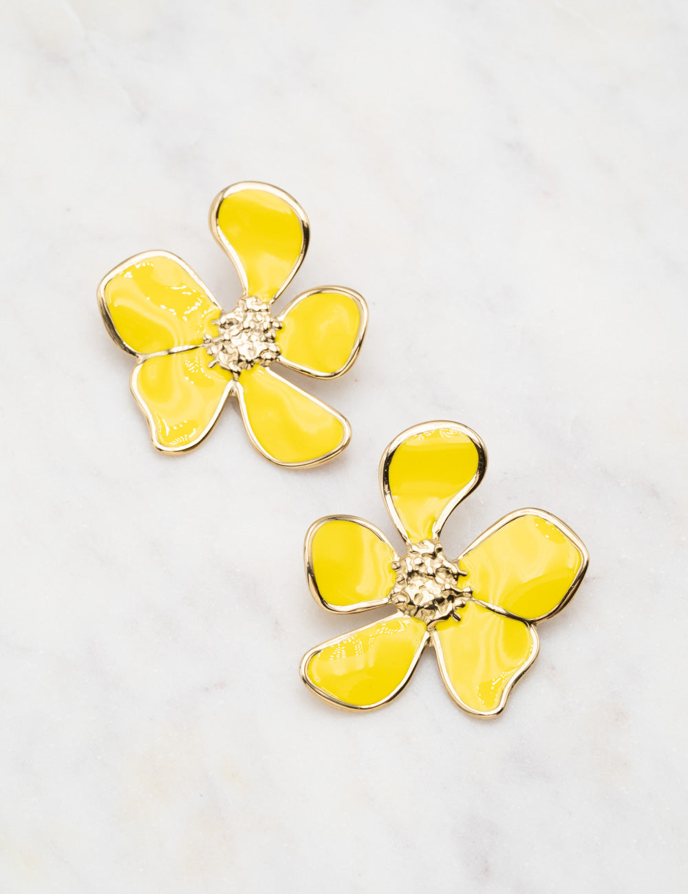 Boucles d'oreilles à puce formant une fleur émaillée colorée. Fermoir papillon.