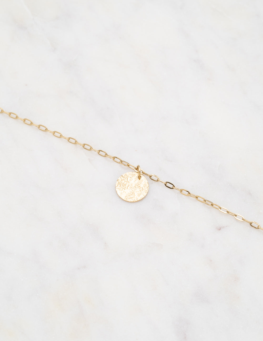 Bracelet réglable sur chaine maille composé d'une pampille martelée. Fermoir mousqueton et chainette de réglage.