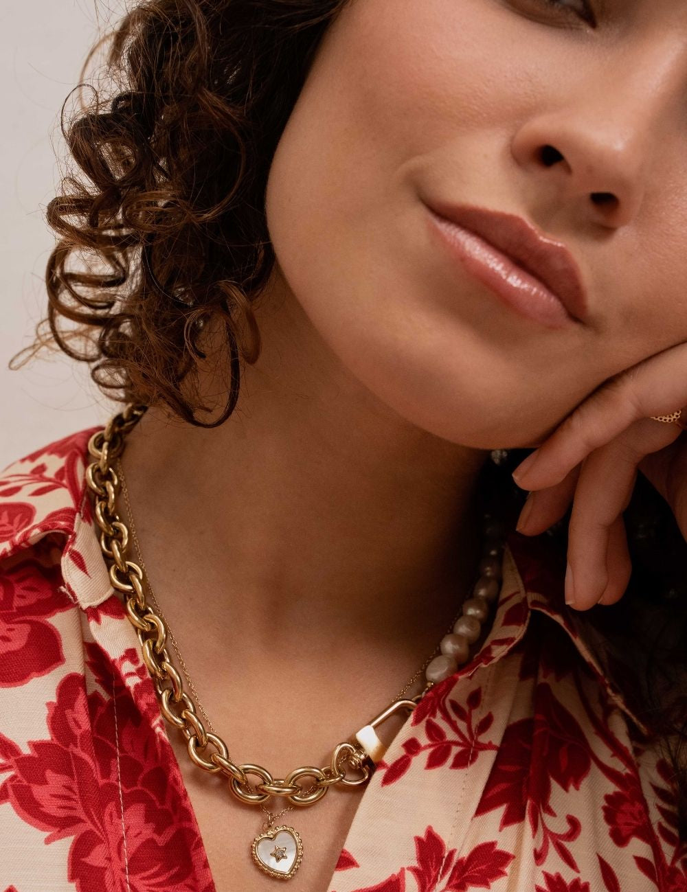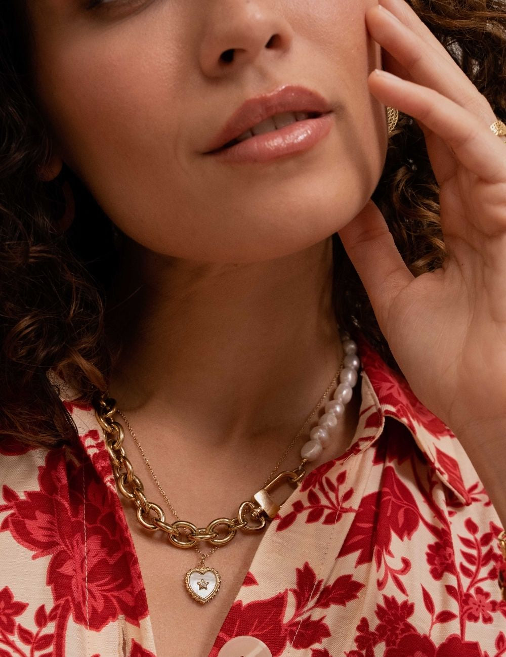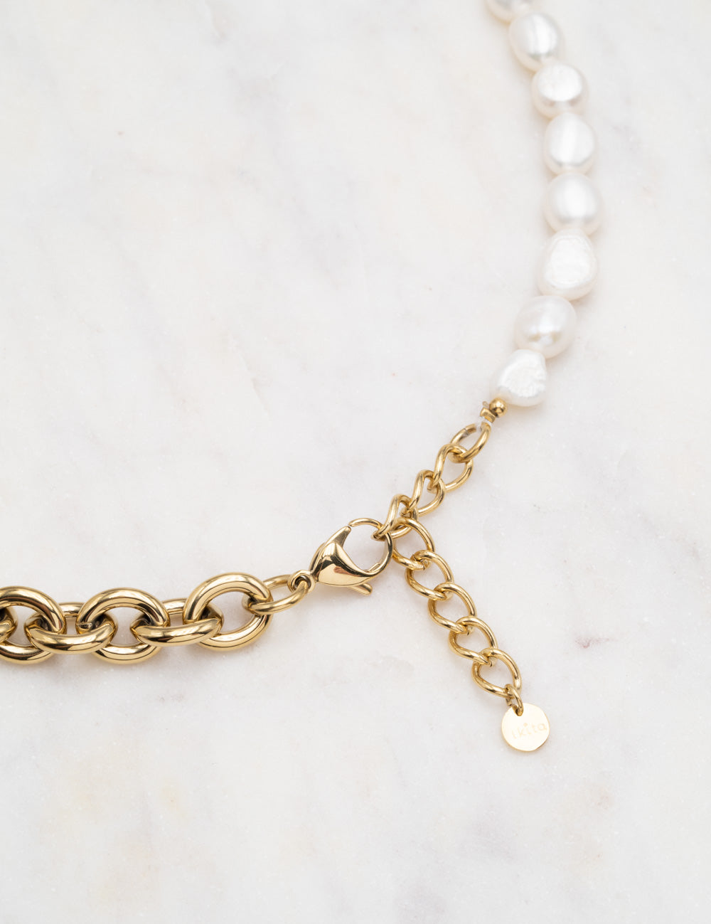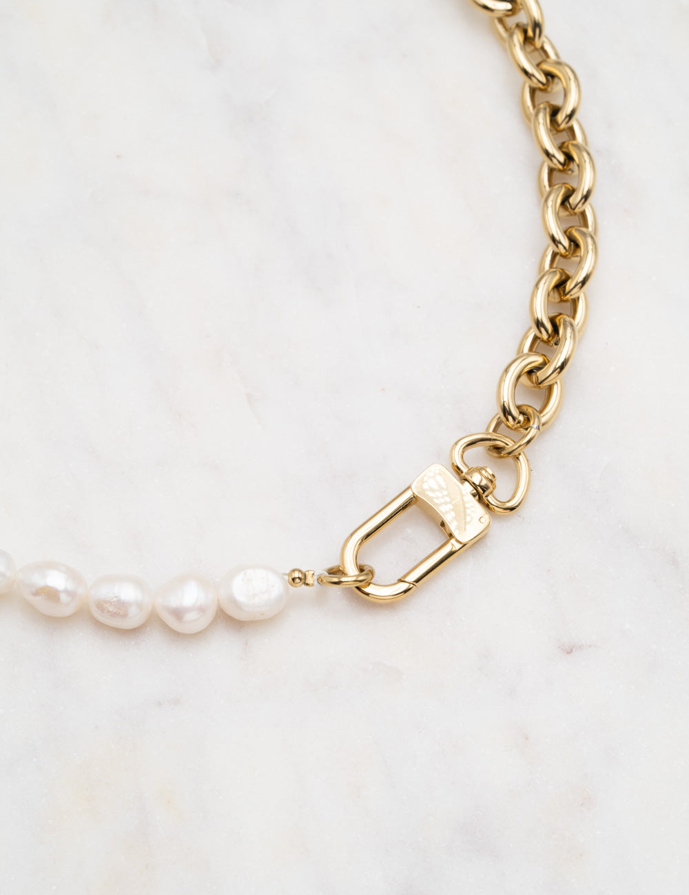 Collier graphique réglable avec un jeu de matières composé de maillons, de perles d'eau douce et orné d'une pièce type fermoir mousqueton.