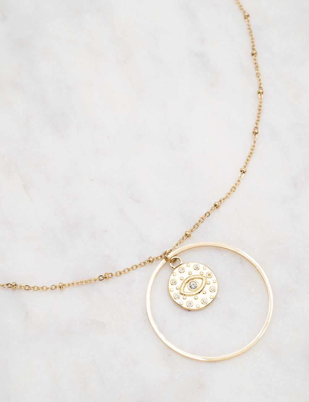 Collier réglable composé d'un anneau et d'un pendentif œil serti de strass (oxydes de zirconium). Fermoir mousqueton et chainette de réglage.