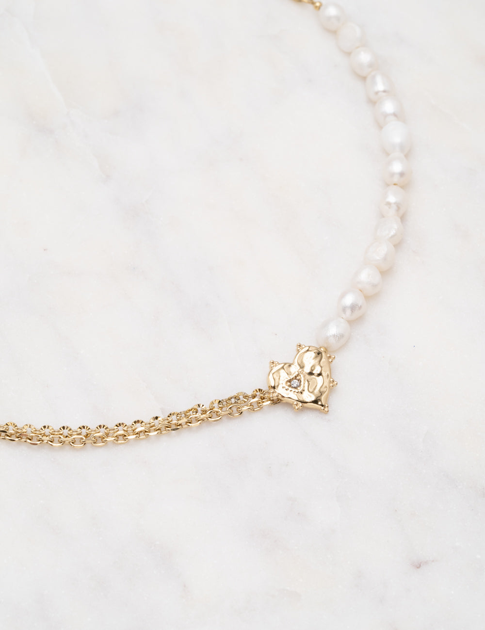 Collier réglable avec une partie en maille Jaseron et une autre partie sur chaine double rangs embelli de perles en pierres naturelles. Le collier est composé d'un pendentif coeur martelé orné d'un motif coeur gravé et serti d'un strass.