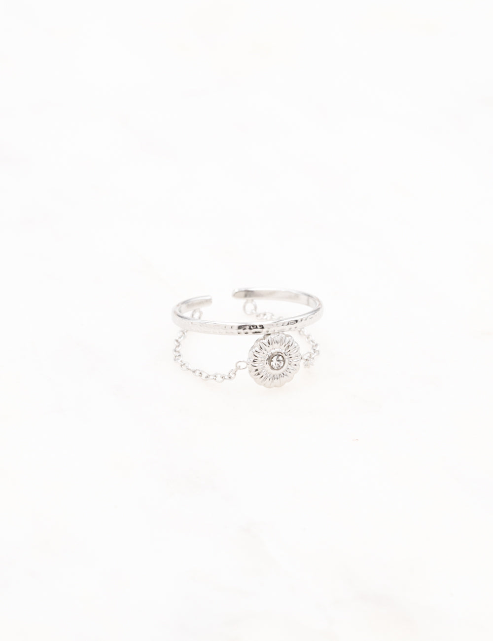 Bague graphique fine ajustable effet 2 rangs composée d'une chaîne, d'une fleur ornée d'un strass.