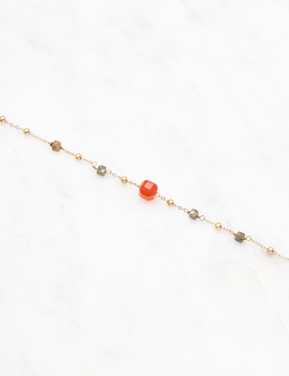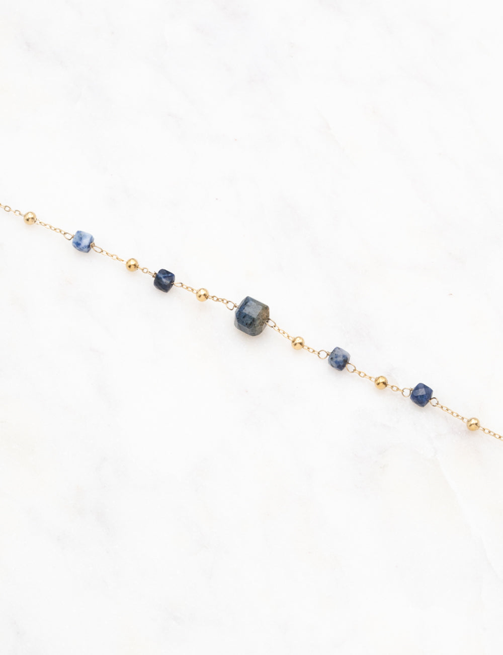 Bracelet réglable sur chaîne composé de perles en pierres naturelles et boules dorées.