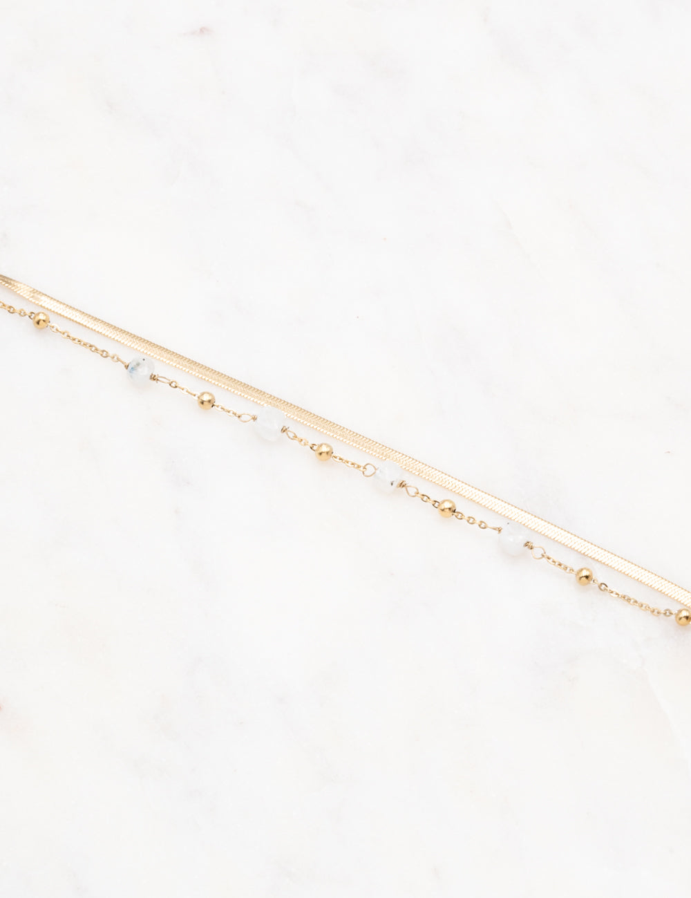 Bracelet réglable double rangs sur chaîne avec maille miroir composé de perles en pierres naturelles et boules dorées.