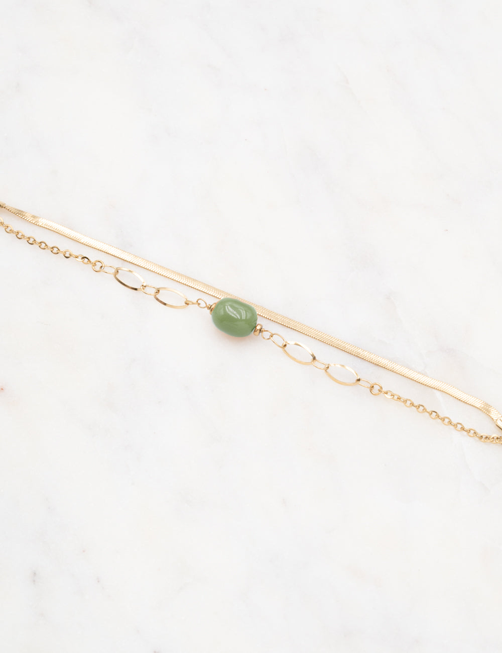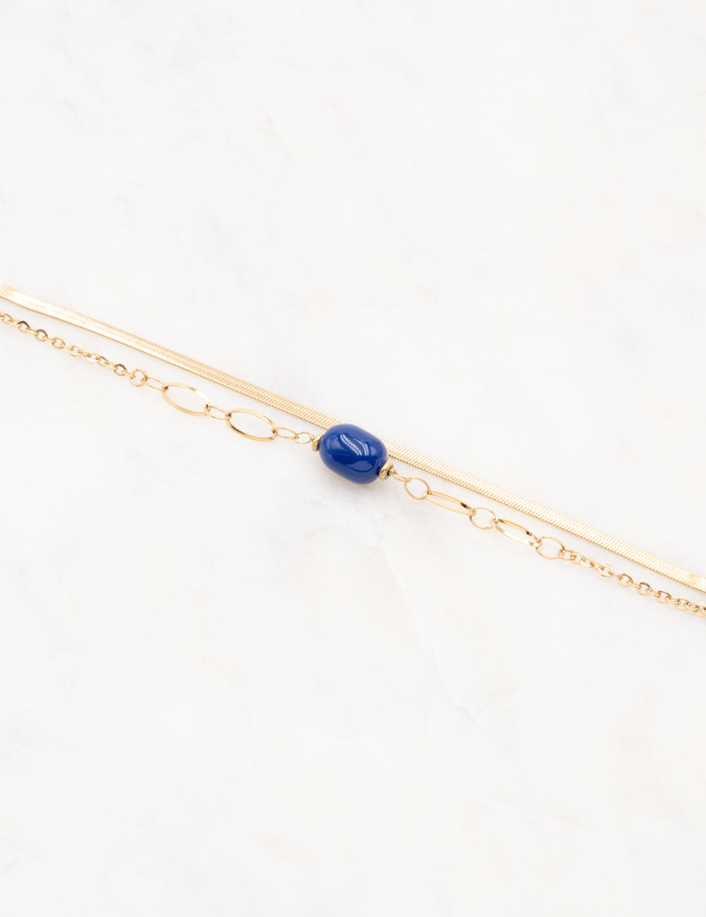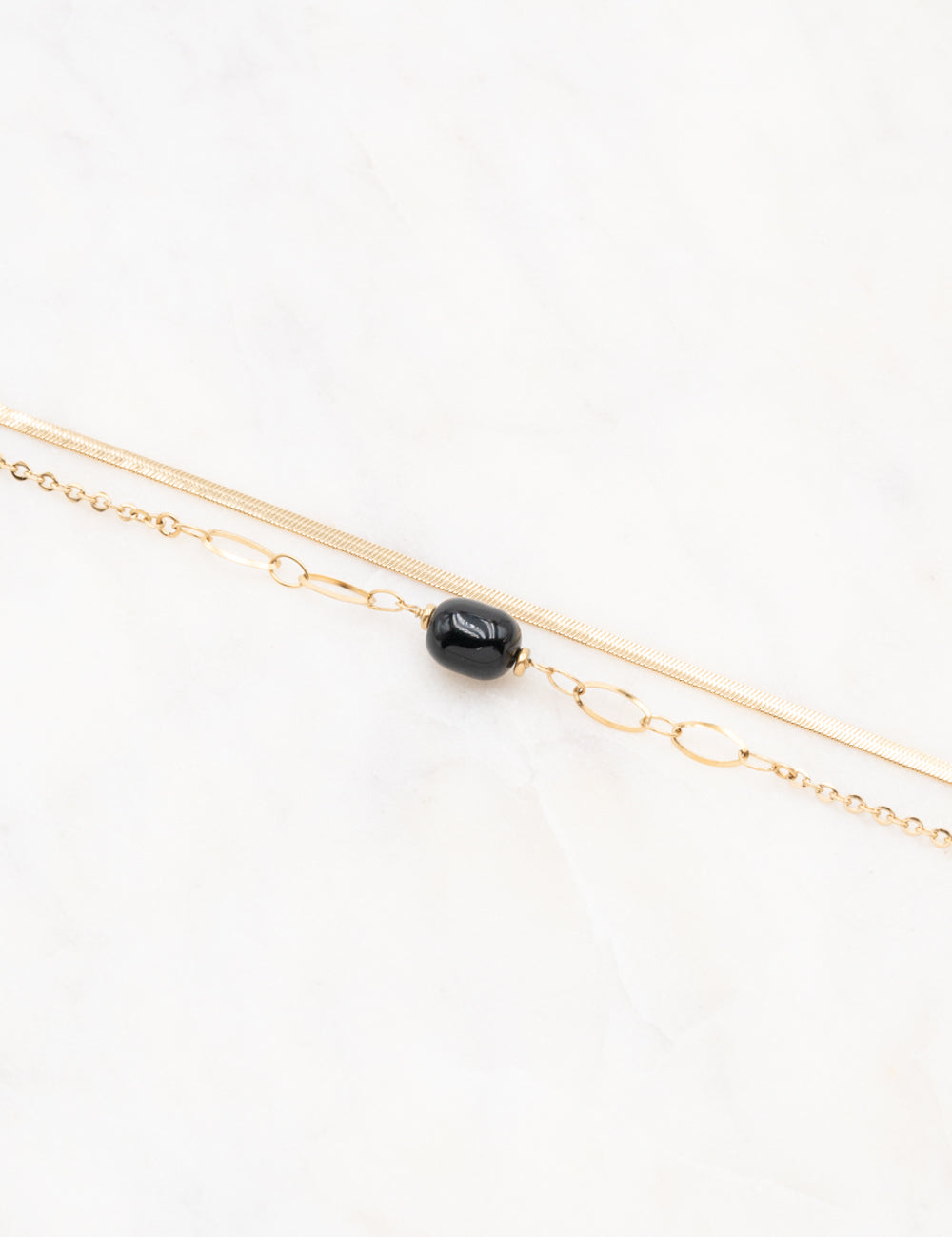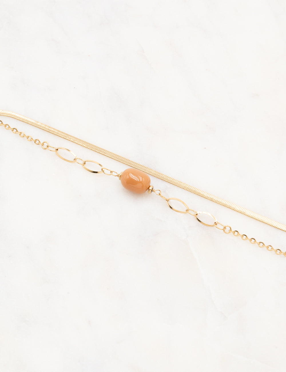 Bracelet réglable sur chaîne double rangs composé d'une maille miroir et d'une chaine ornée de perles en acétate.