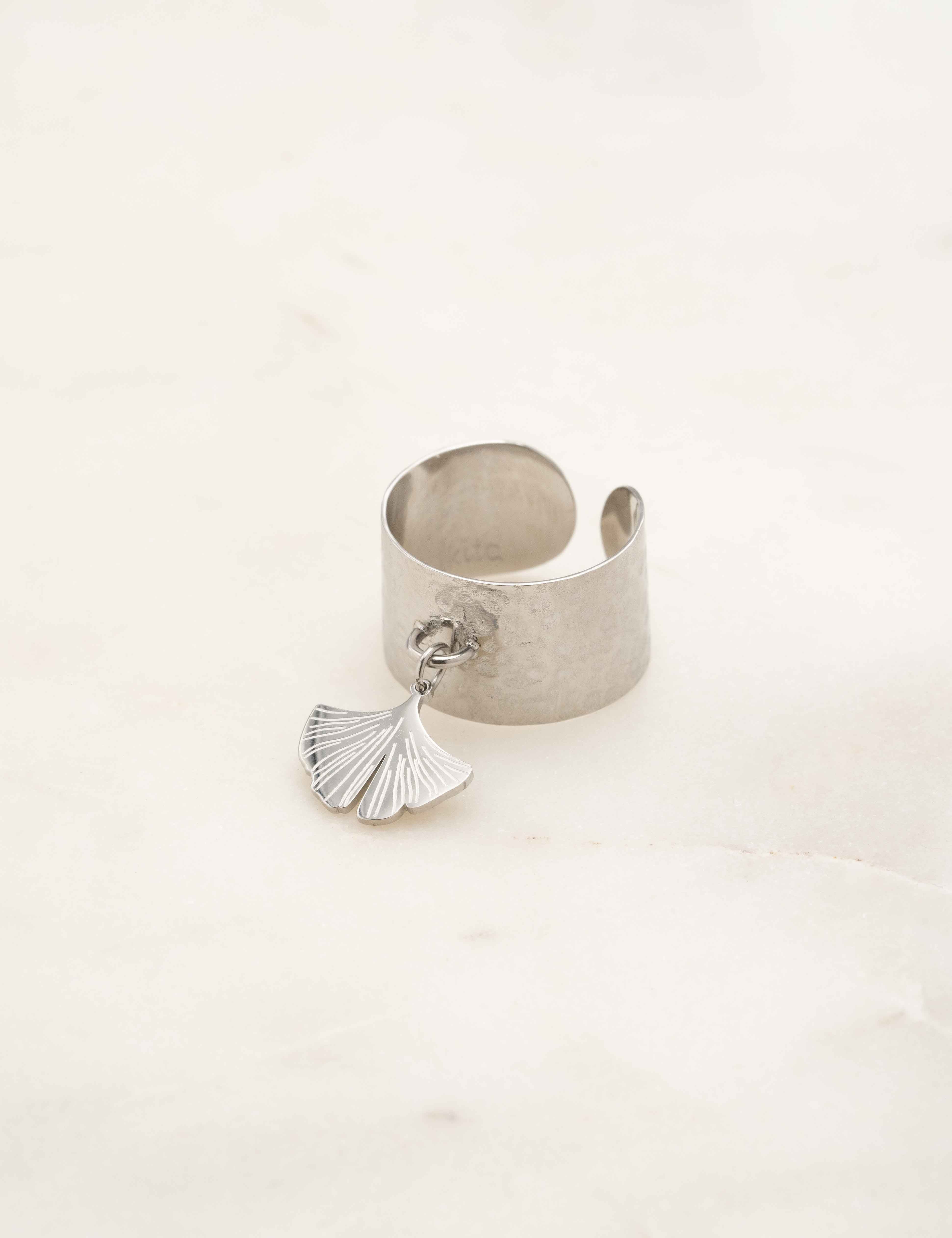 Bague ajustable graphique martelée avec une pampille au motif de feuille de gingko.