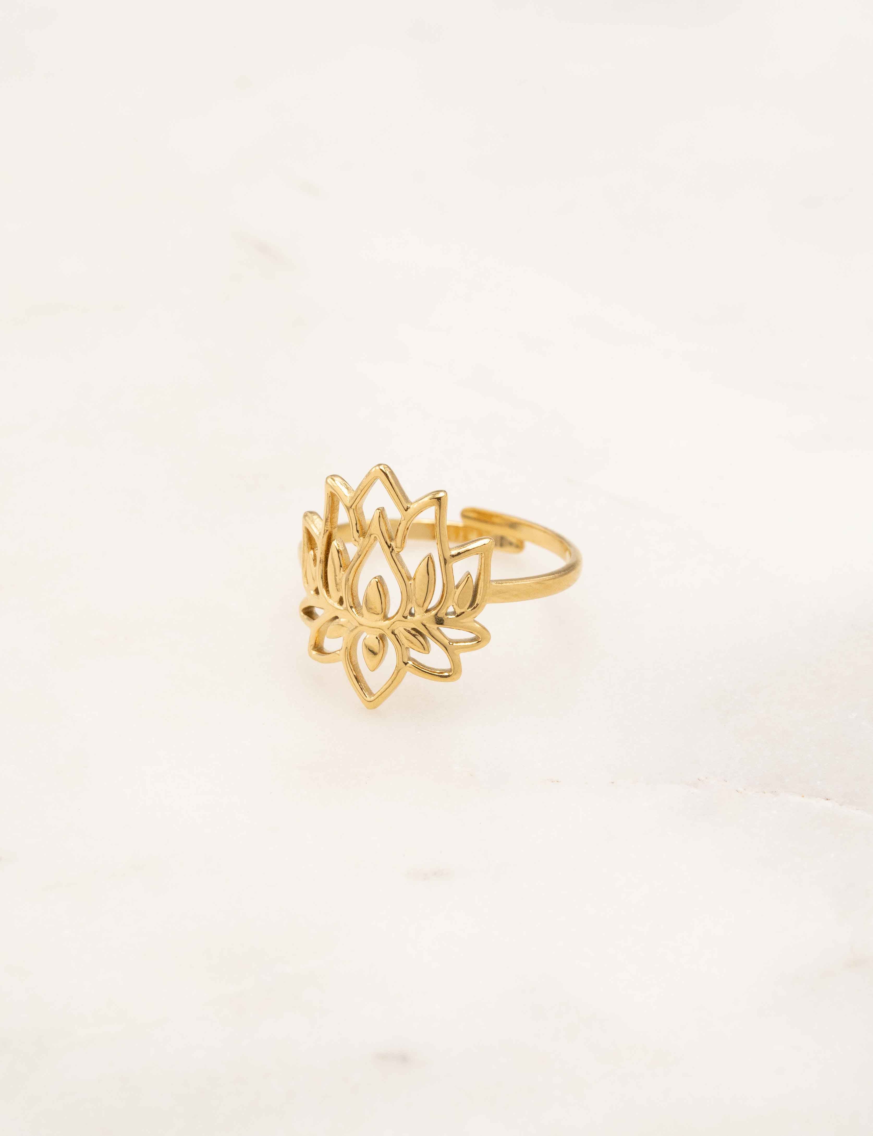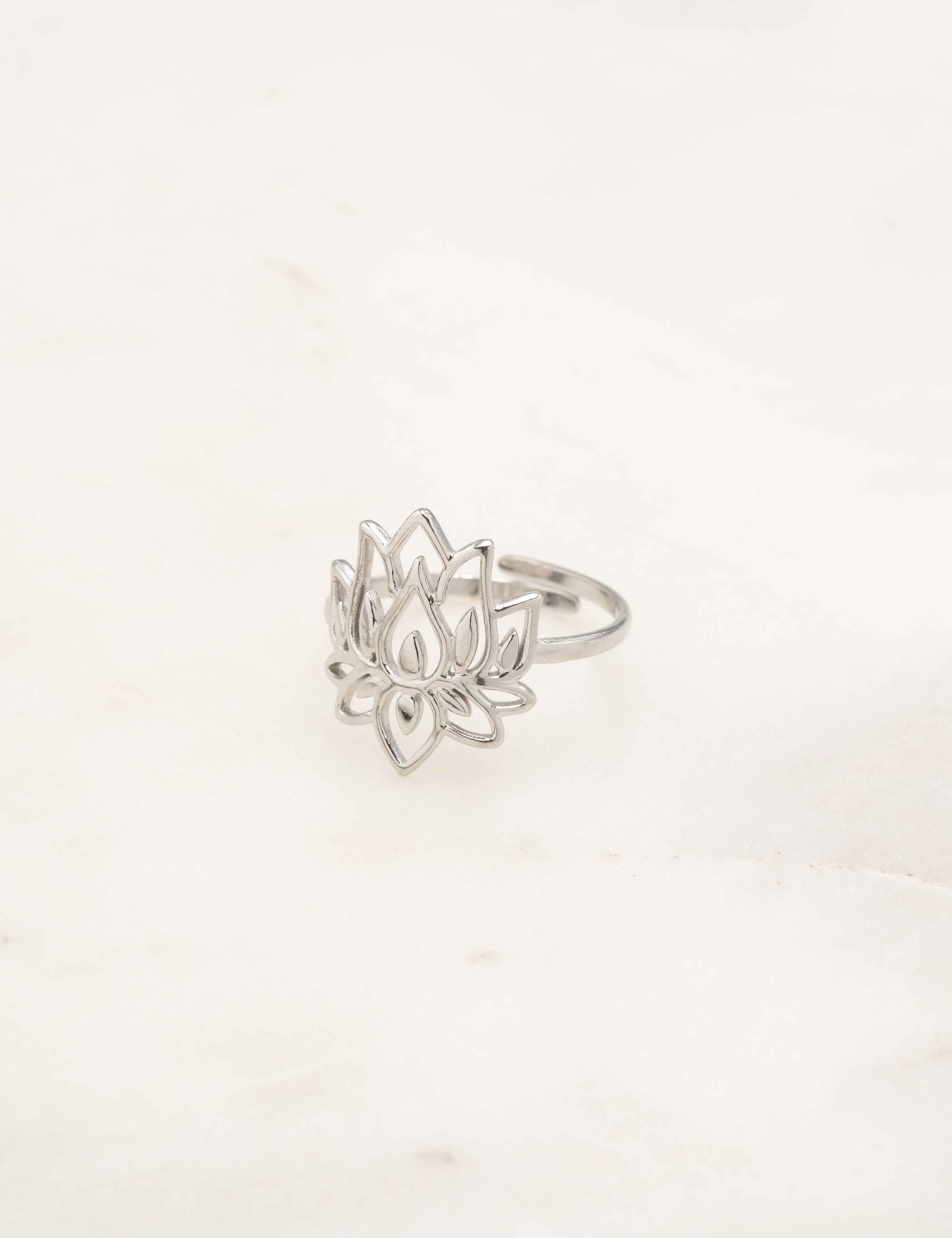 Bague ajustable graphique ajourée au motif fleur de lotus.