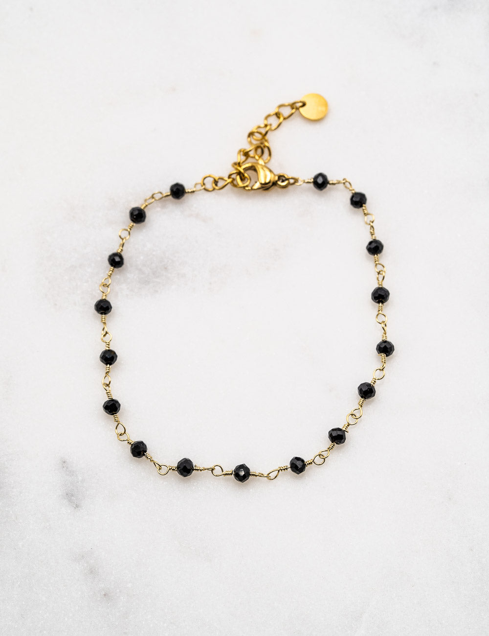 Bracelet sur chaîne avec fermoir mousqueton et chaînette réglable, composé de plusieurs perles en pate de verre.