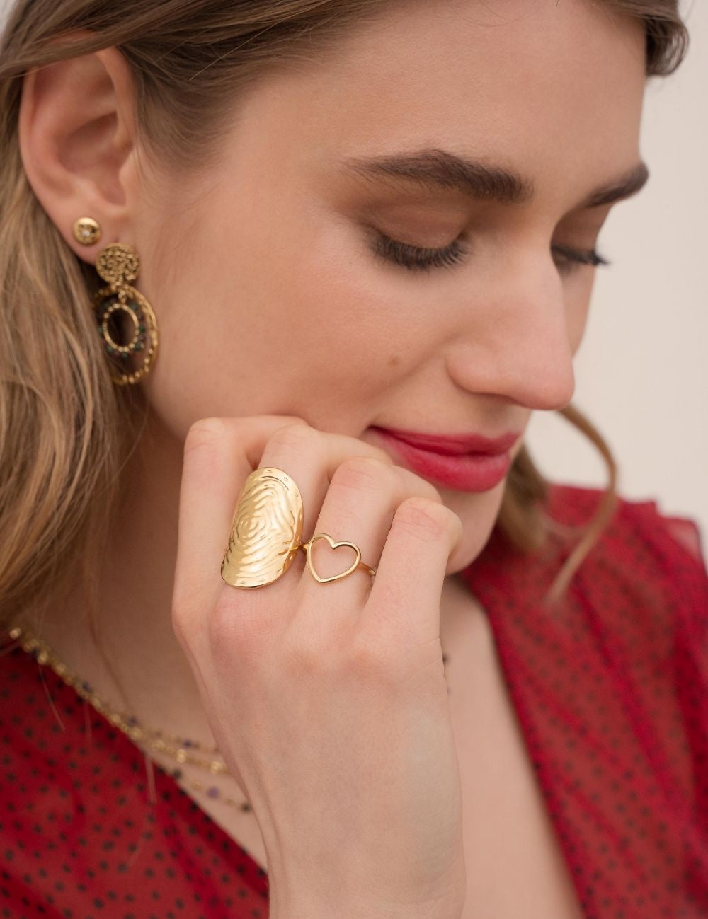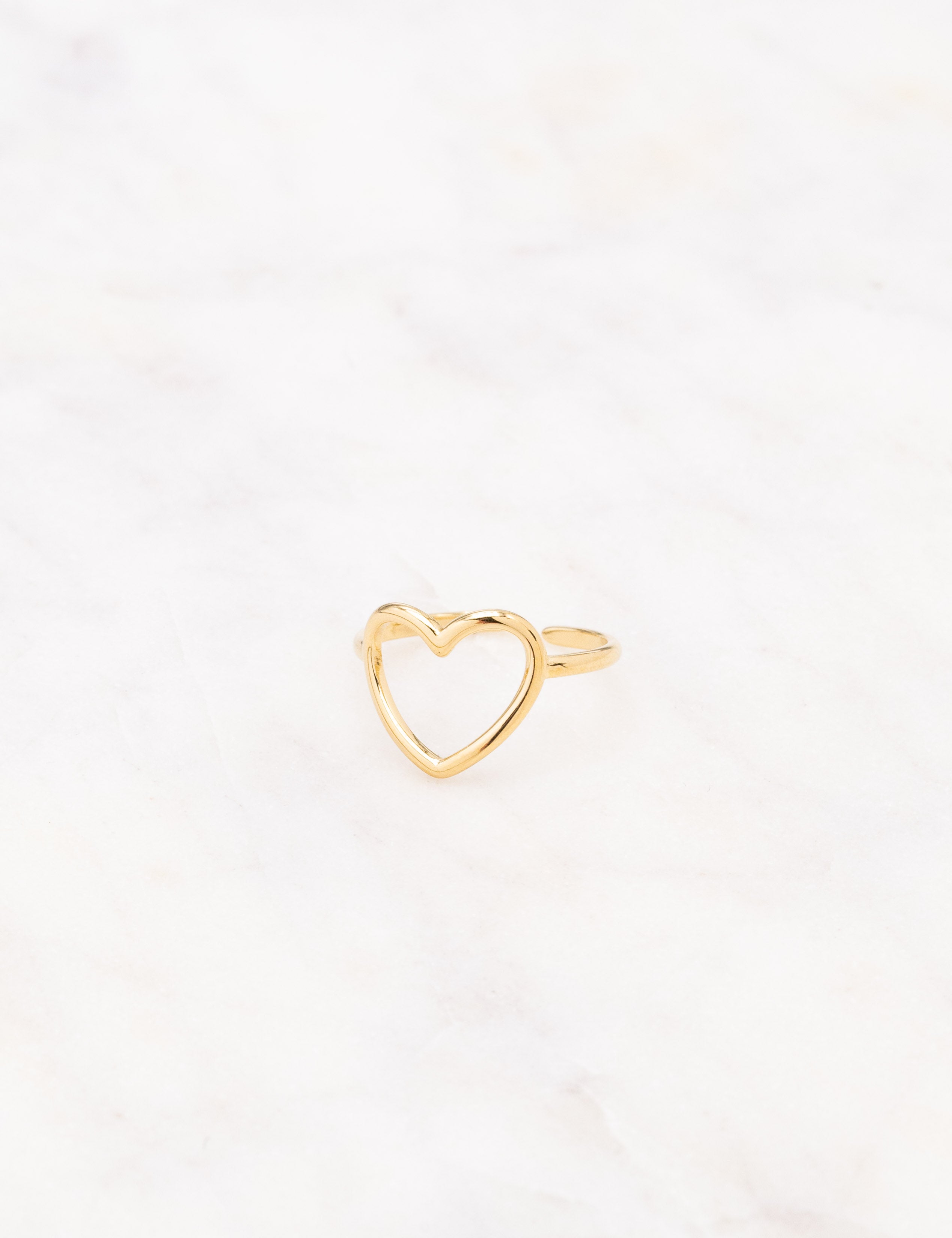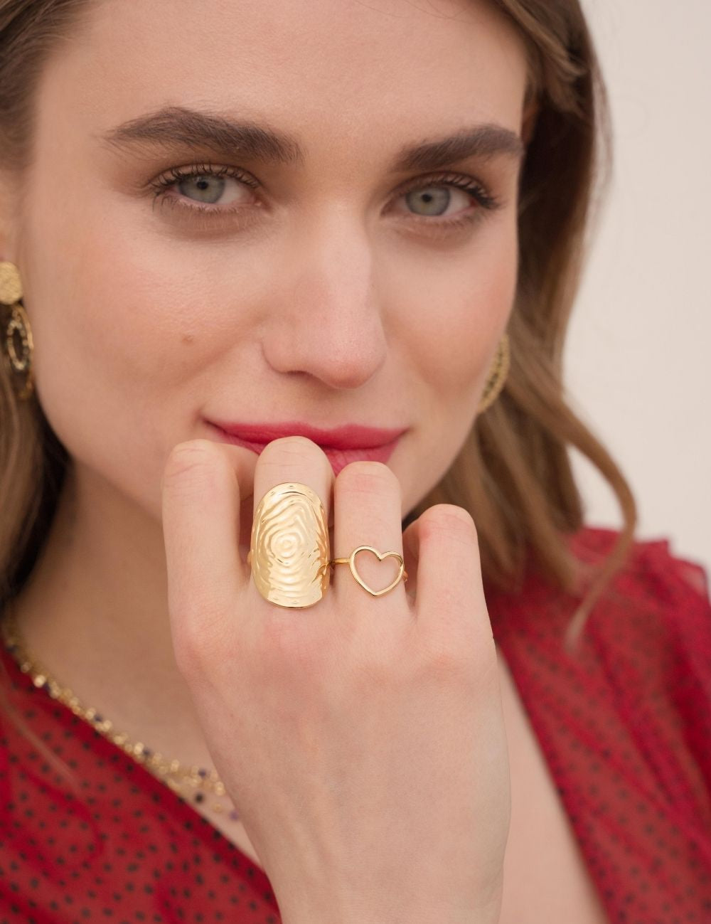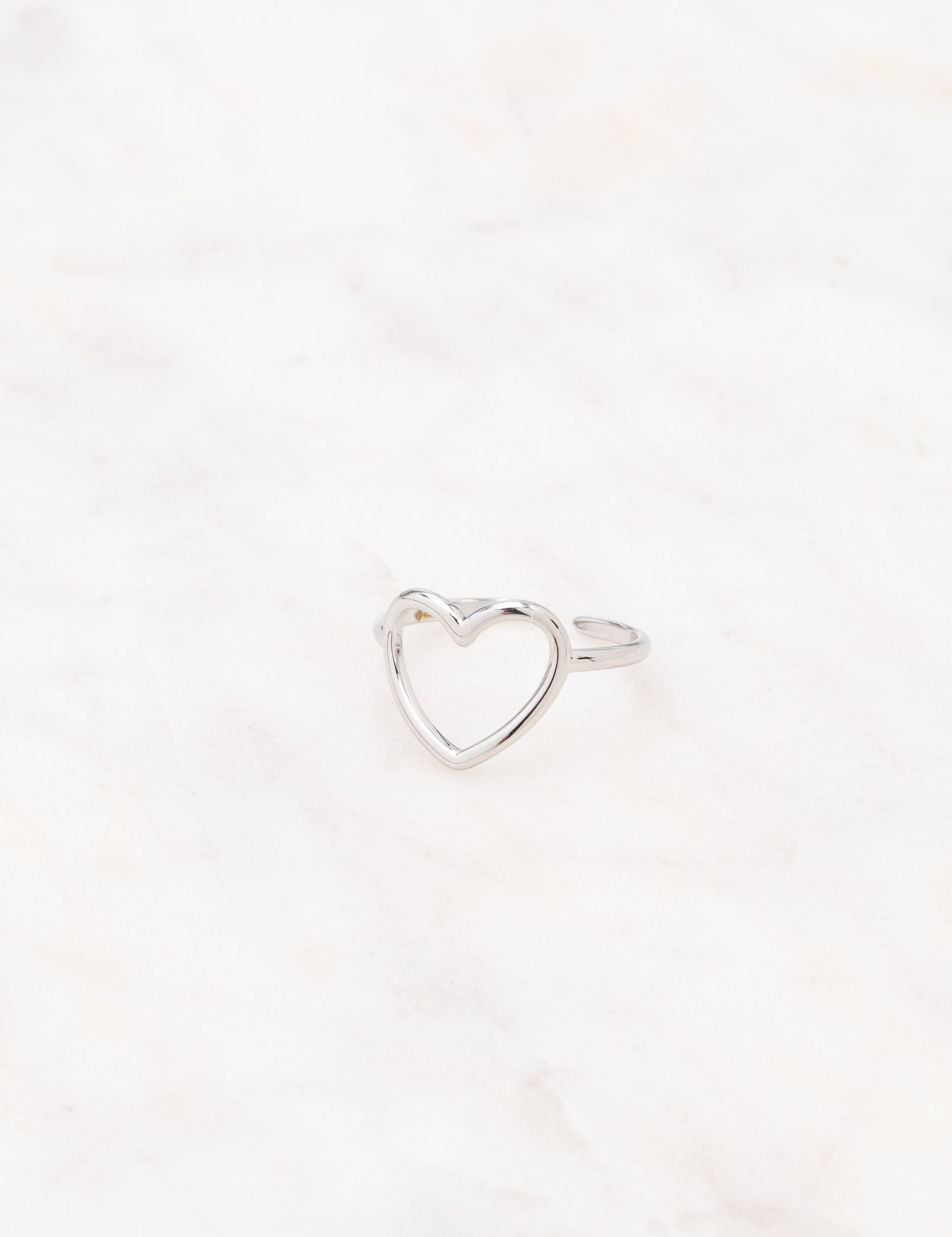 Bague graphique ajustable composée d'une pièce formant un coeur ajouré.