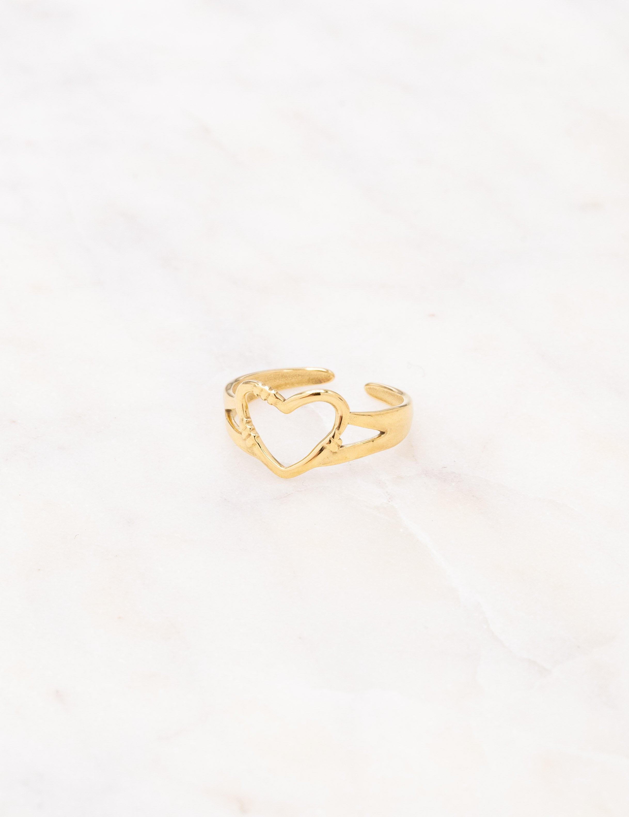 Bague graphique ajustable composée d'une pièce formant un coeur ajouré.