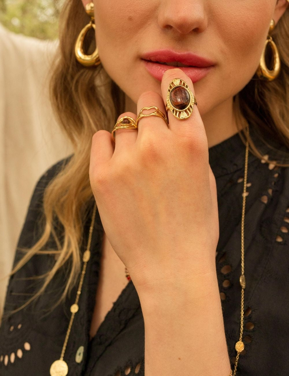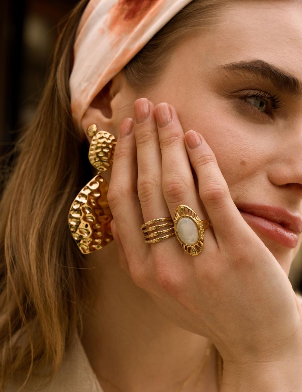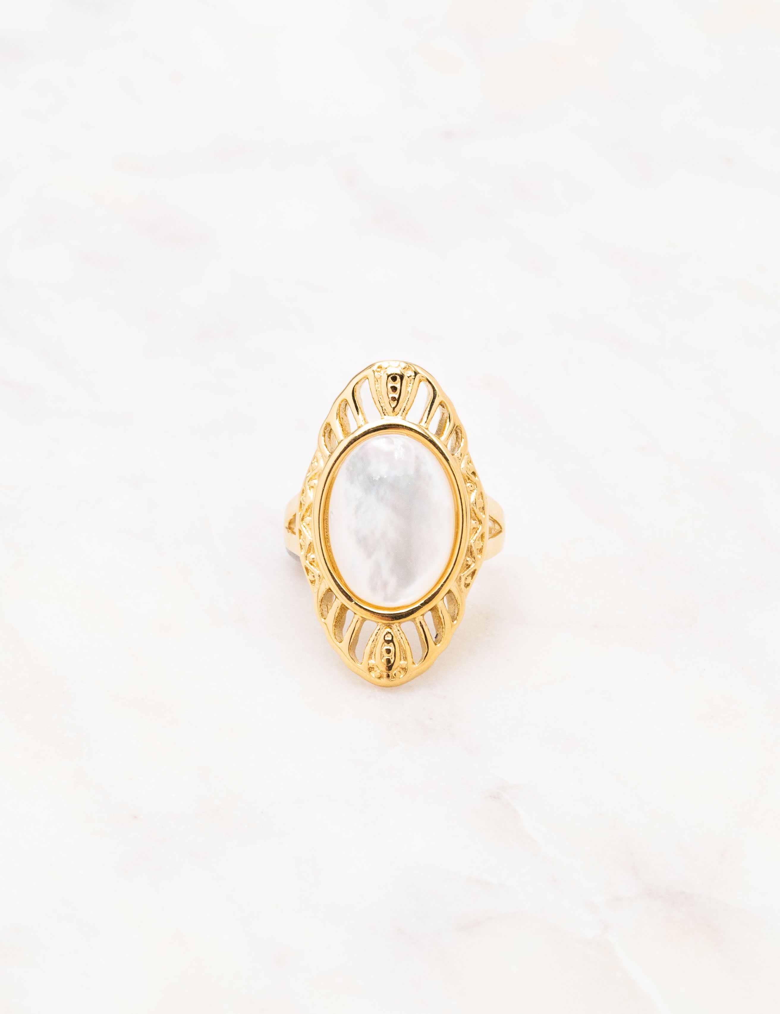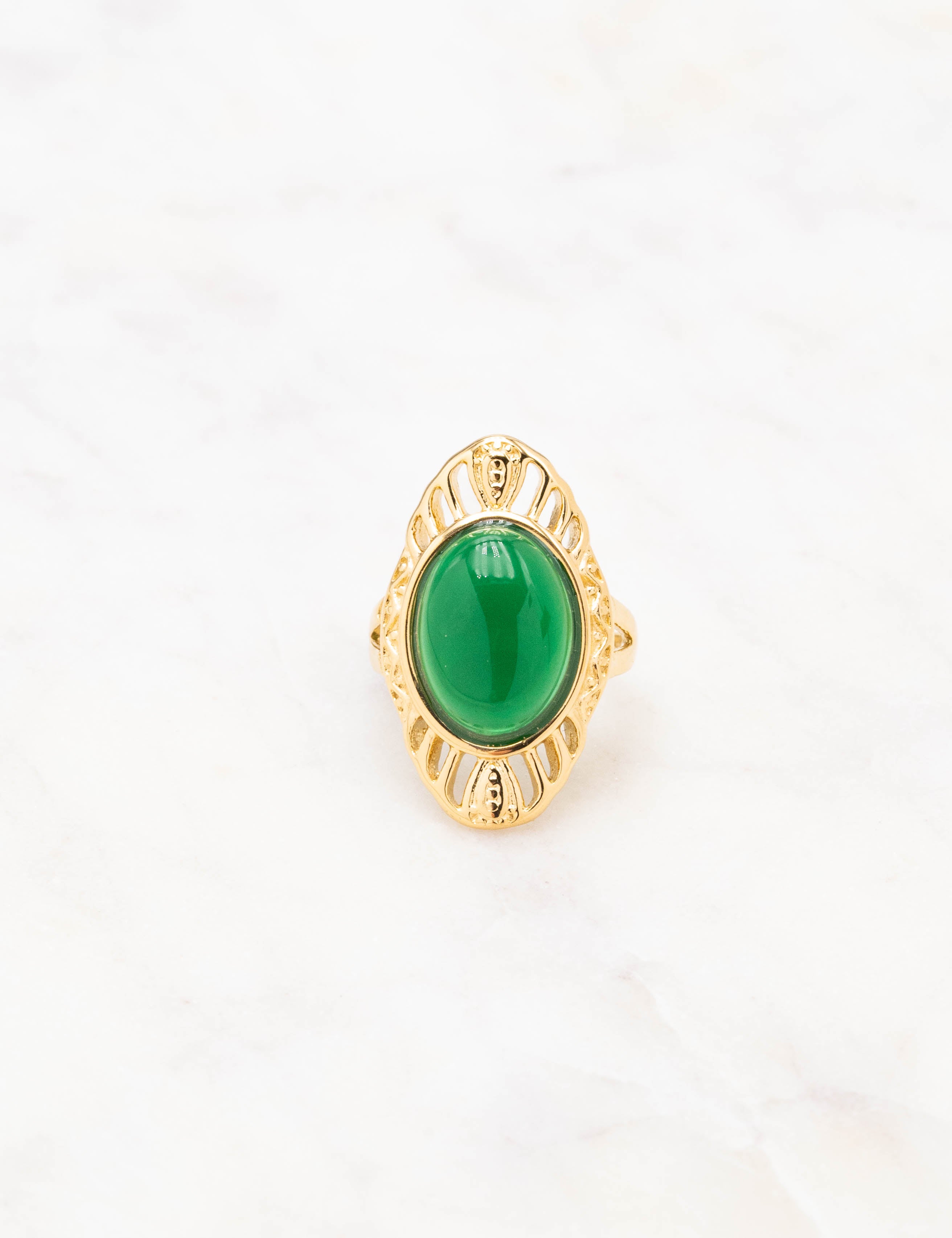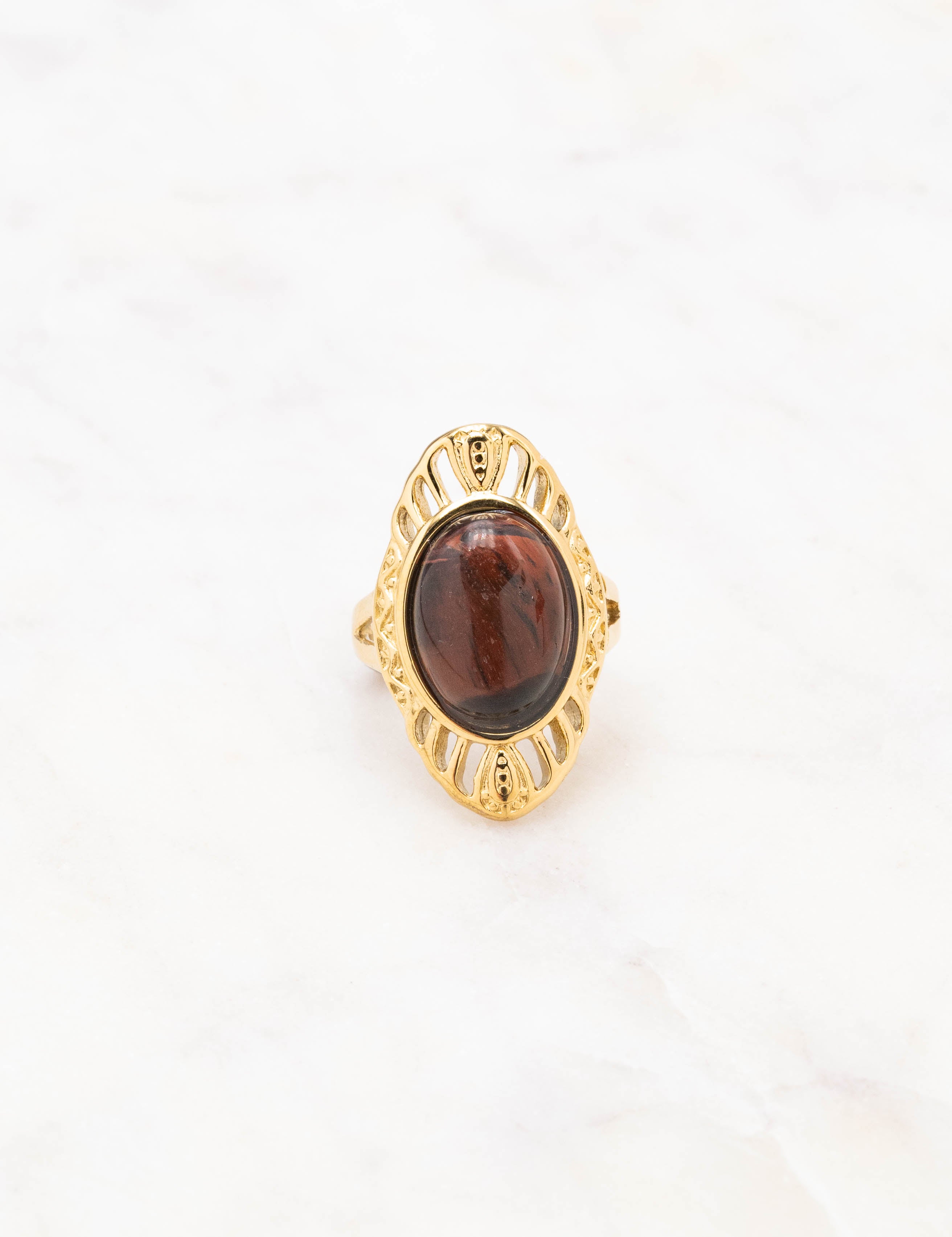 Bague graphique martelée ajustable ajourée, ornée d'une pierre naturelle.