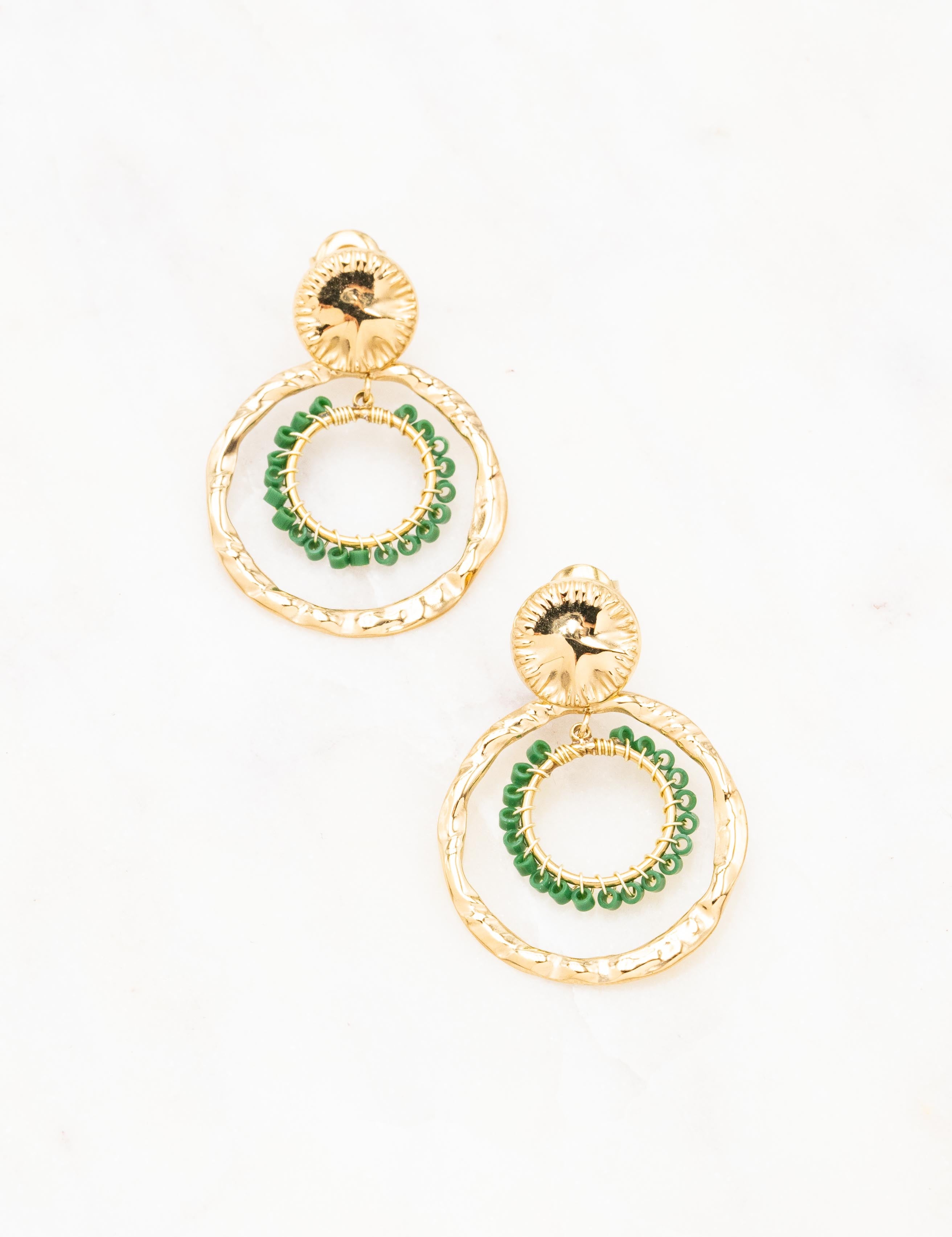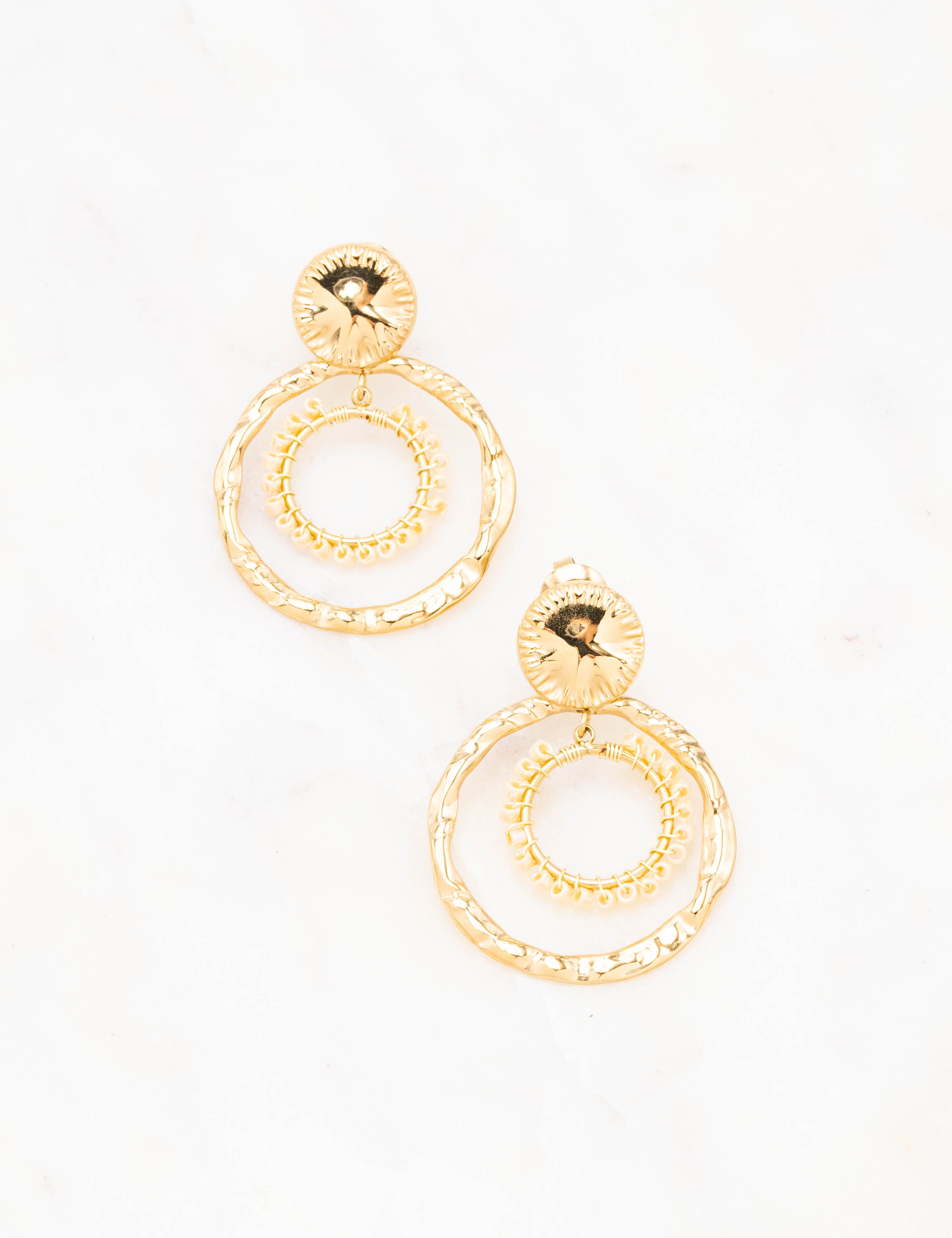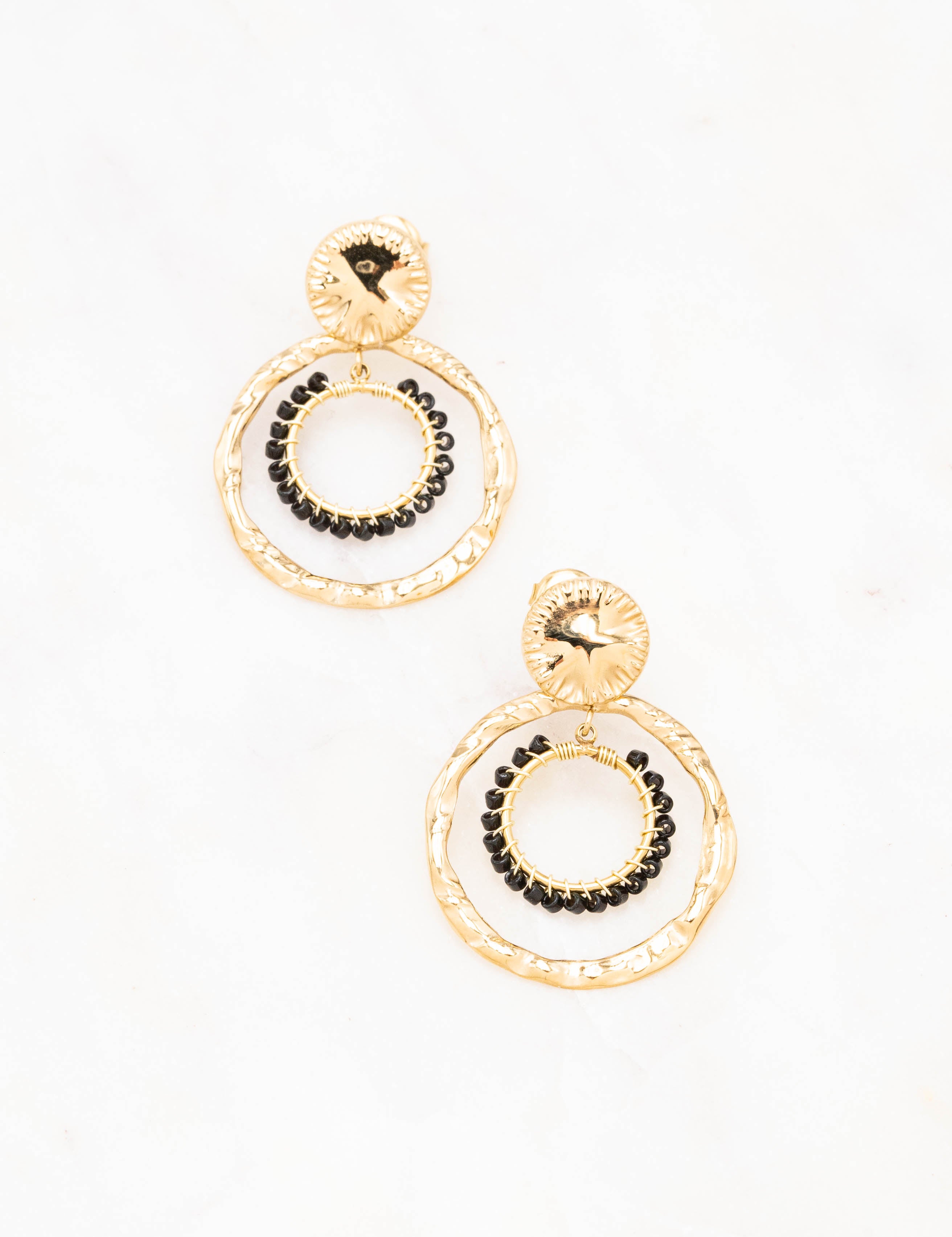 Boucles d'oreilles graphiques à puce composées d'une pièce ronde texturée, d'un anneau martelé et un orné de perles de rocaille.