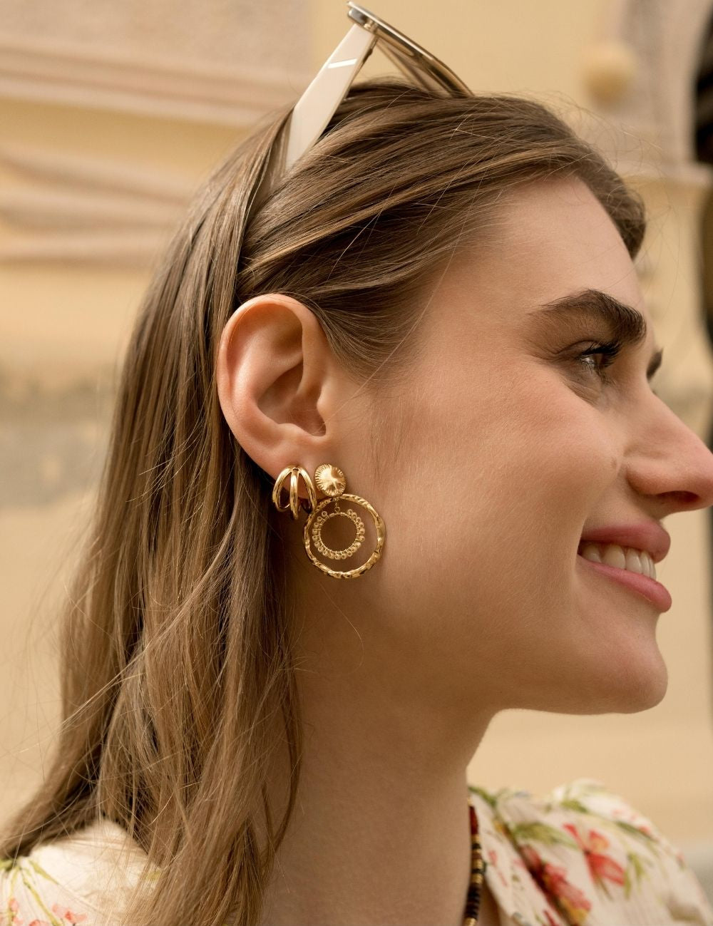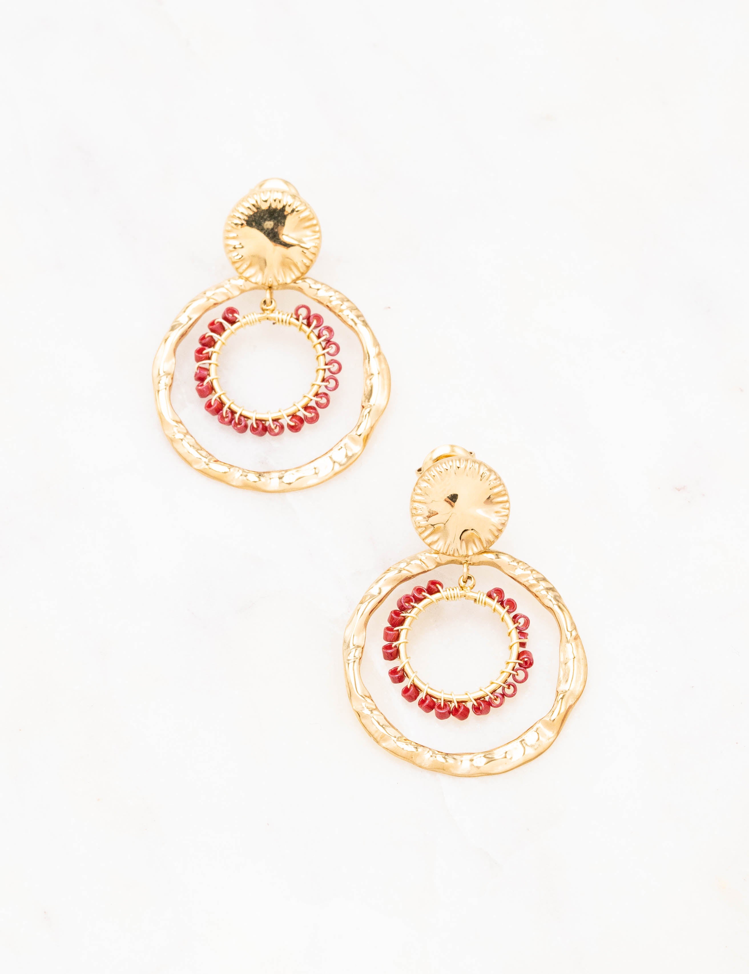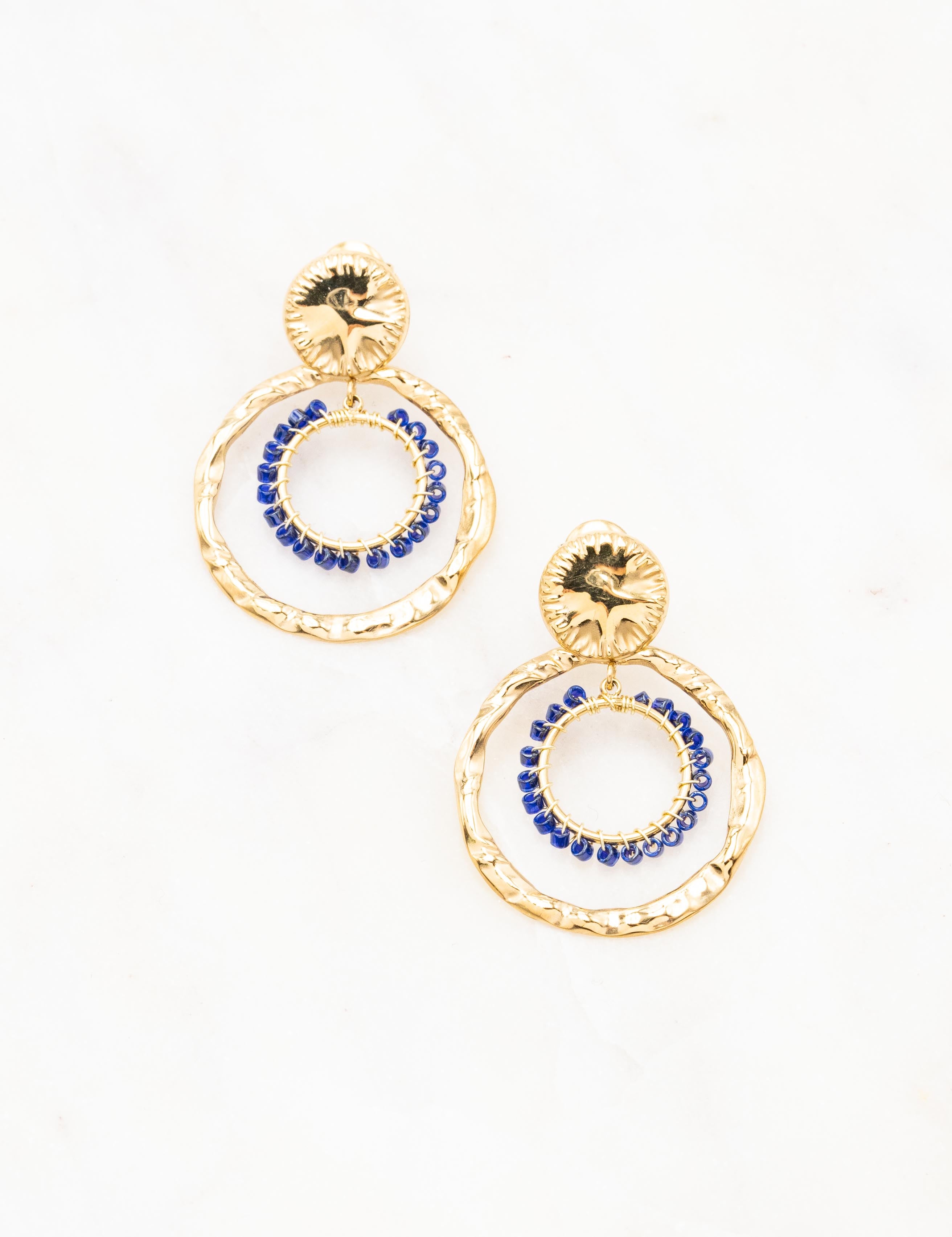 Boucles d'oreilles graphiques à puce composées d'une pièce ronde texturée, d'un anneau martelé et un orné de perles de rocaille.