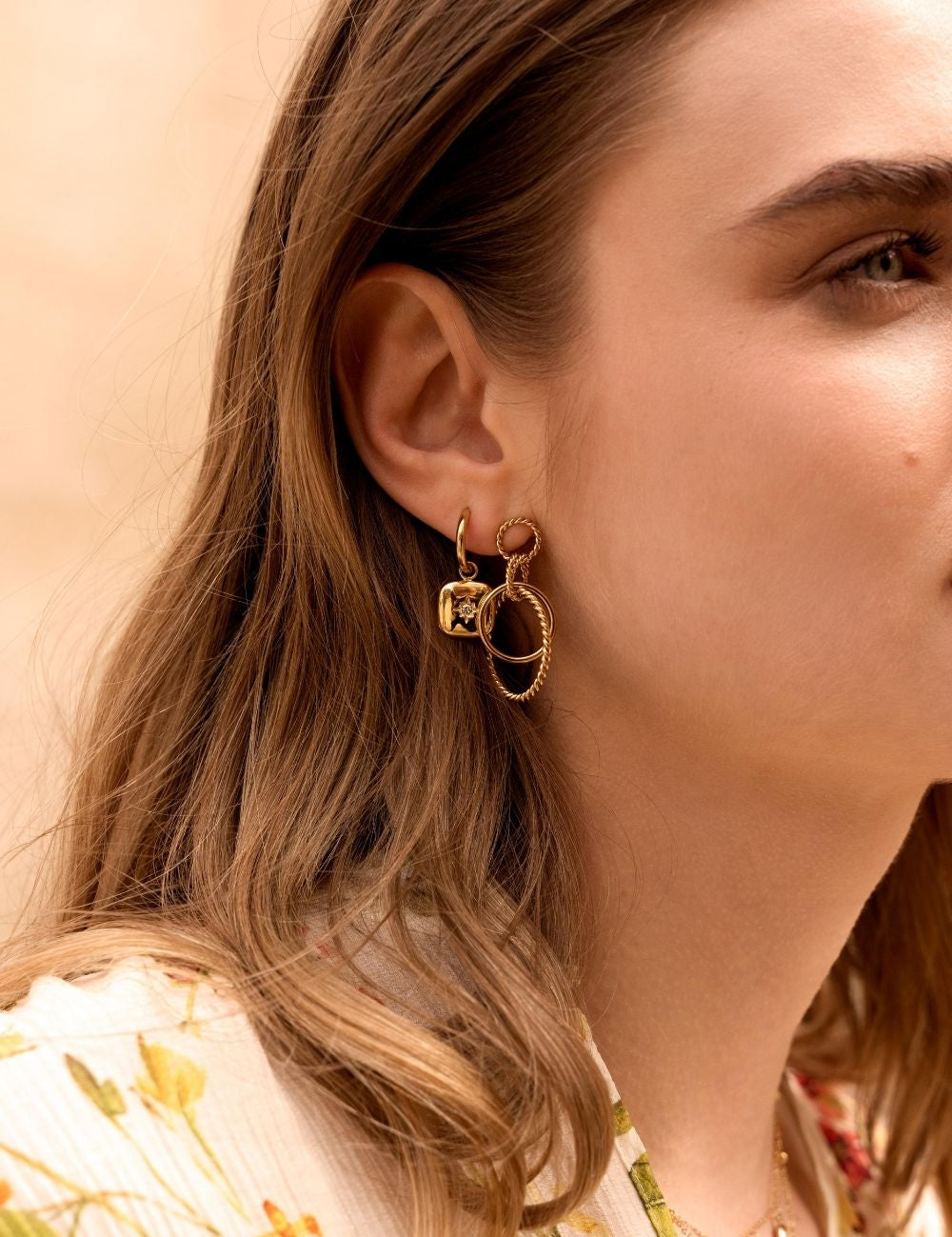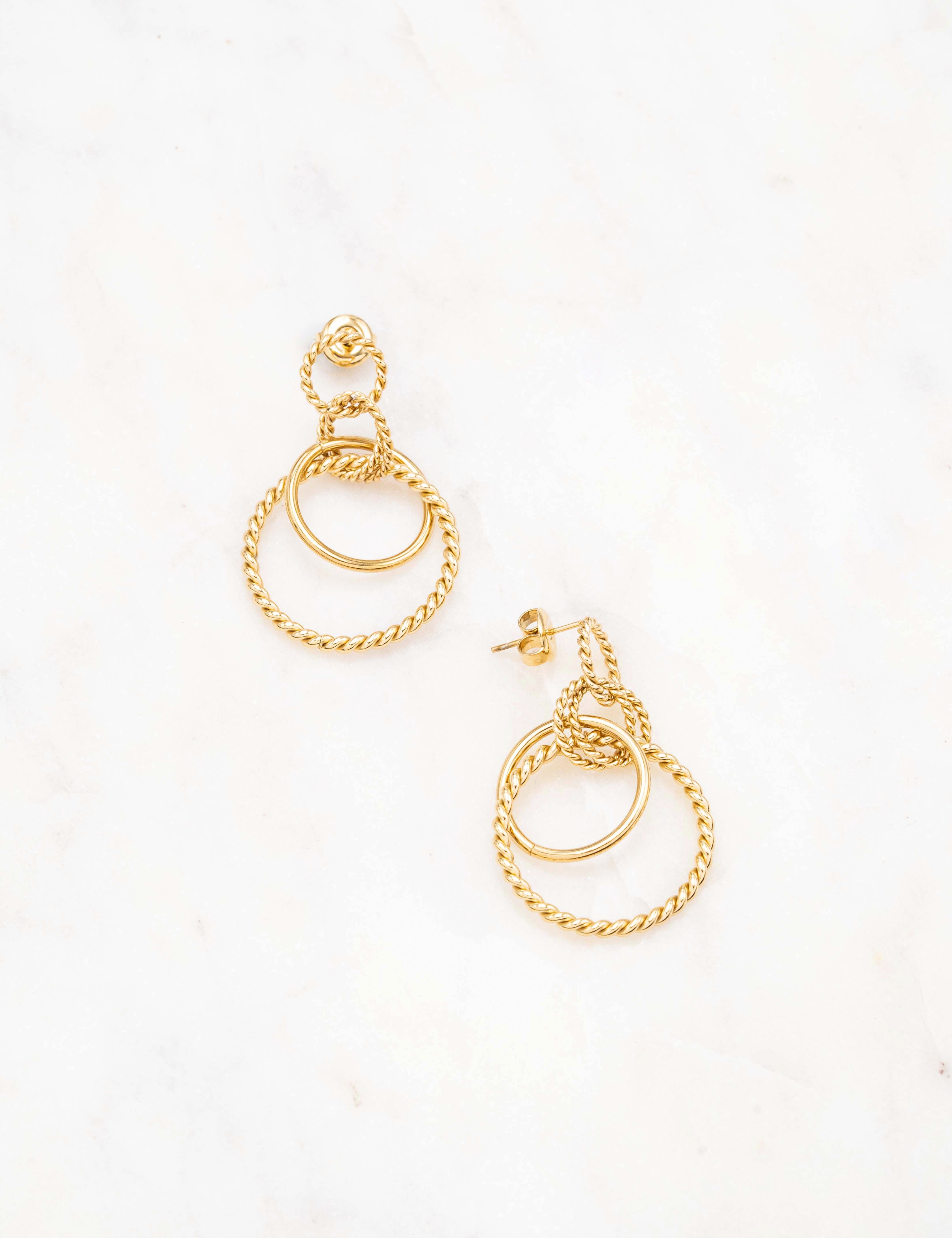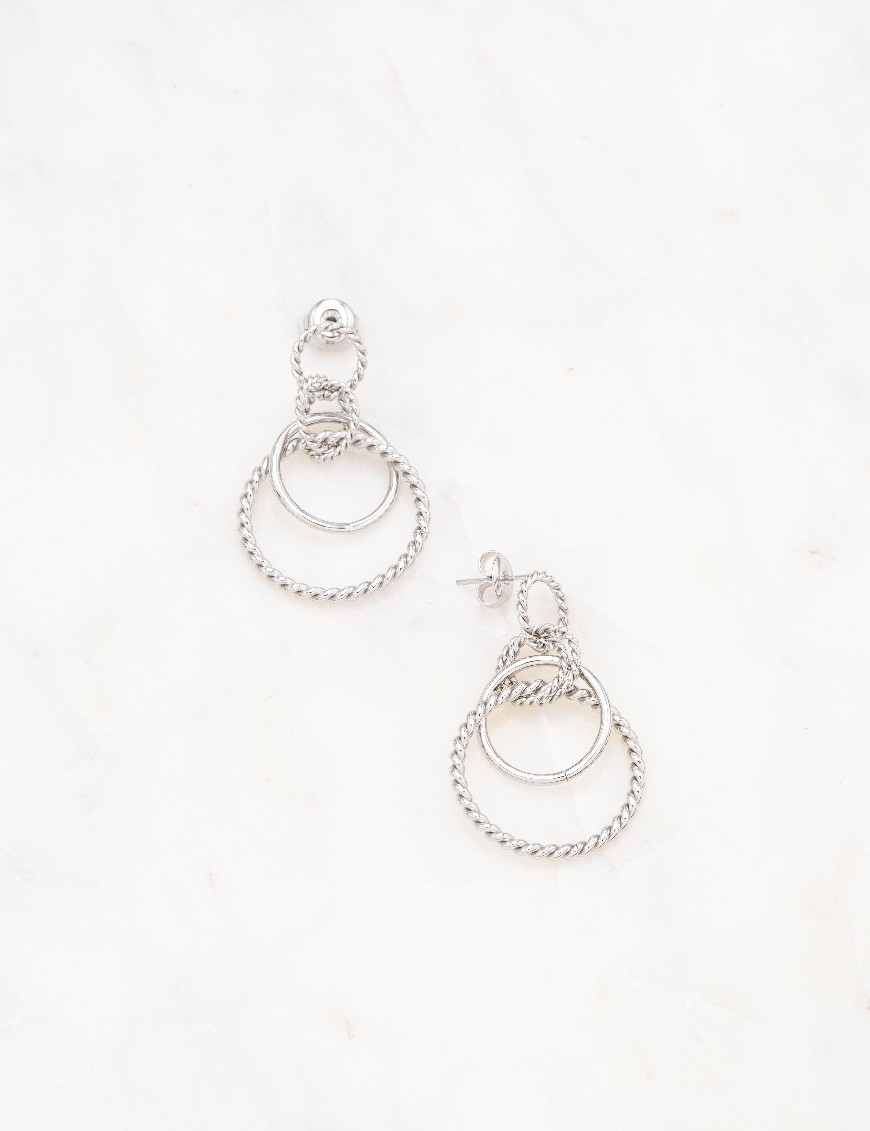 Boucles d'oreilles graphiques type créoles à puce composées d'un jeu de quatre anneaux torsadés et d'un anneau lisse.