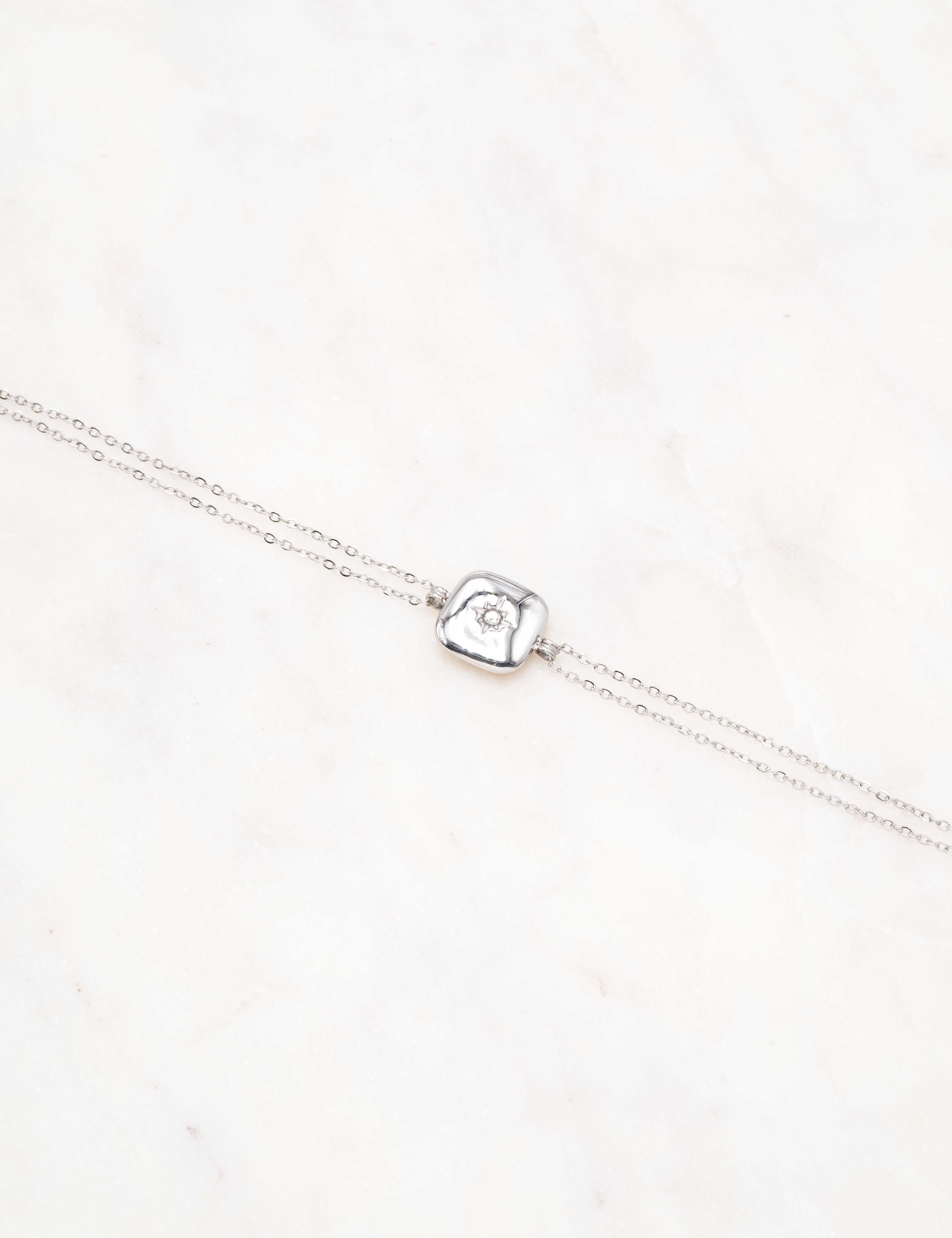 Bracelet réglable sur chaîne composé d'une pièce carrée ornée d'une étoile et d'un strass.