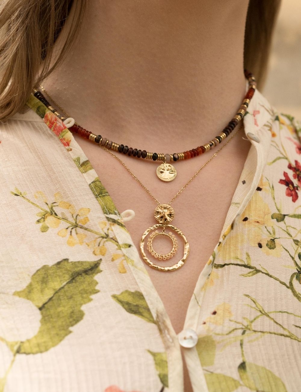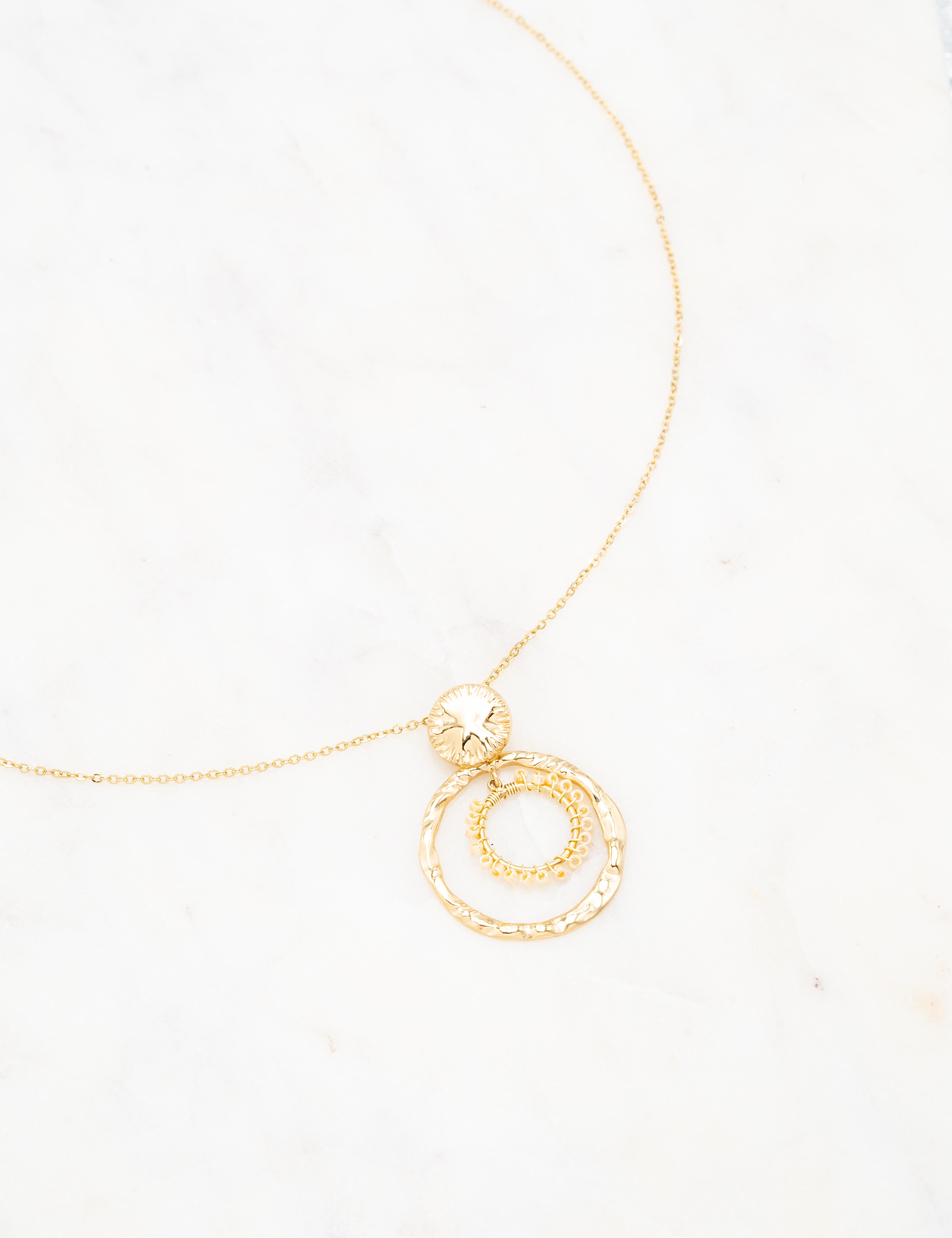 Collier réglable sur chaîne composé d'une pièce ronde texturée, d'un anneau martelé et un orné de pates de verre type rocaille.