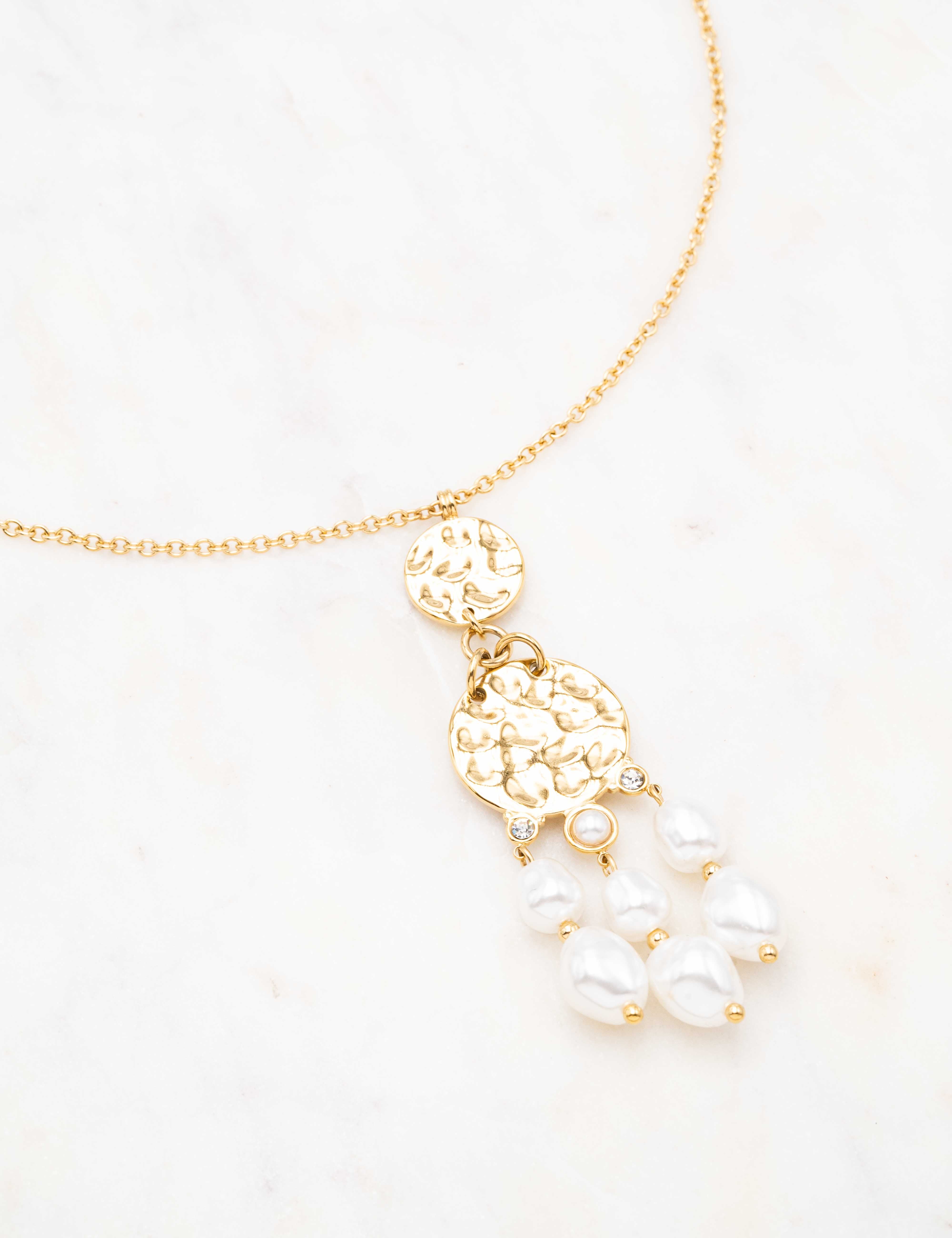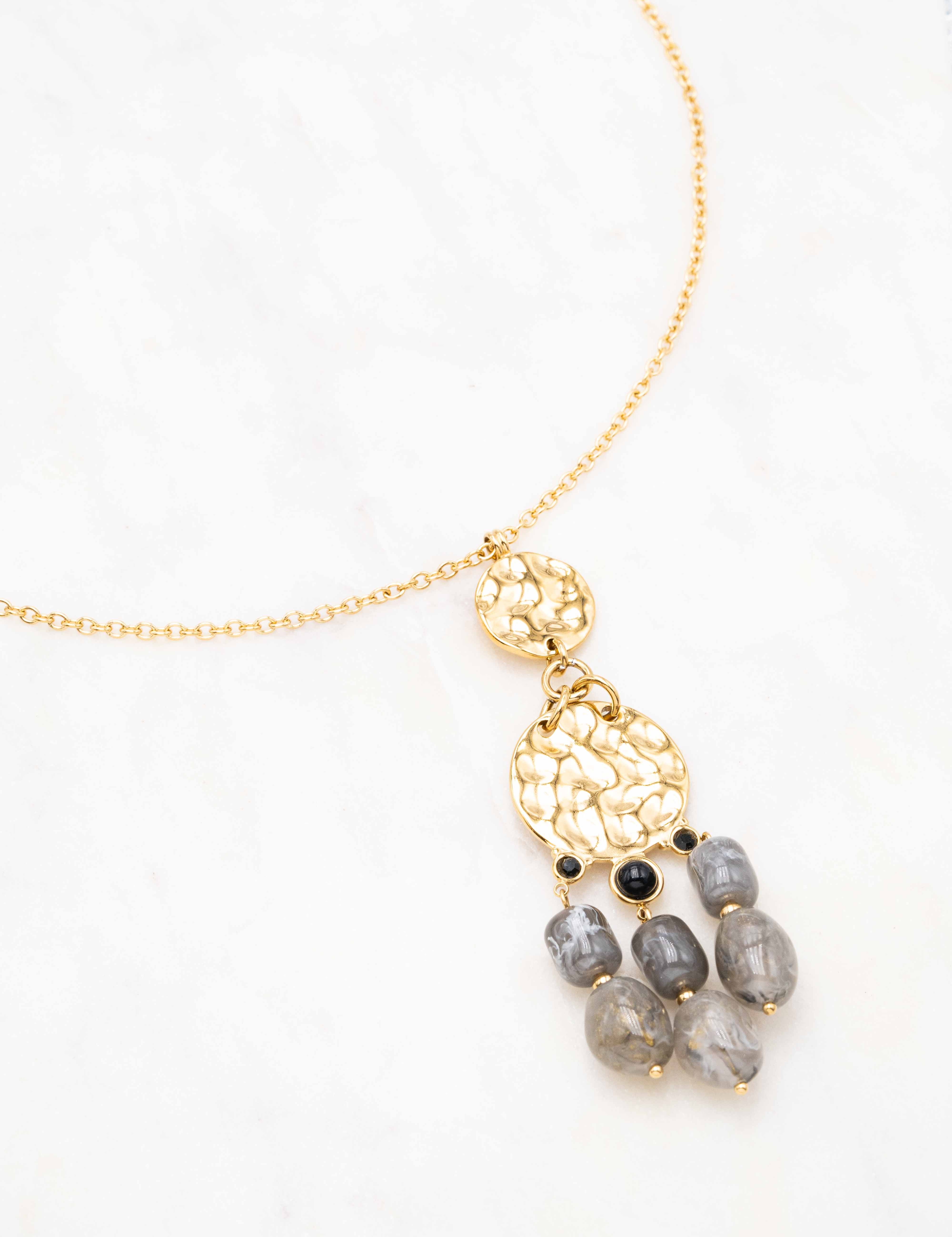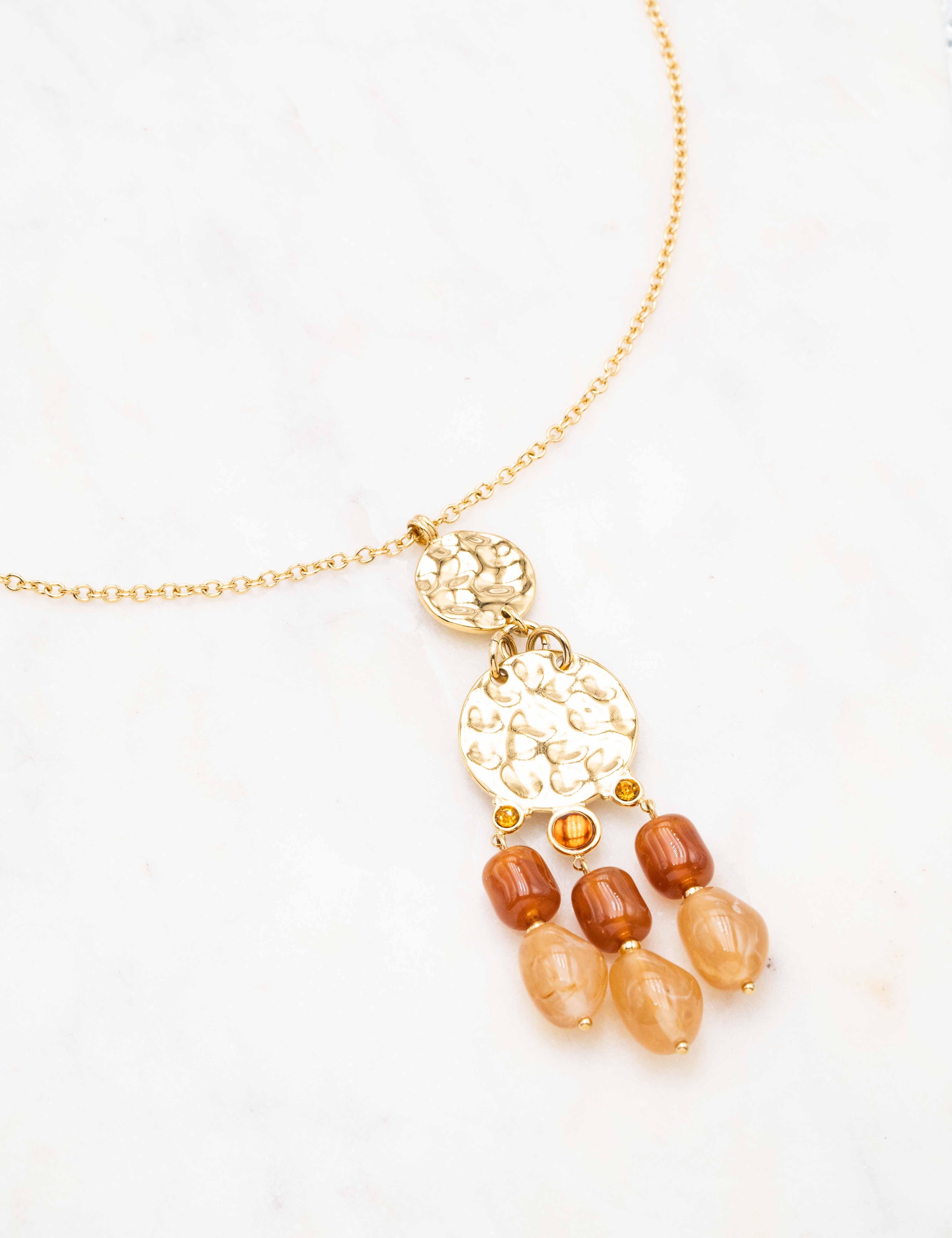Collier réglable sur chaîne composé d'une pièce martelée embellie de strass et d'un pendentif graphique orné de perles en résine.