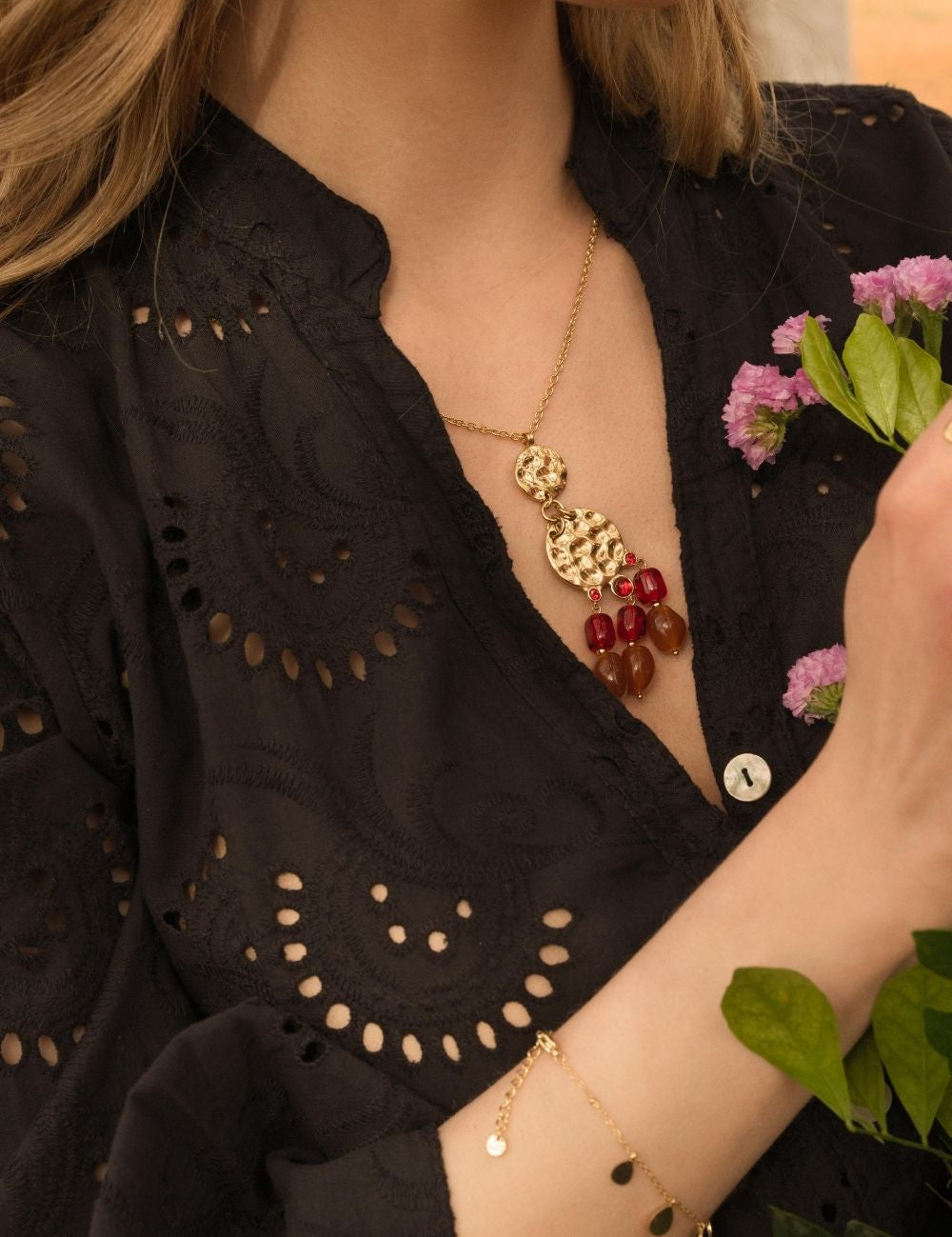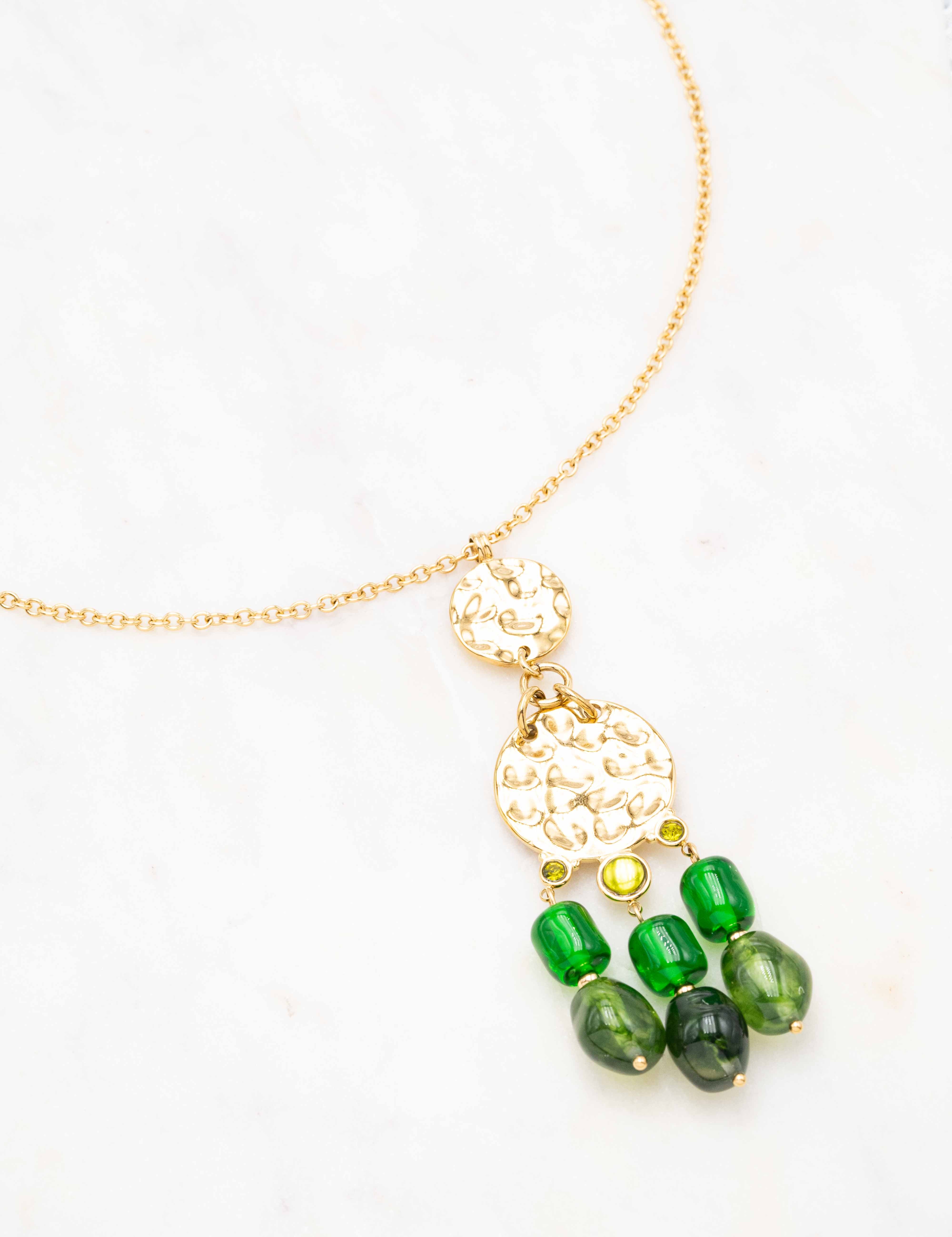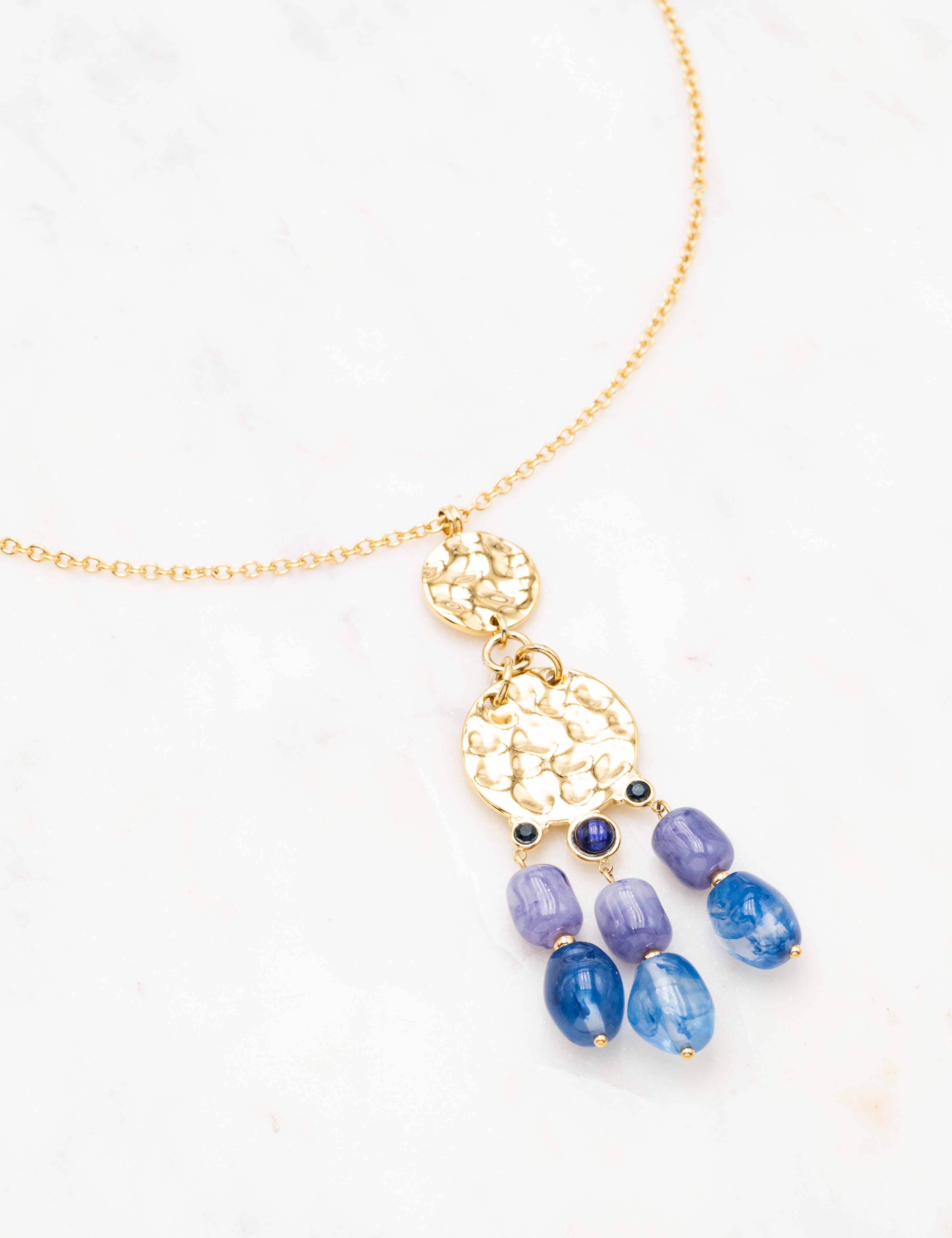 Collier réglable sur chaîne composé d'une pièce martelée embellie de strass et d'un pendentif graphique orné de perles en résine.