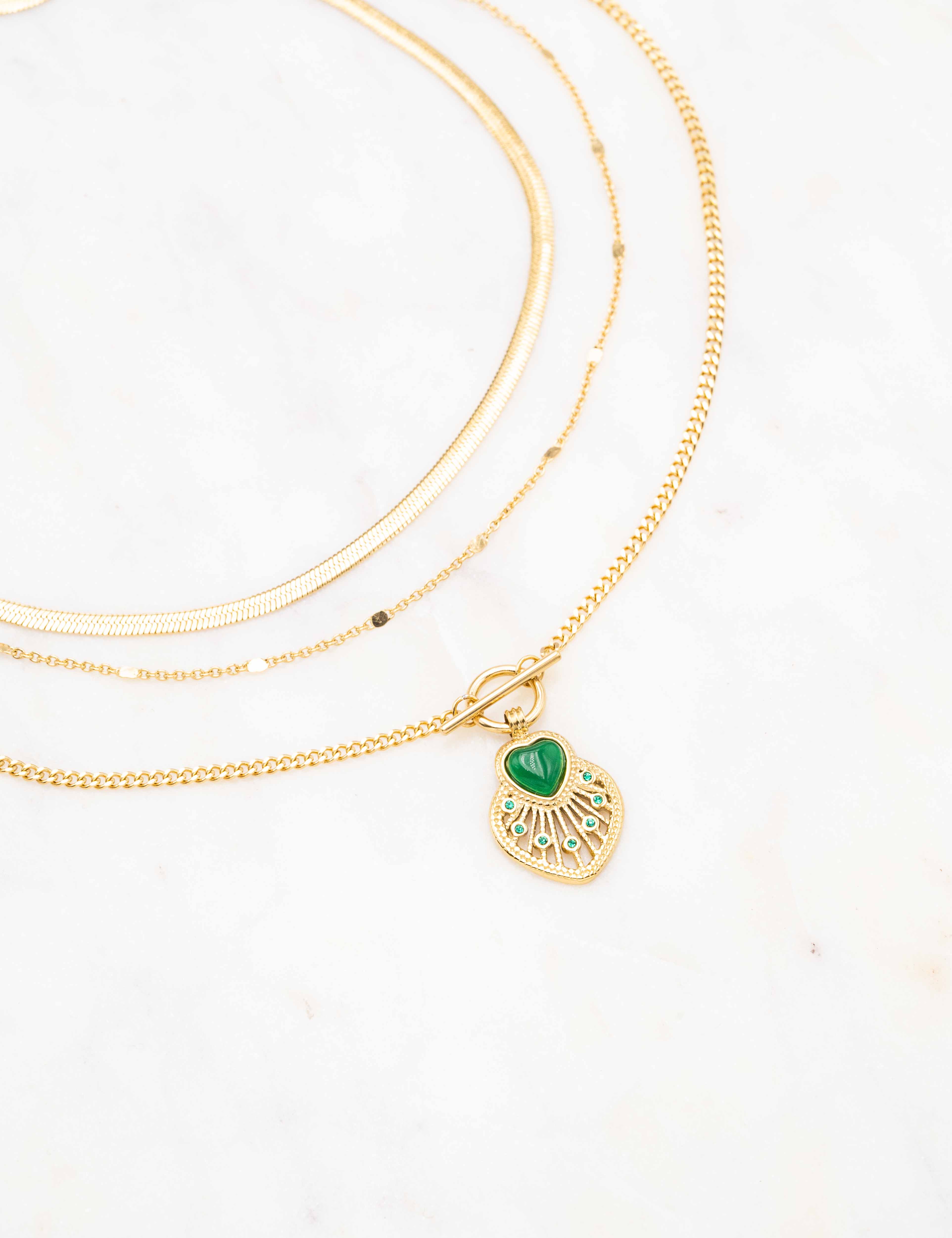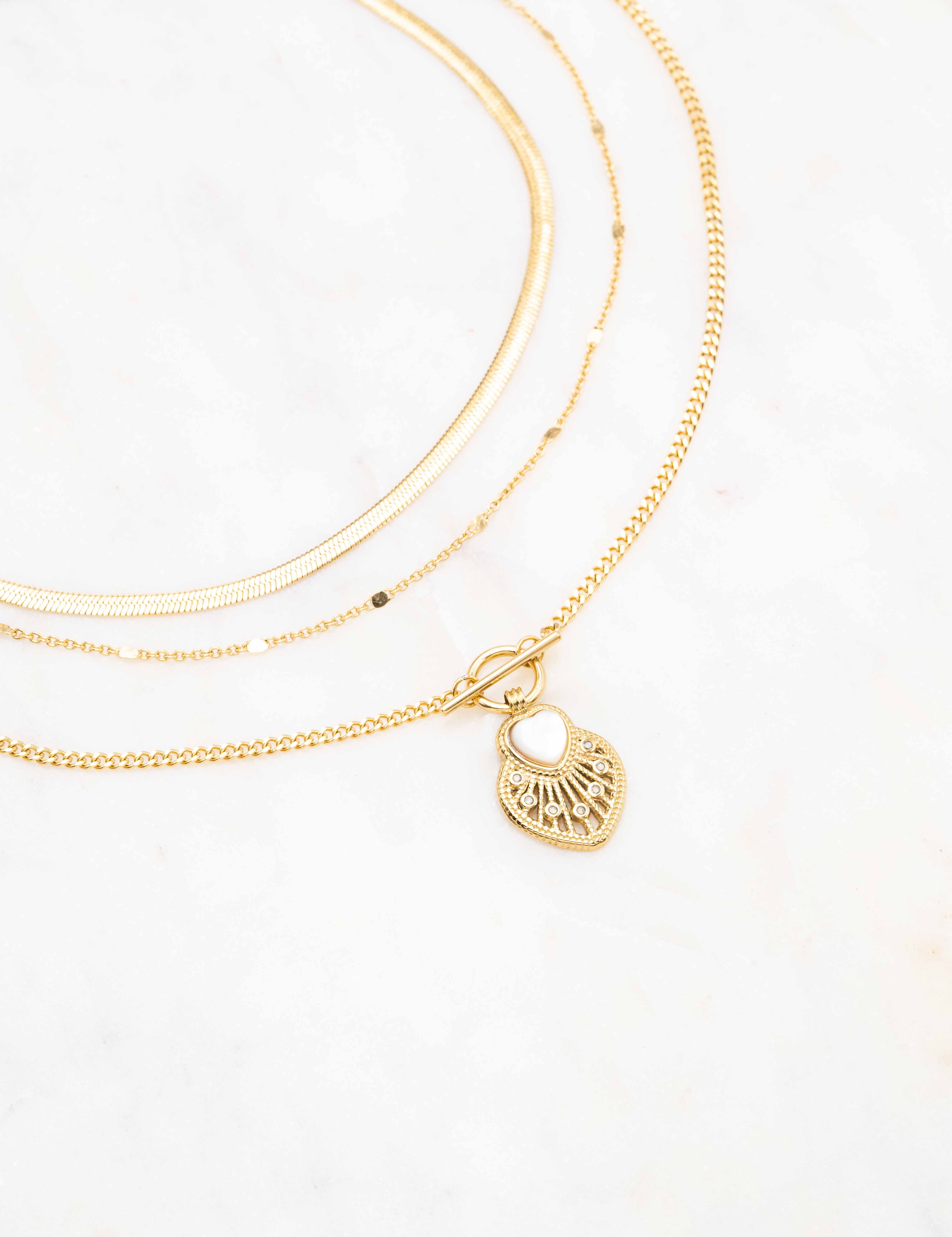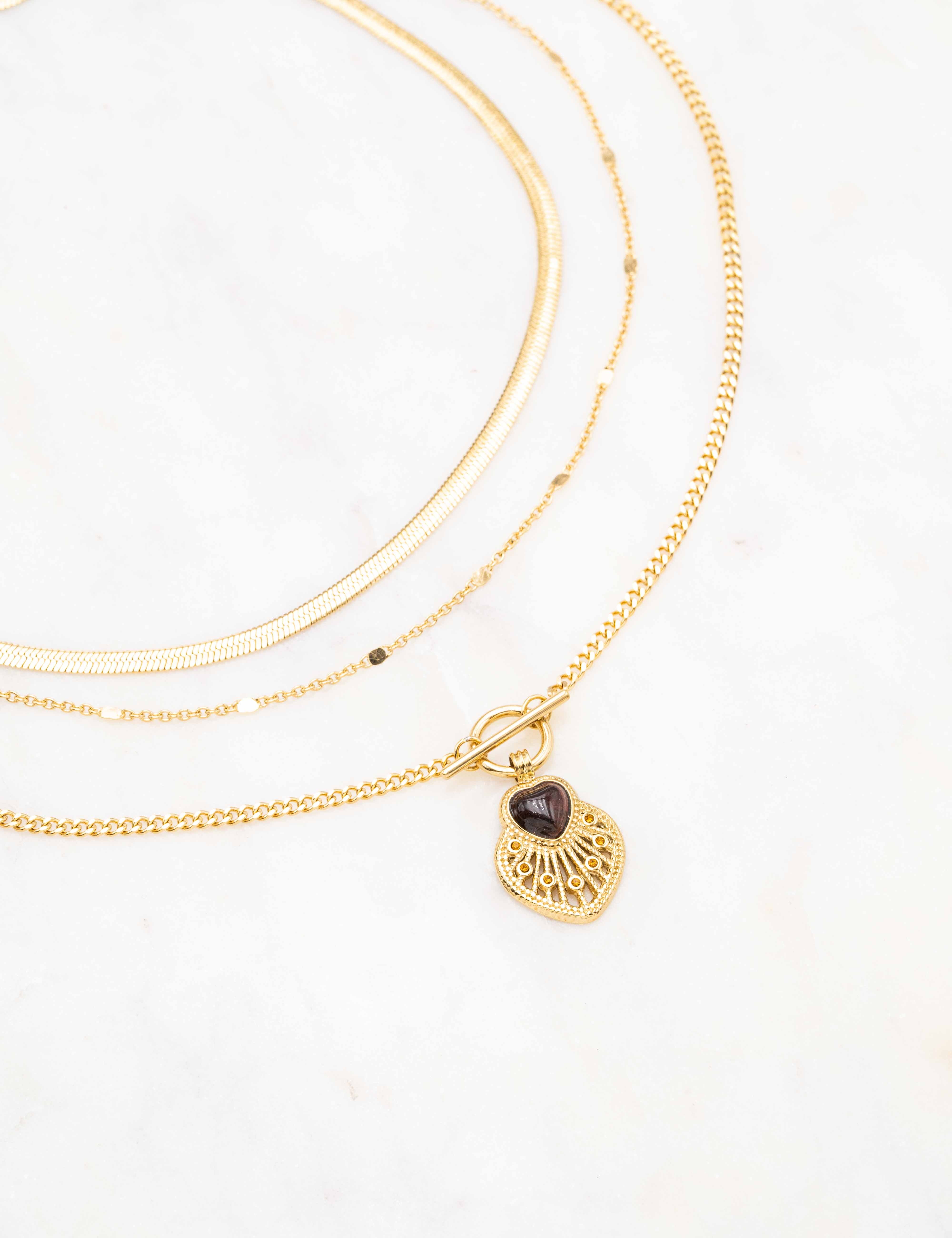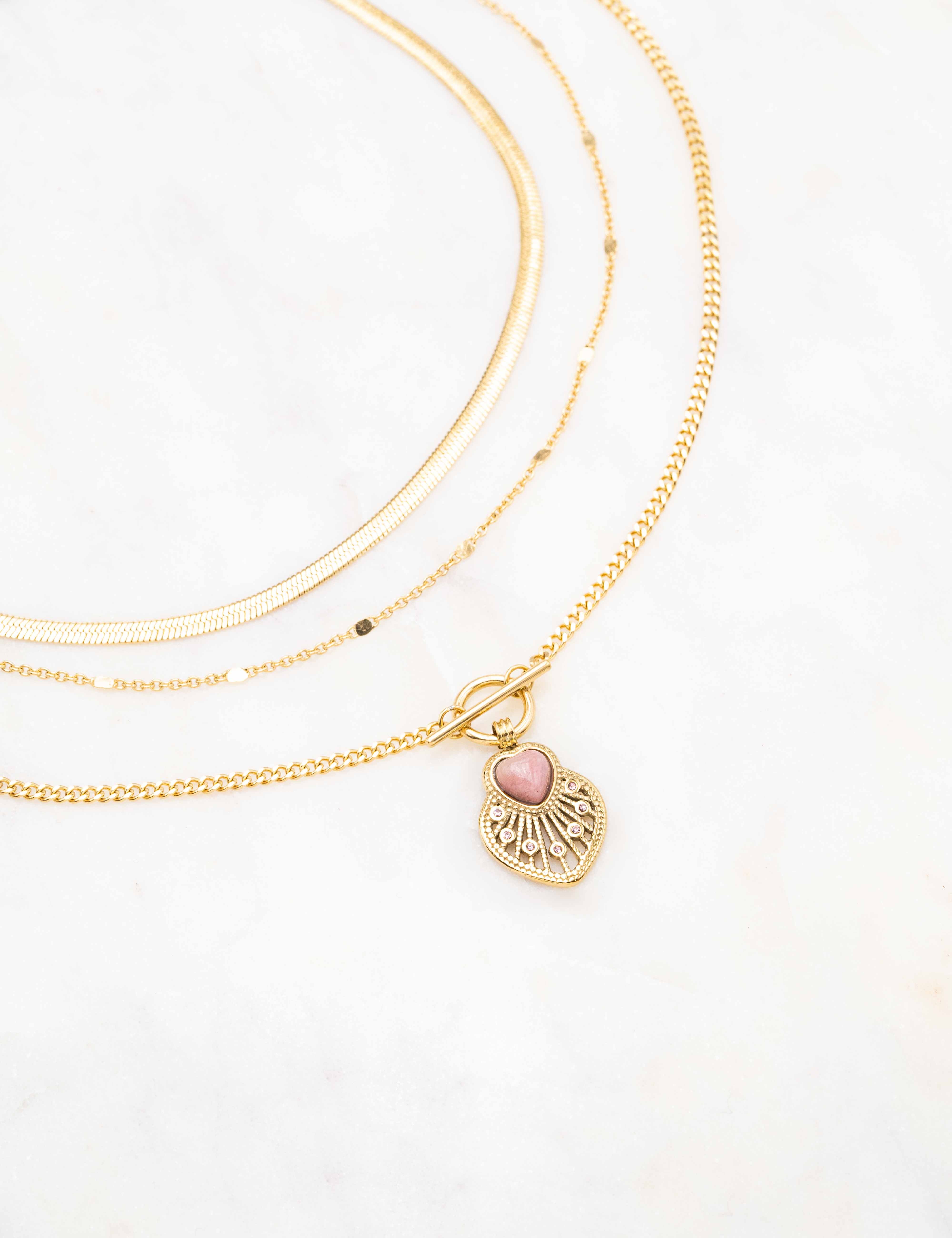 Collier réglable sur chaîne triple rangs composé d'un pendentif coeur ajouré embelli d'une pierre naturelle en forme de coeur et de strass.