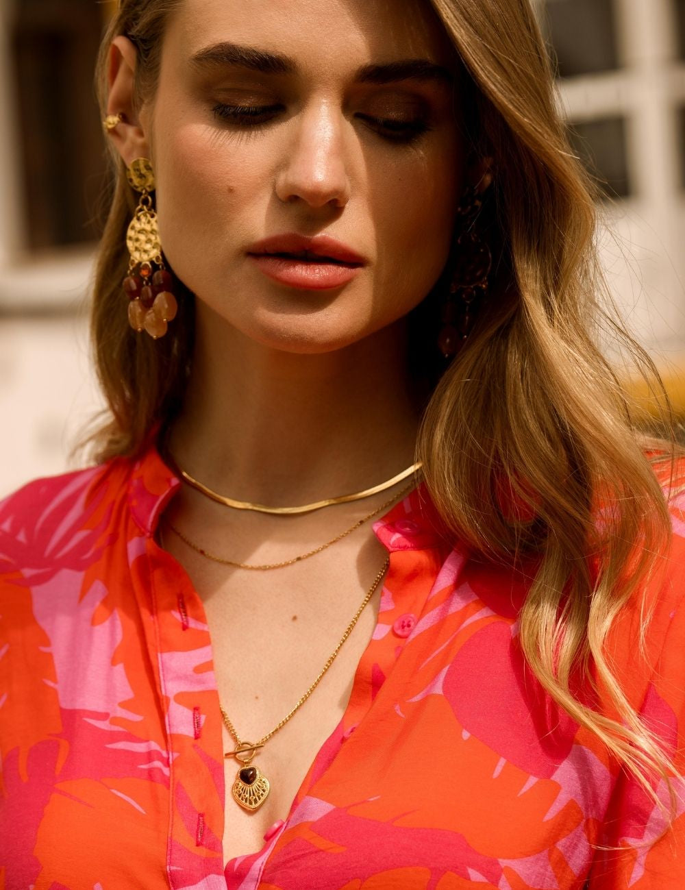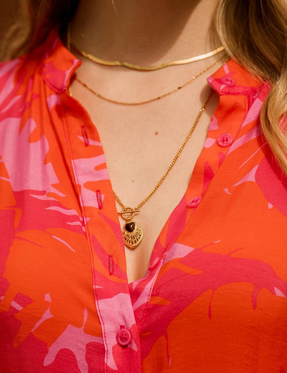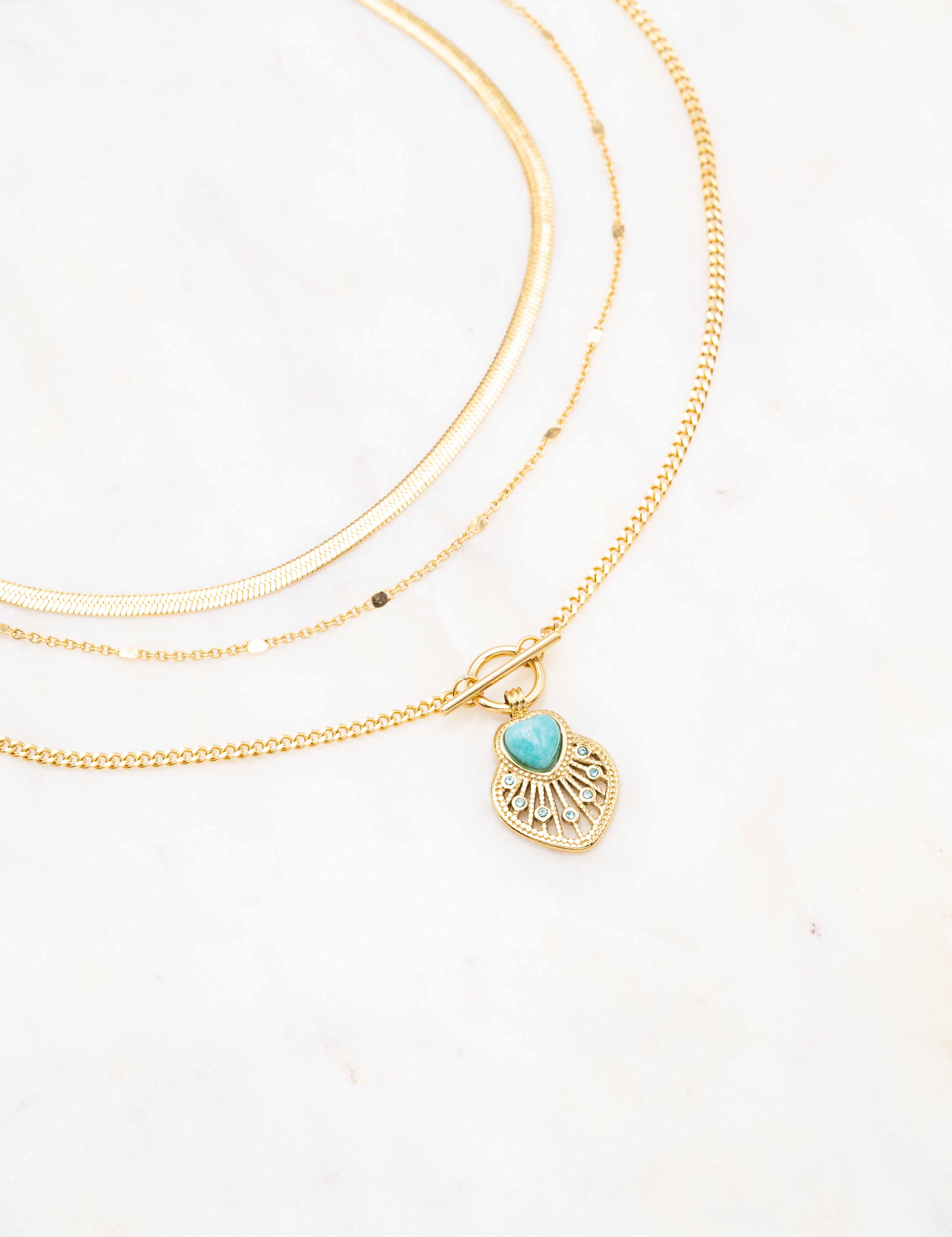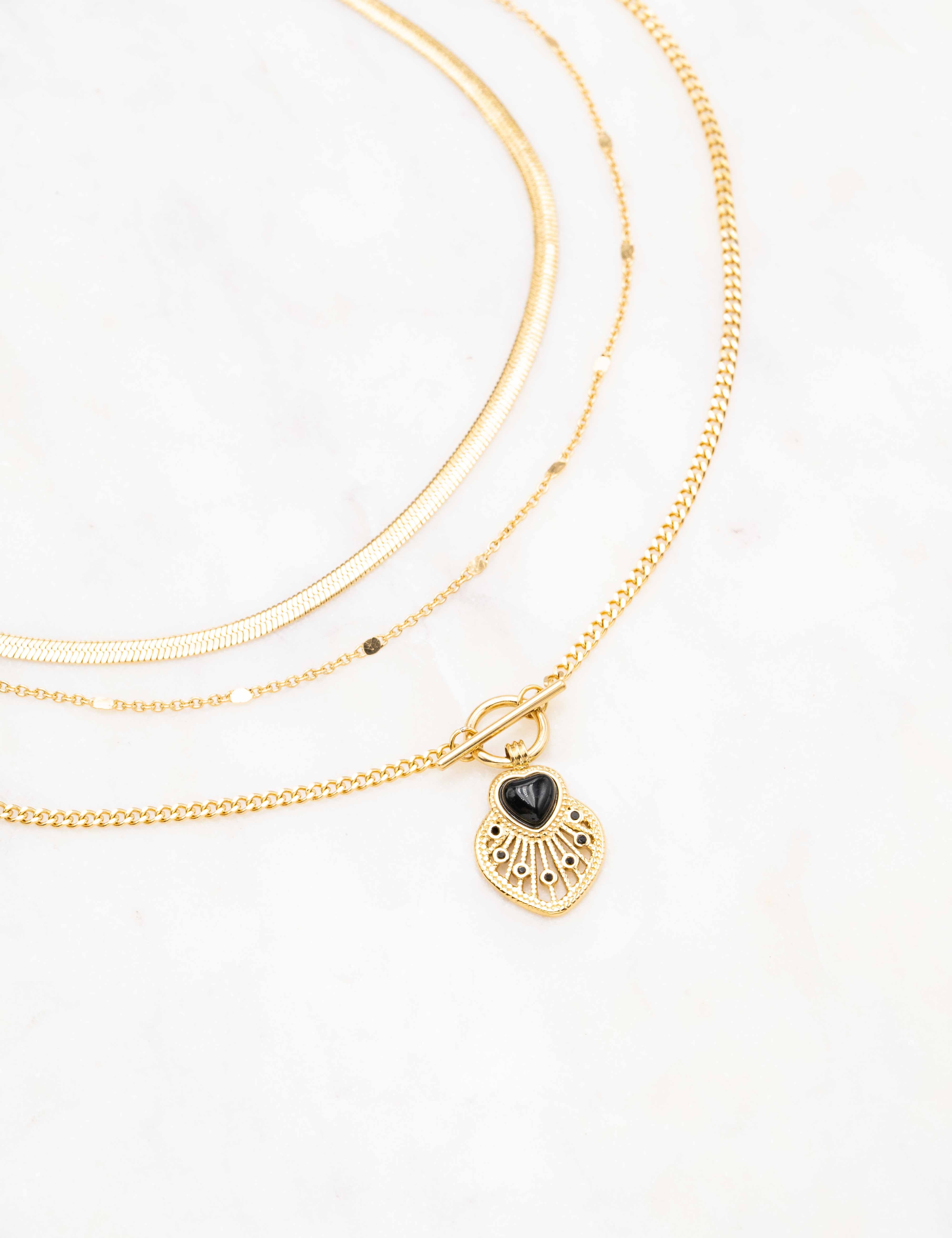Collier réglable sur chaîne triple rangs composé d'un pendentif coeur ajouré embelli d'une pierre naturelle en forme de coeur et de strass.