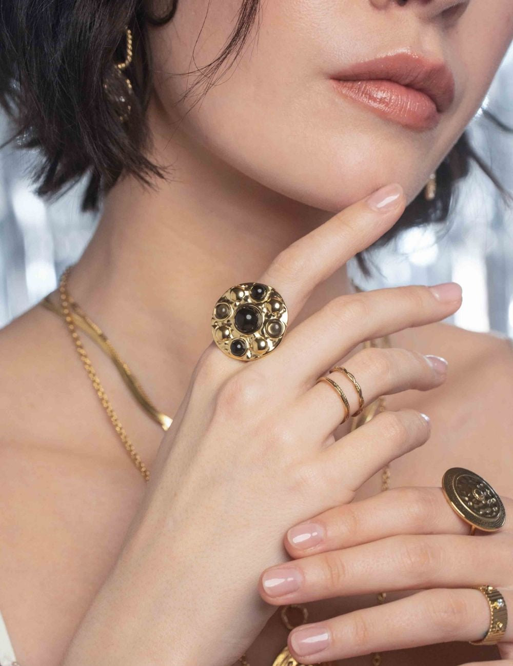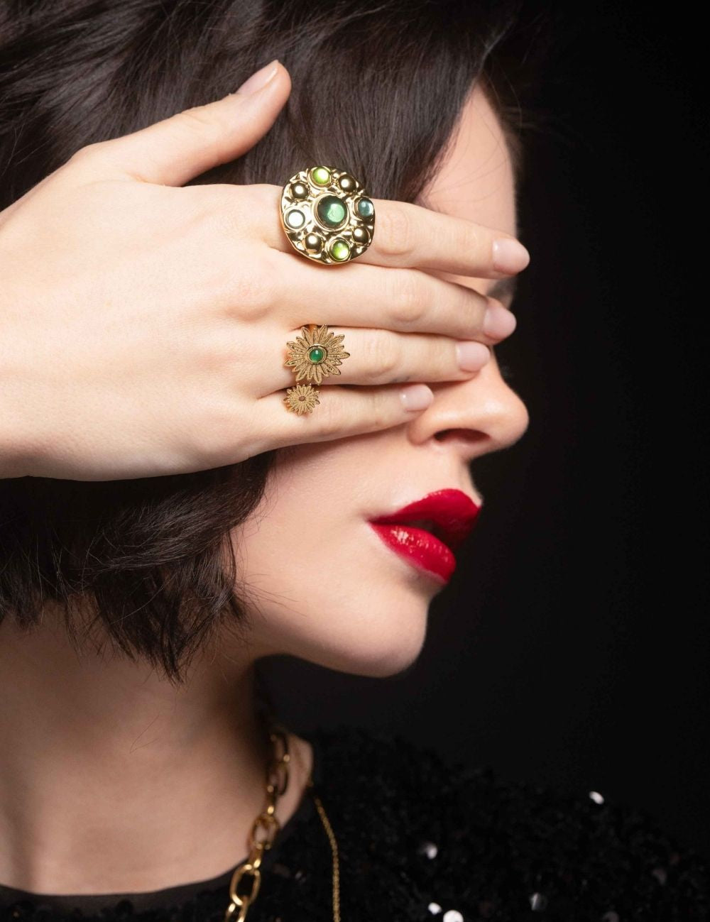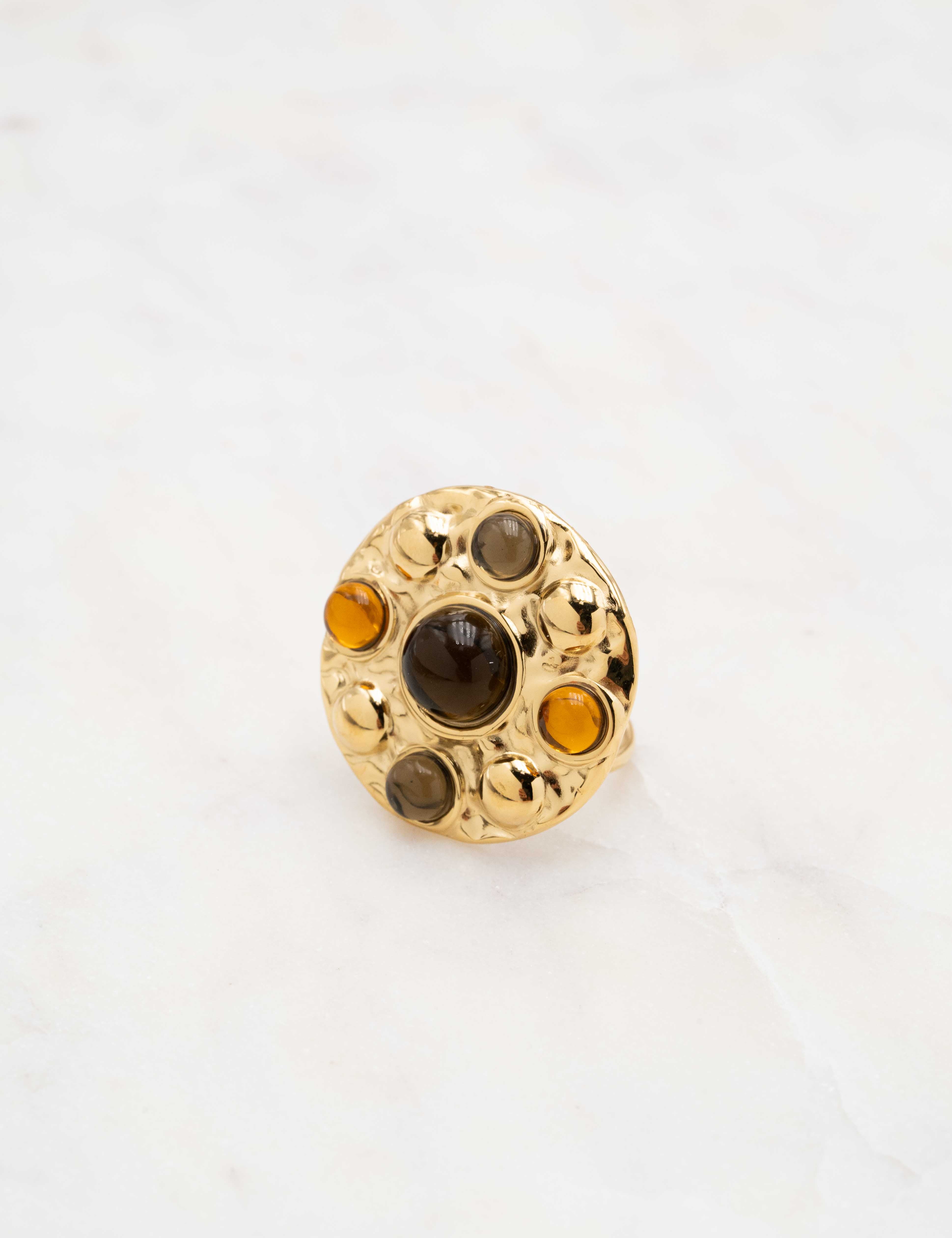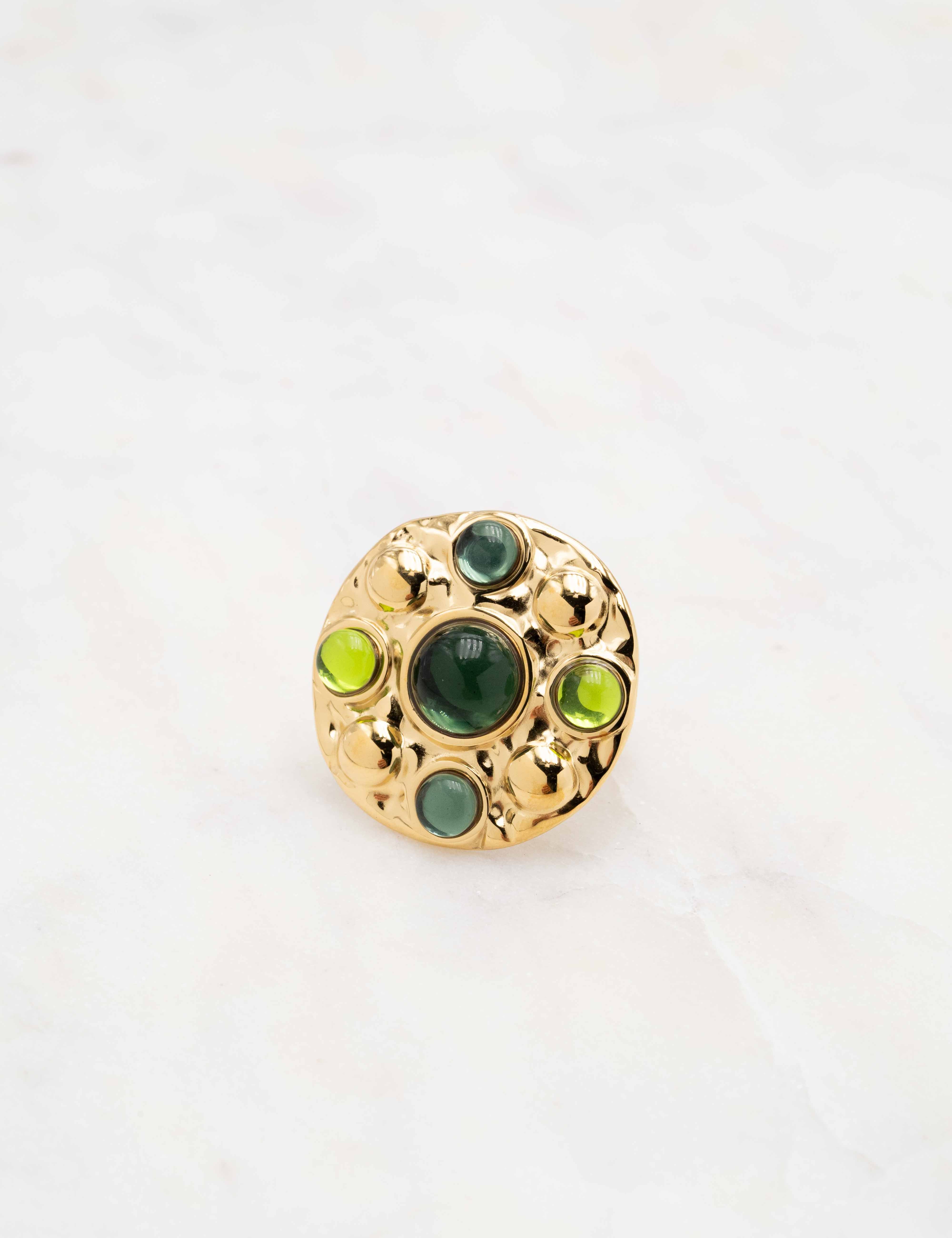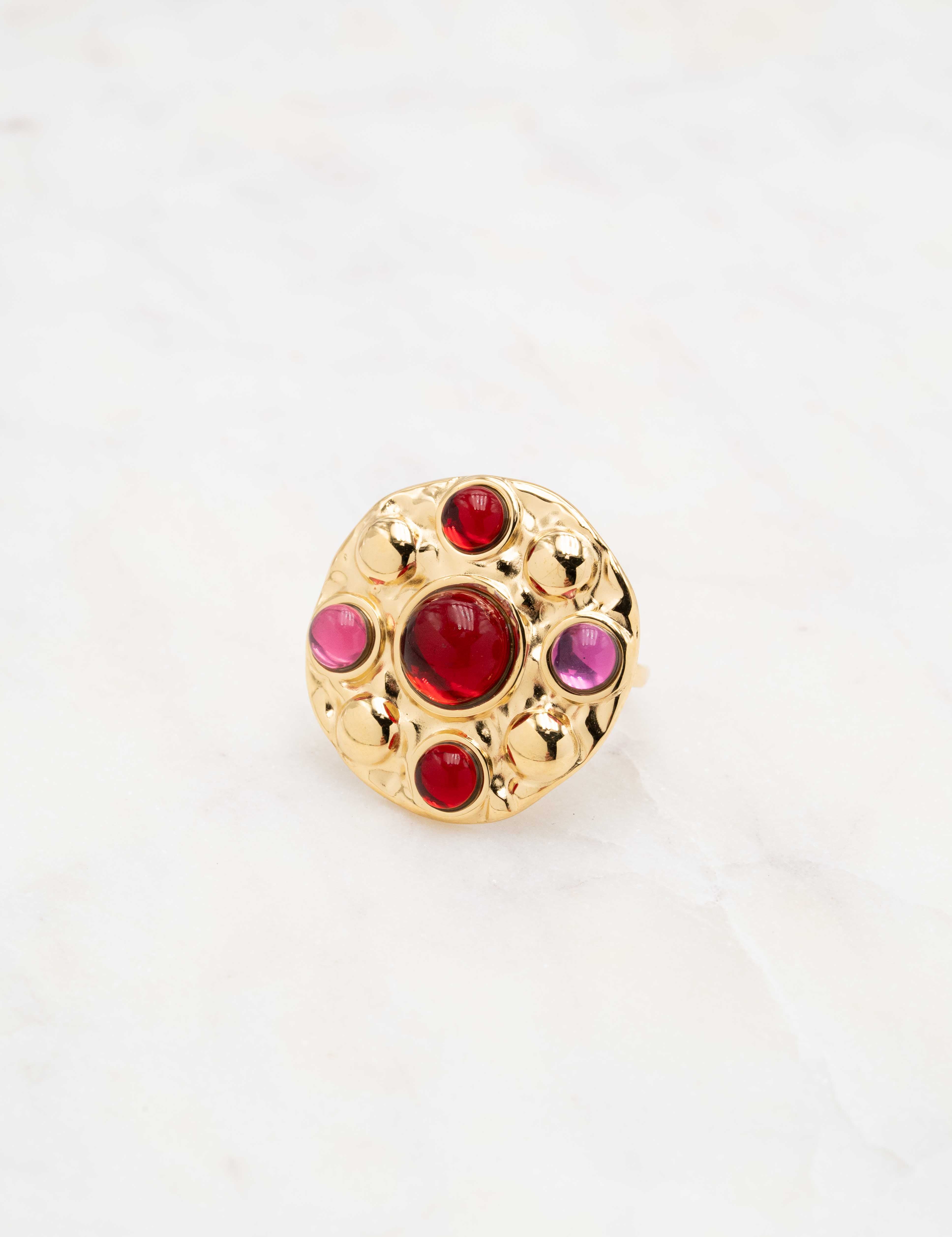 Bague ajustable composée d'une pièce texturée ornée de pièces colorées style cabochon en pâte de verre.
