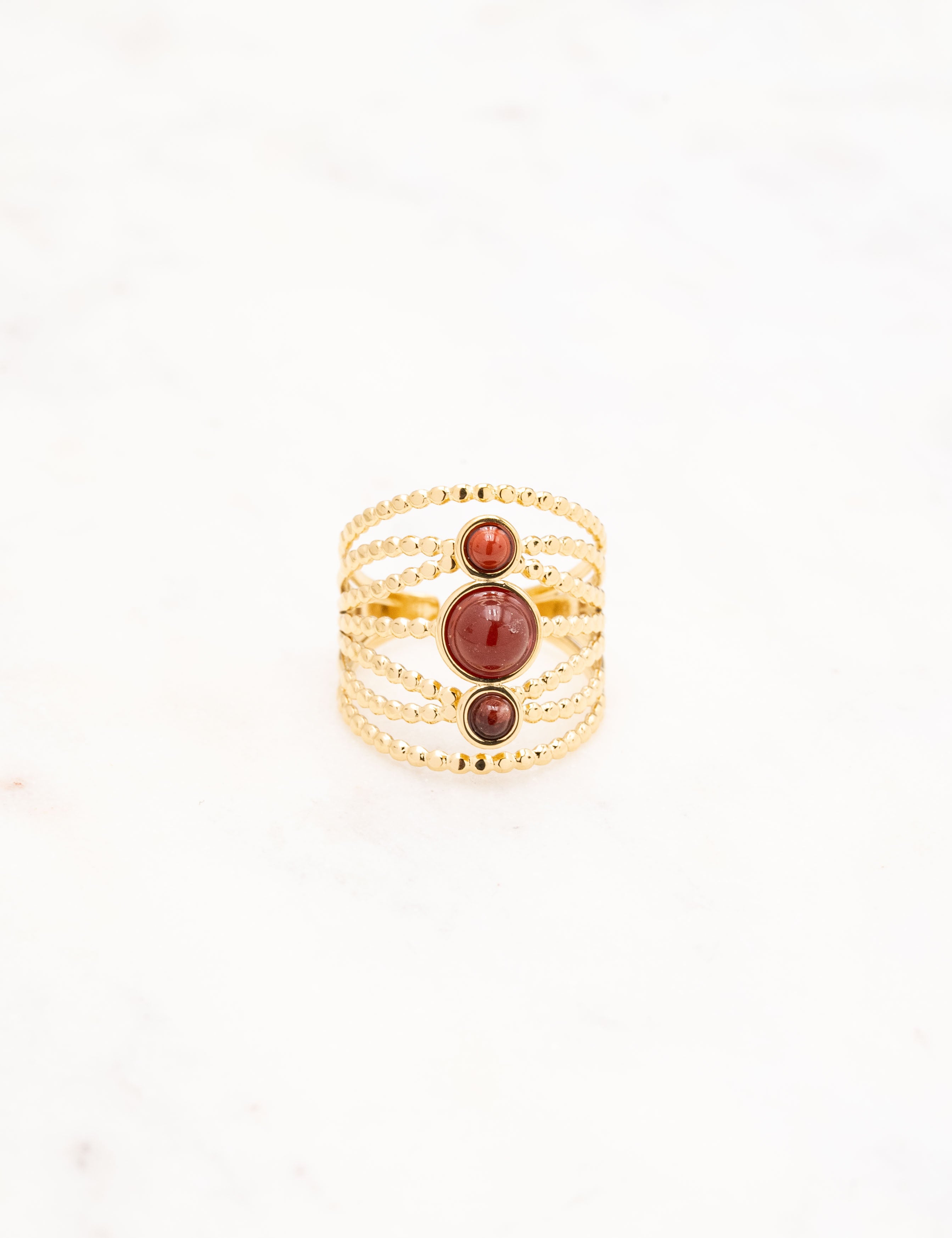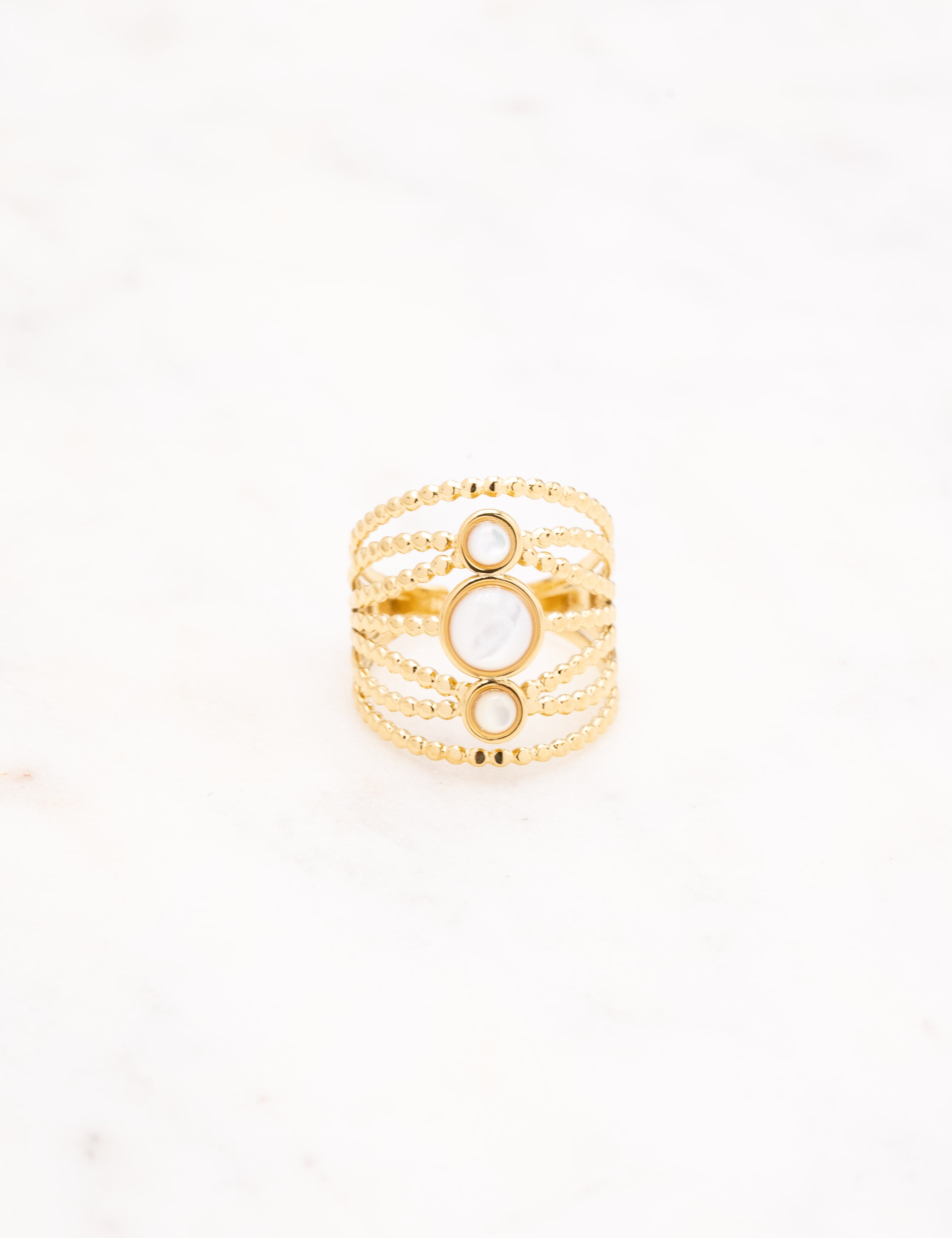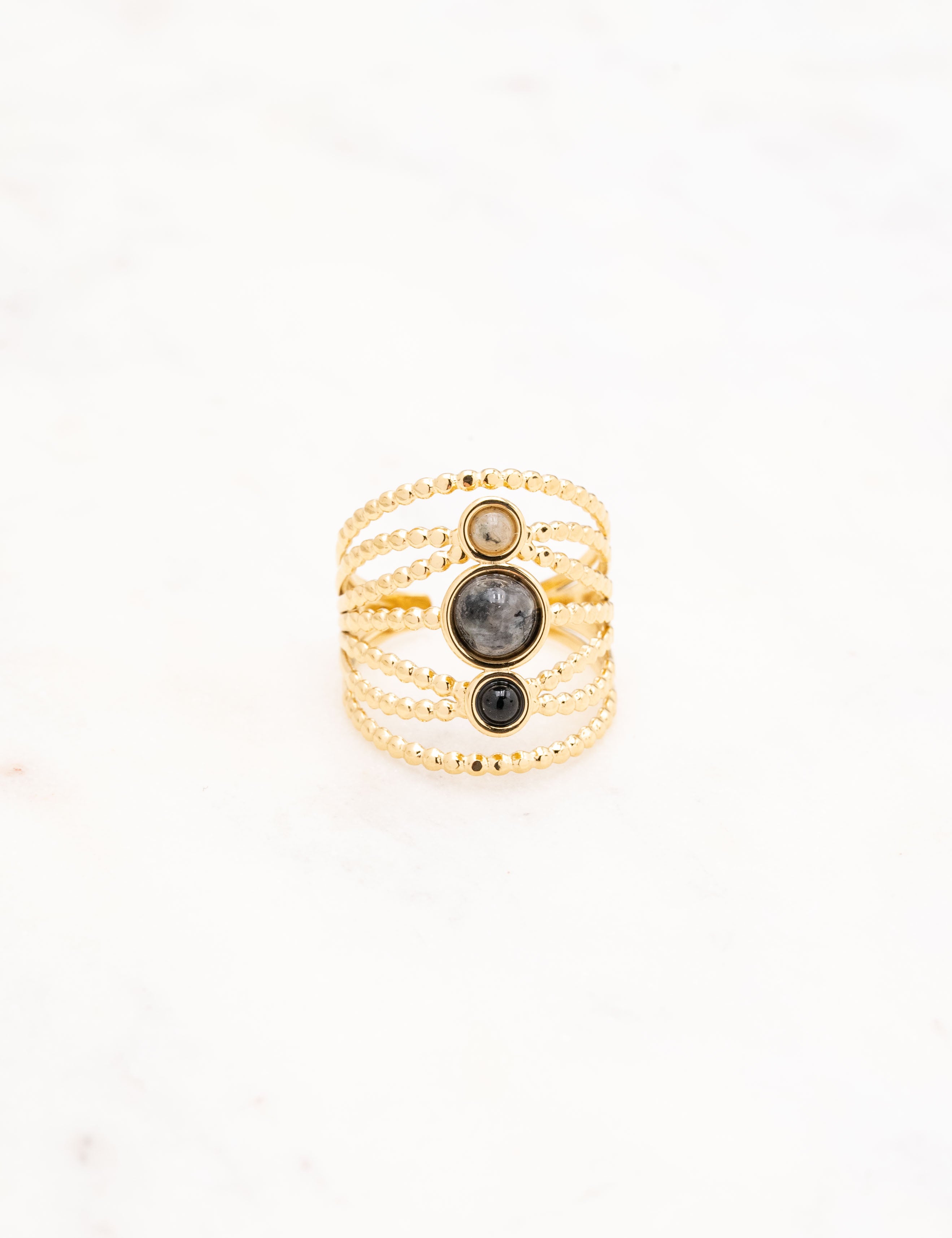 Bague graphique ajustable multi-rangs effet canelé ornée de trois pierres naturelles rondes.
