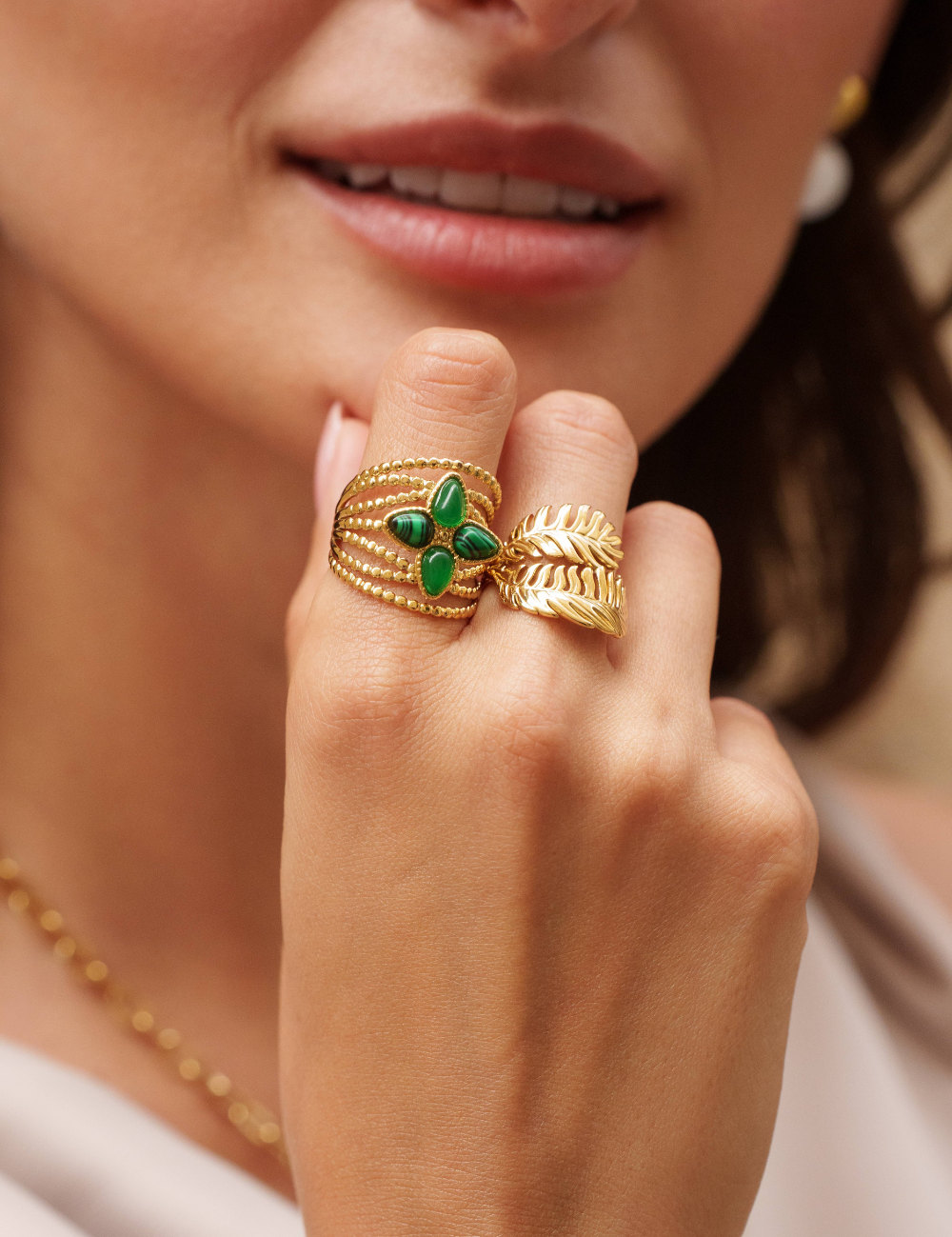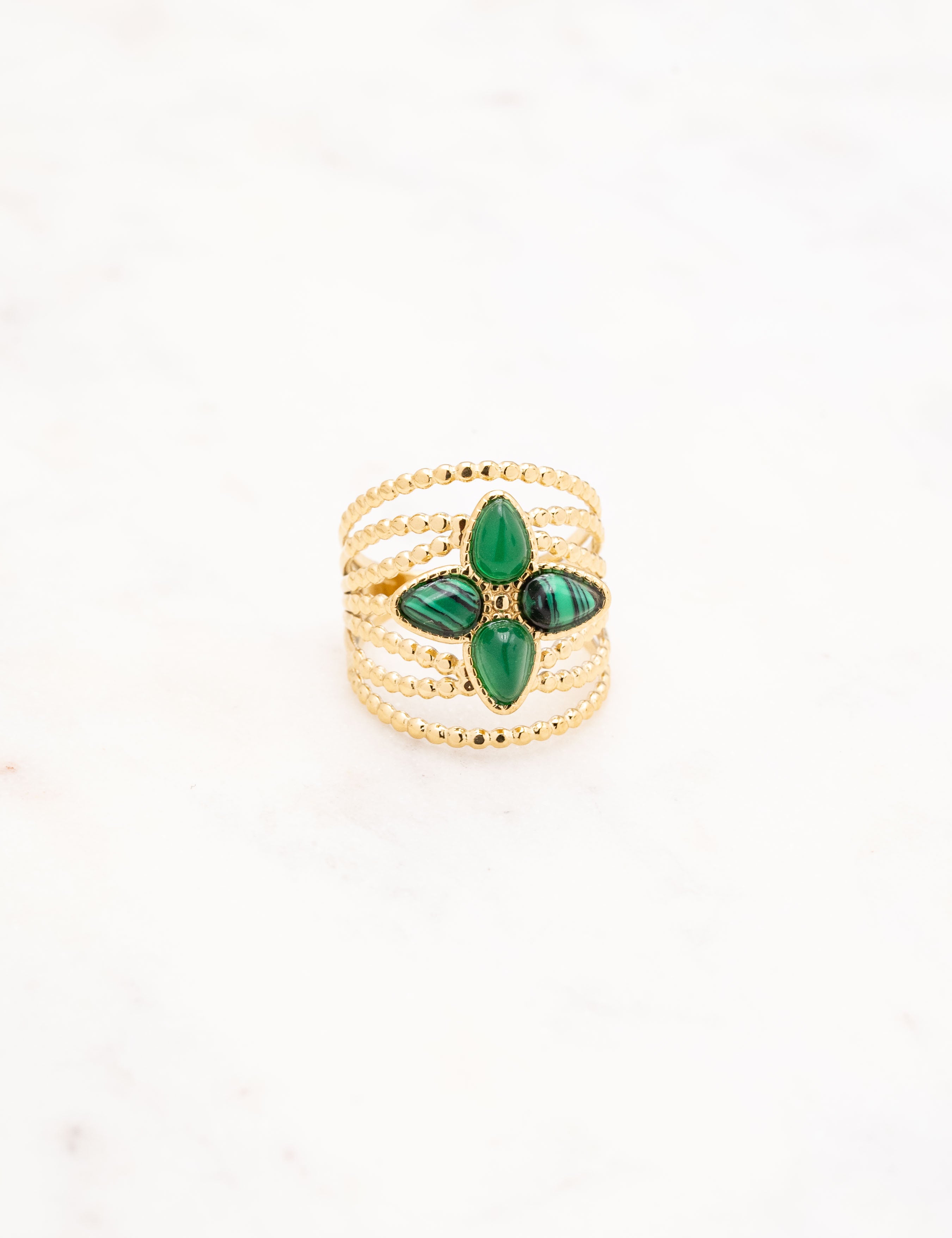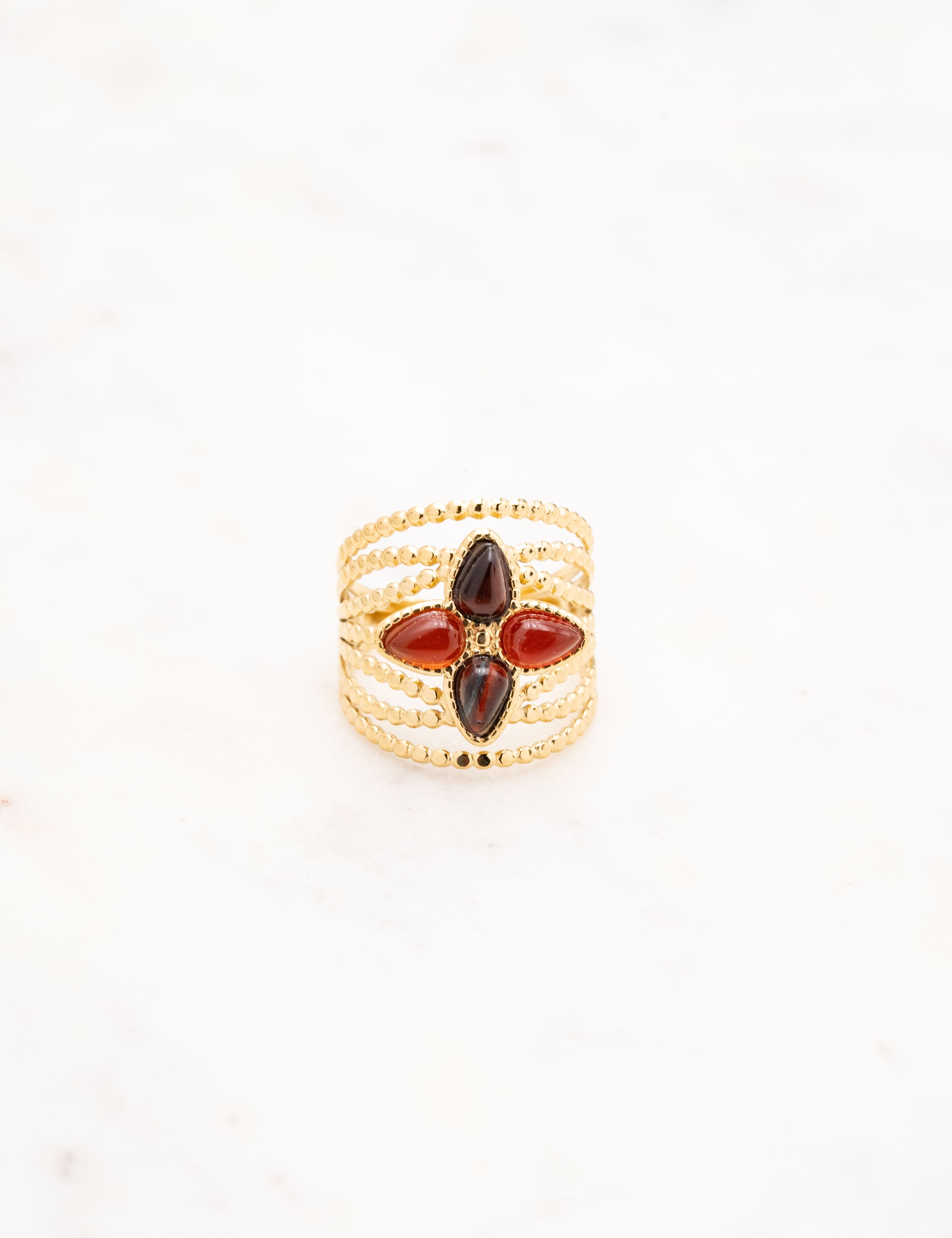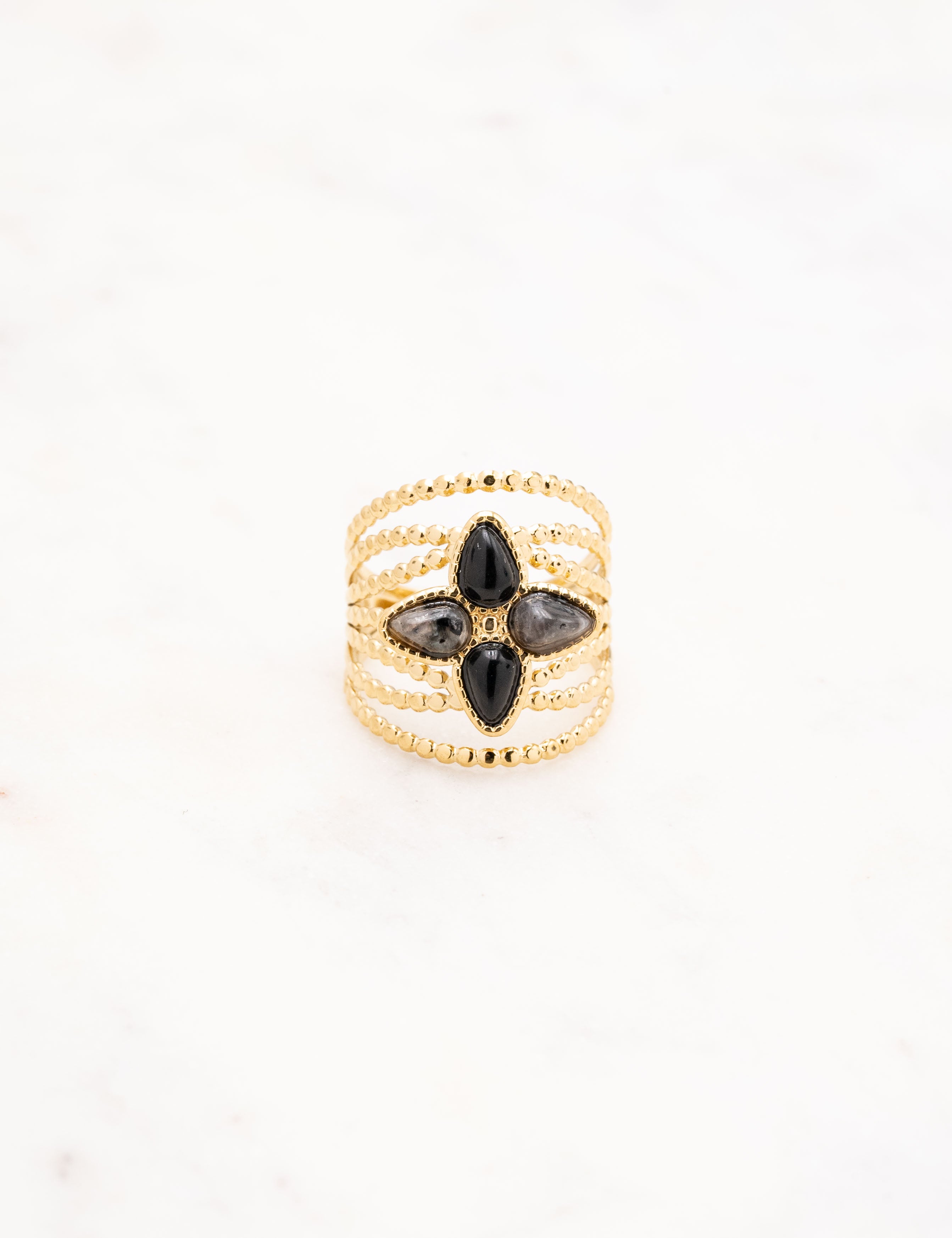 Bague graphique ajustable multi-rangs effet canelé ornée de pierres naturelles.