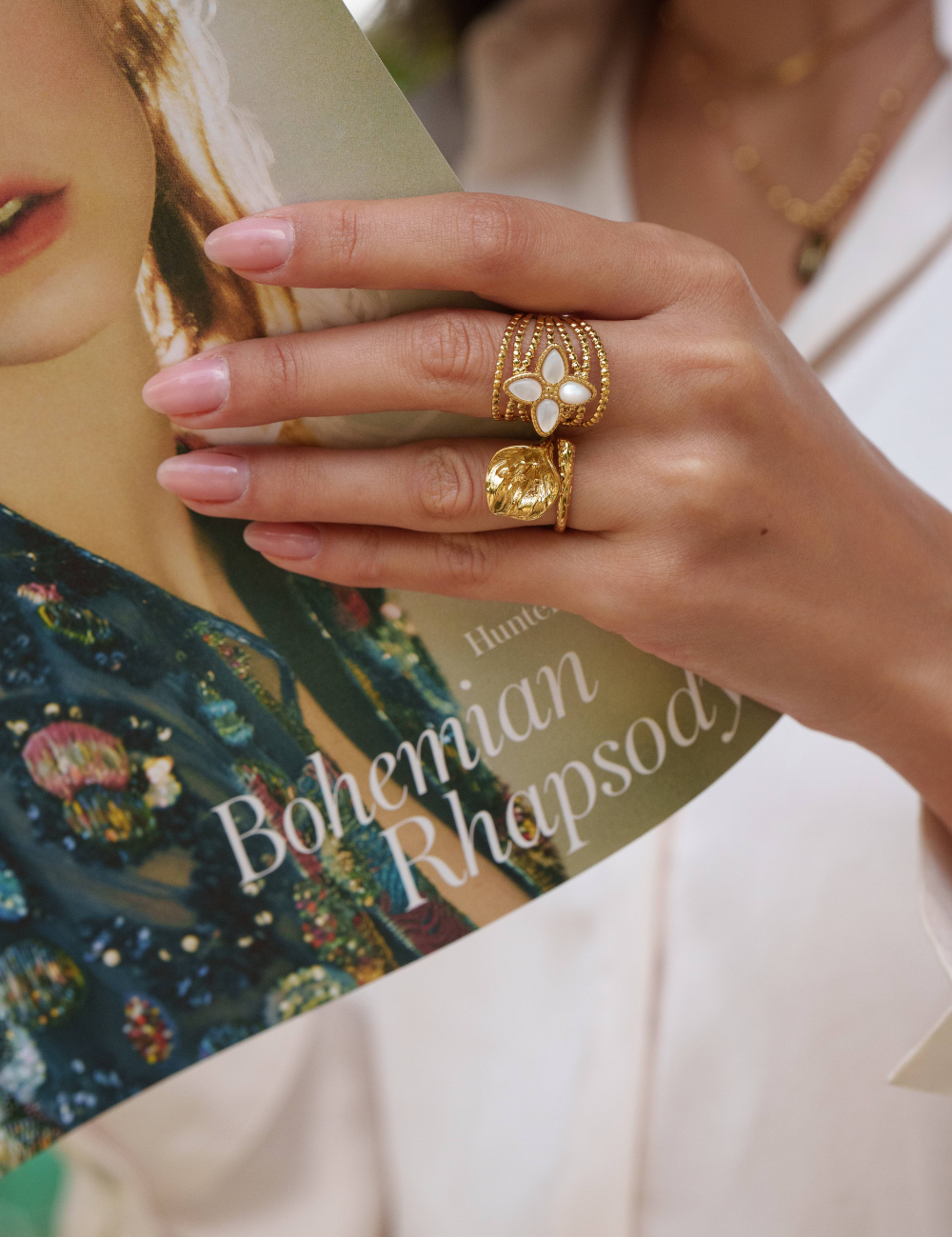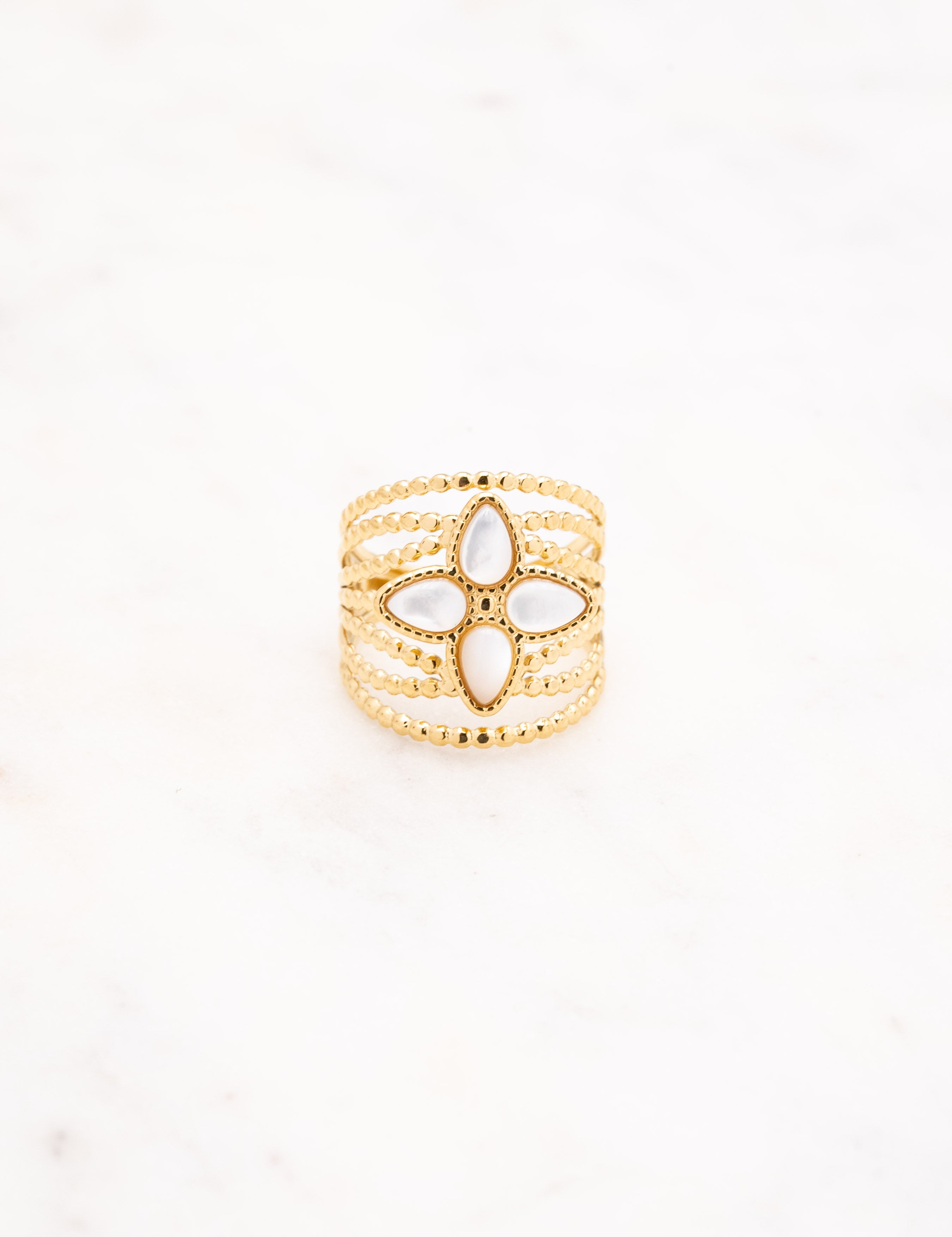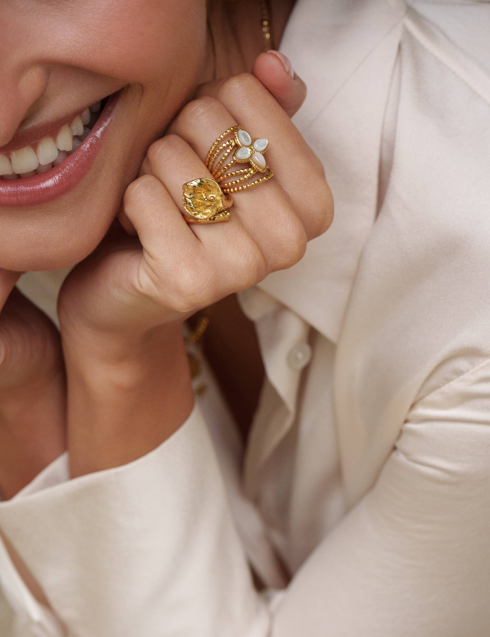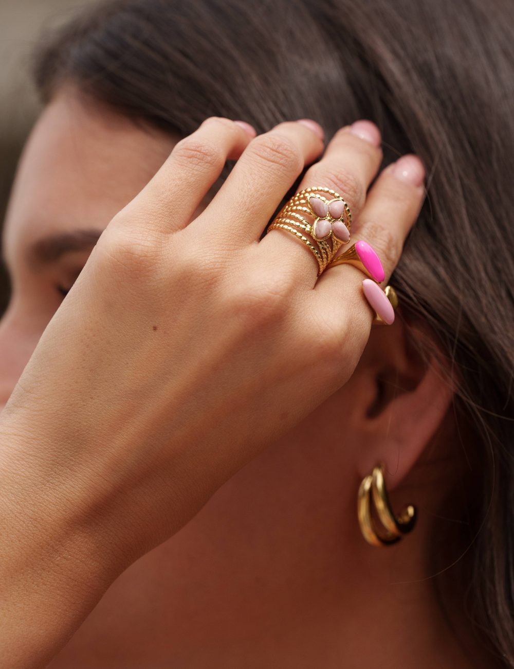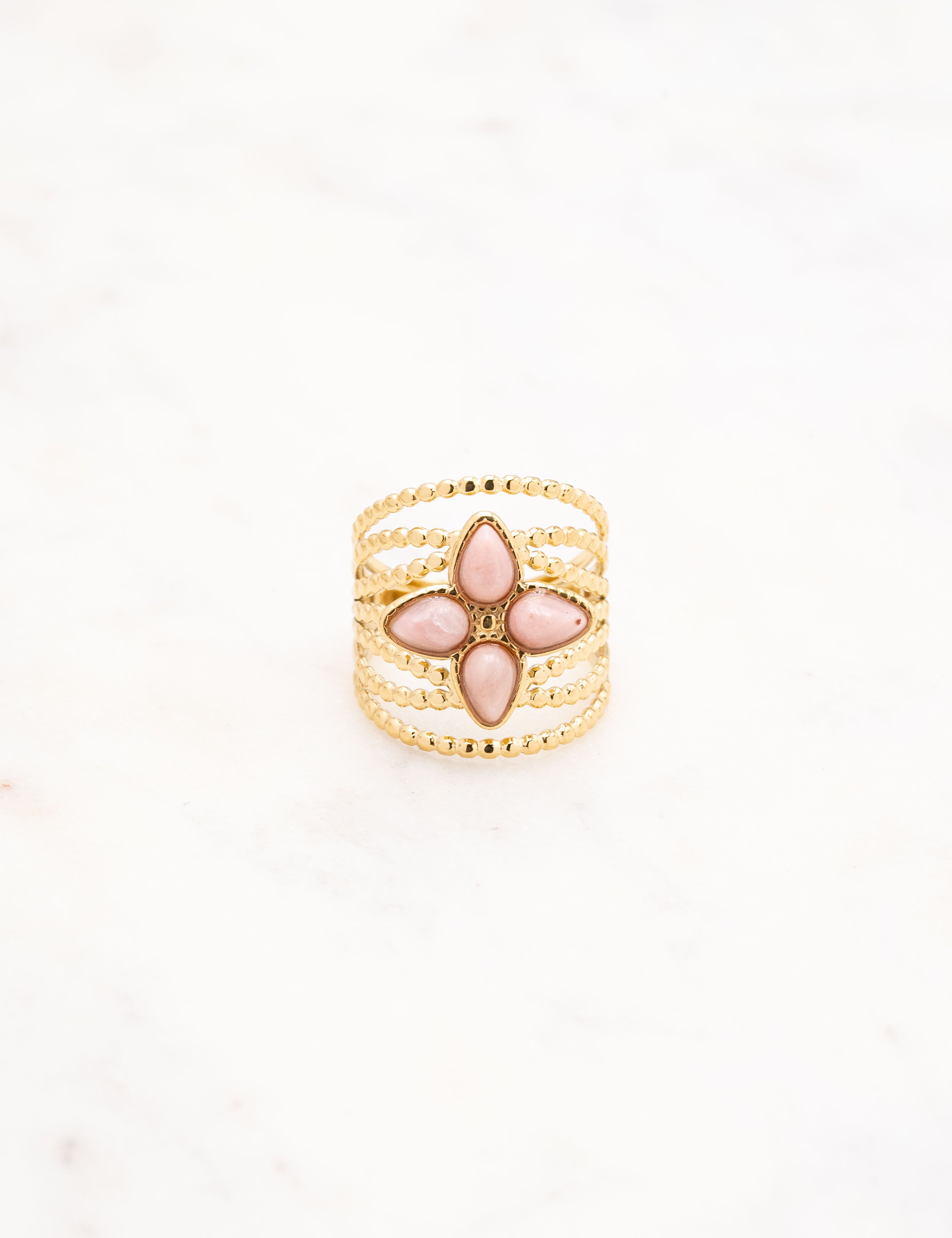 Bague graphique ajustable multi-rangs effet canelé ornée de pierres naturelles.