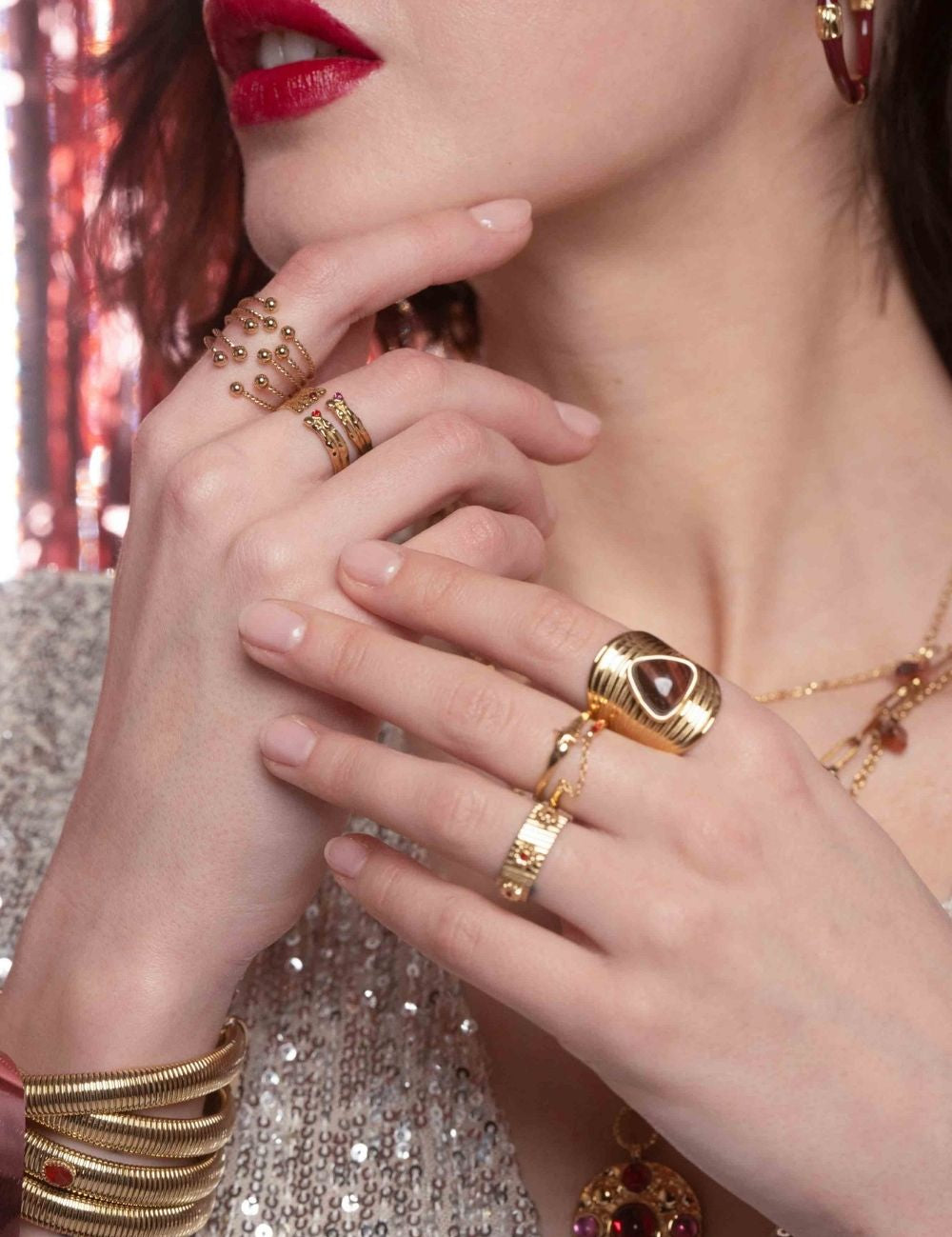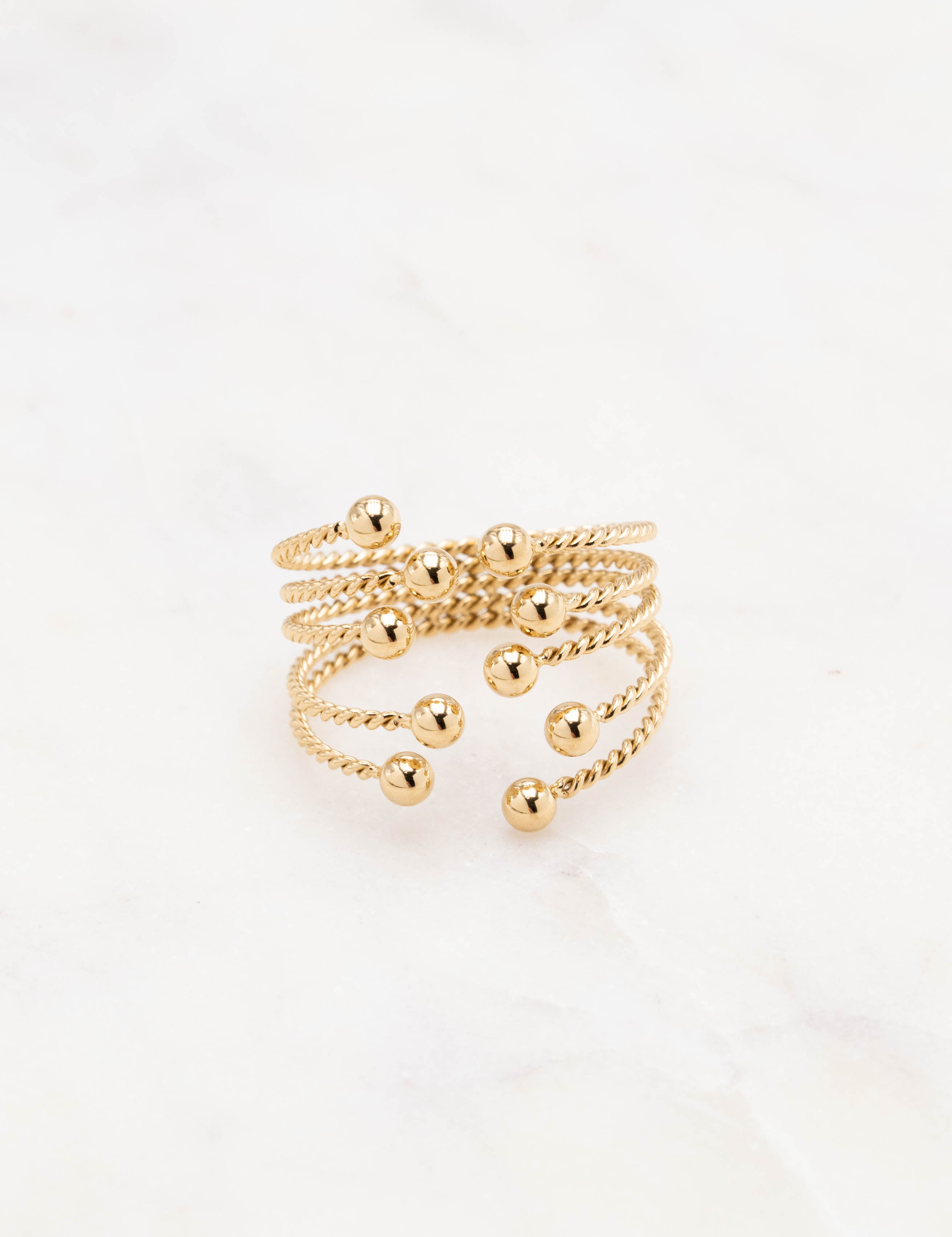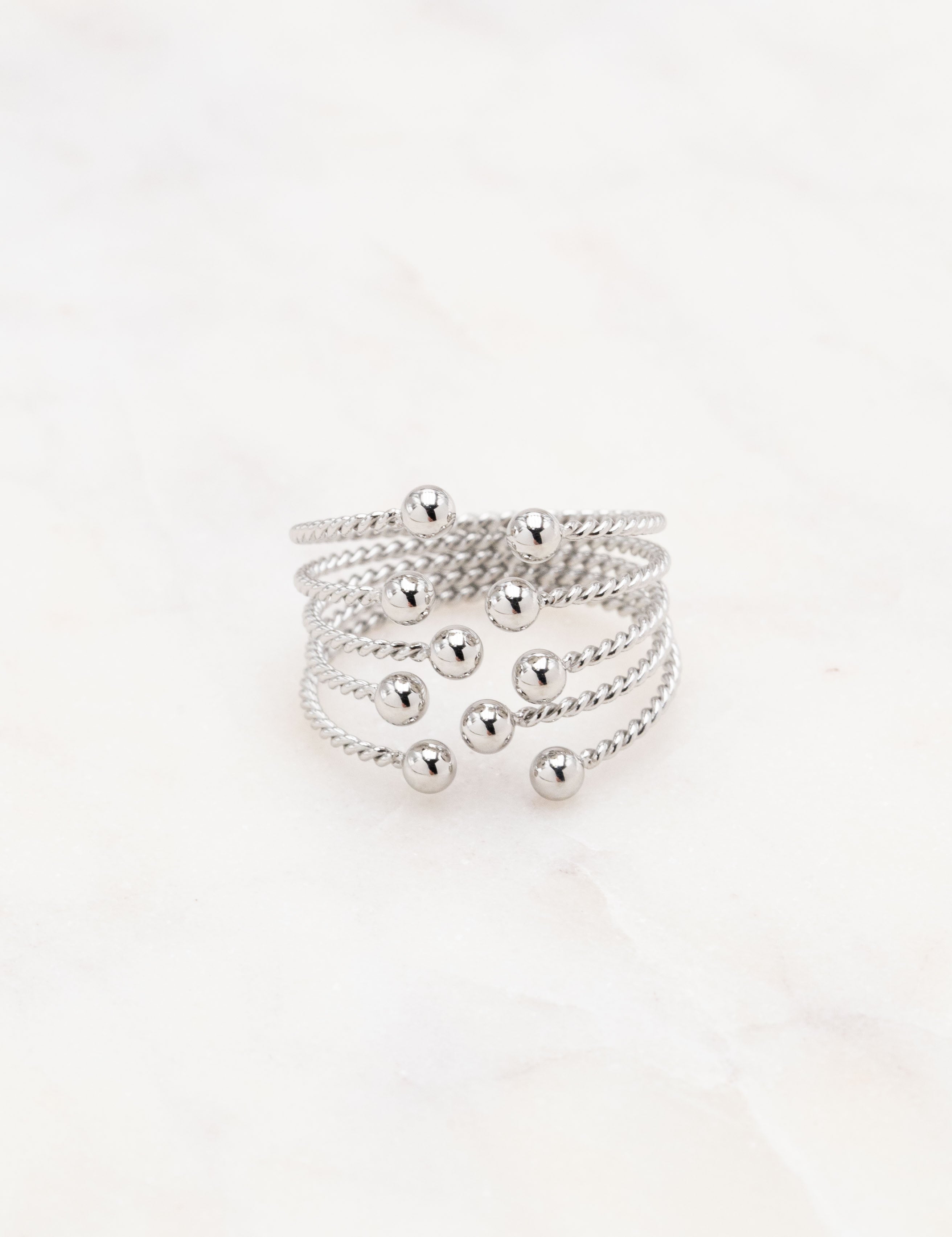 Bague graphique ajustable, ouverte par le devant composée de cinq rangs torsadés avec une finition géométrique (boule).