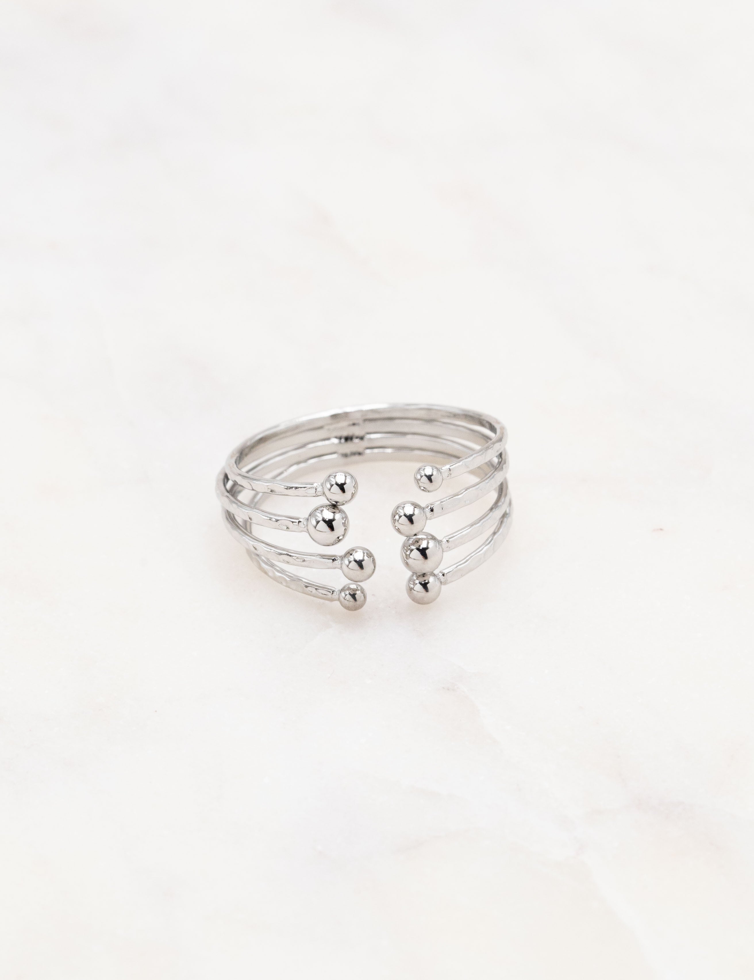 Bague graphique ajustable, ouverte par le devant composée de quatre rangs texturés avec une finition géométrique (boule).