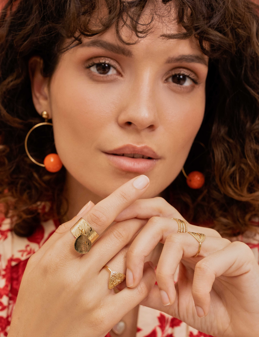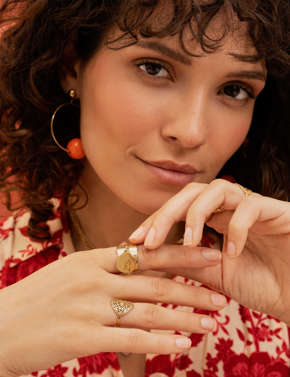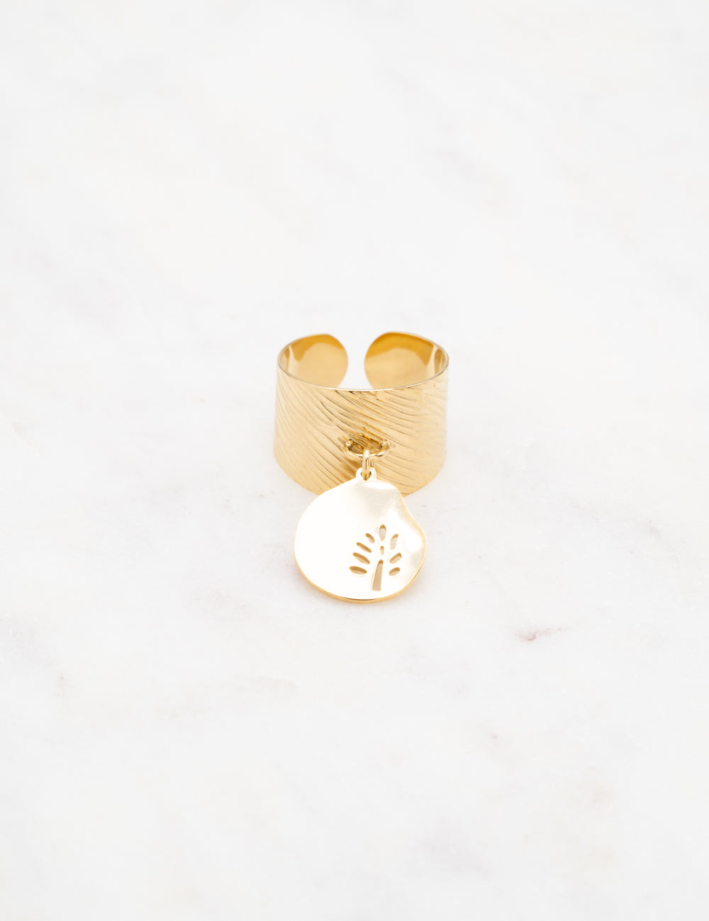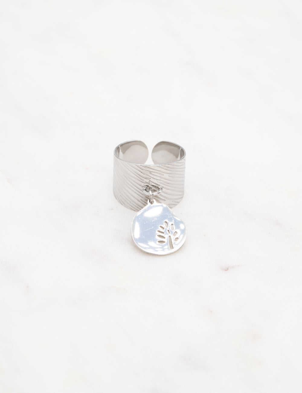Bague ajustable texturée composée d'une pampille avec un motif végétal ajouré.