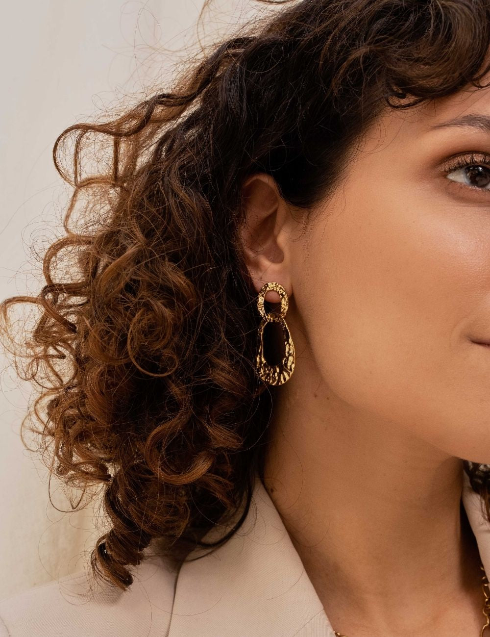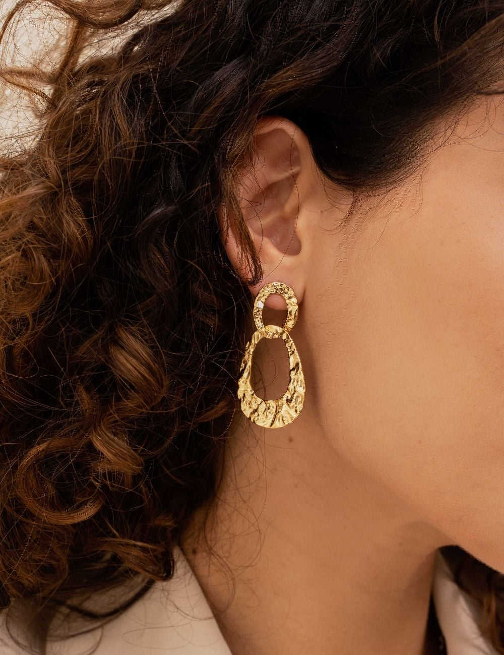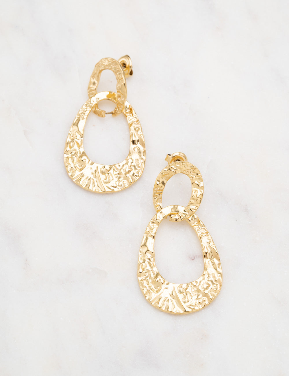 Boucles d'oreilles graphiques à puce composées de 2 anneaux martelés. Fermoir papillon.