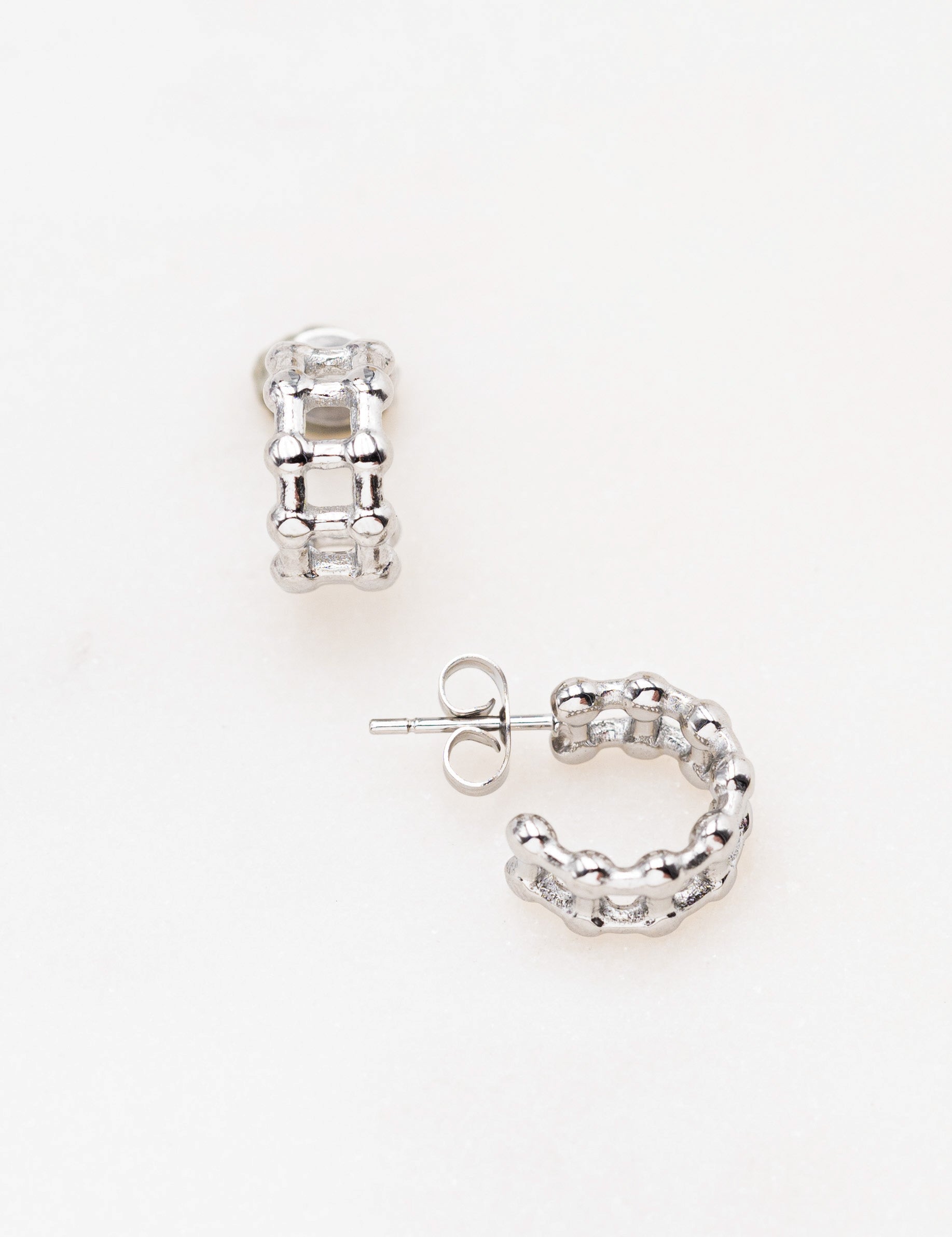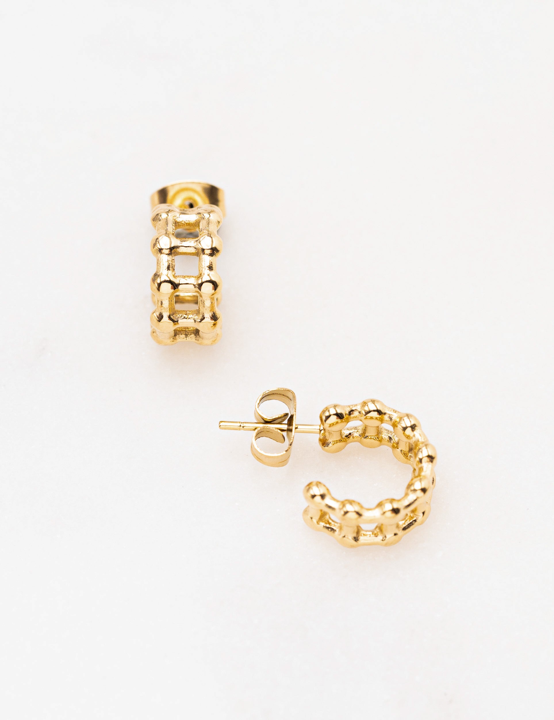 Boucles d'oreilles type créoles à puce graphiques. Fermoir papillon. Disponibles en doré et argenté.