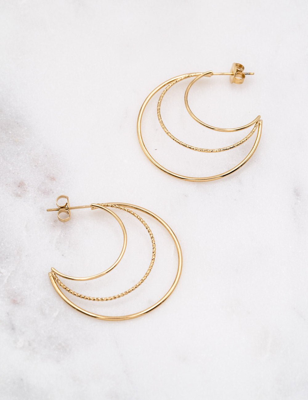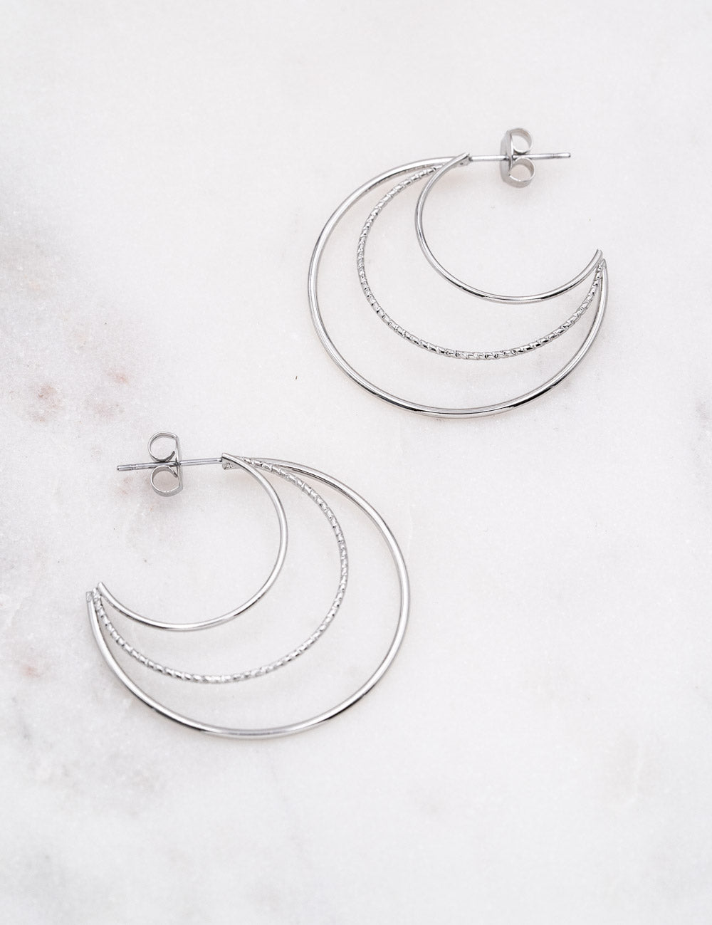 Boucles d'oreilles type créoles à puce 3 rangs avec jeu de textures. Fermoir papillon.