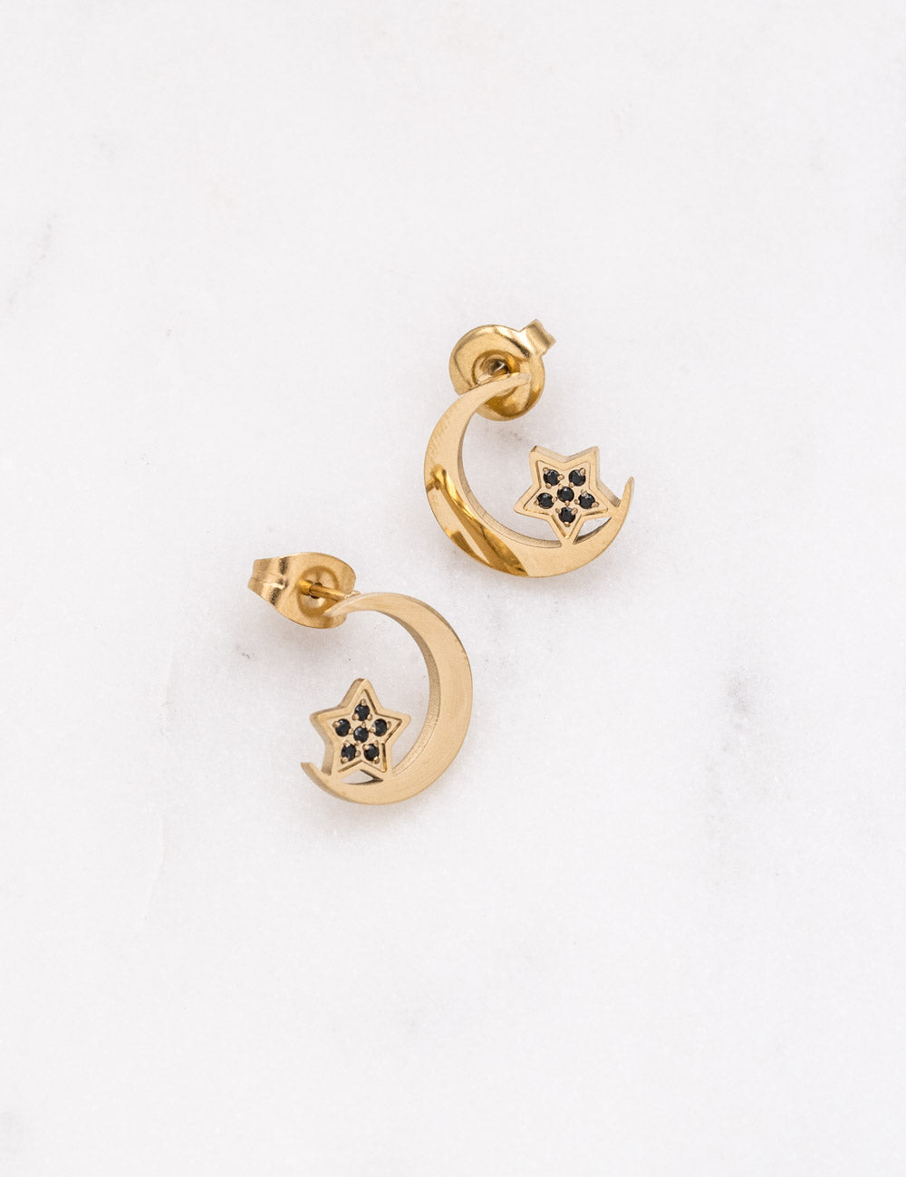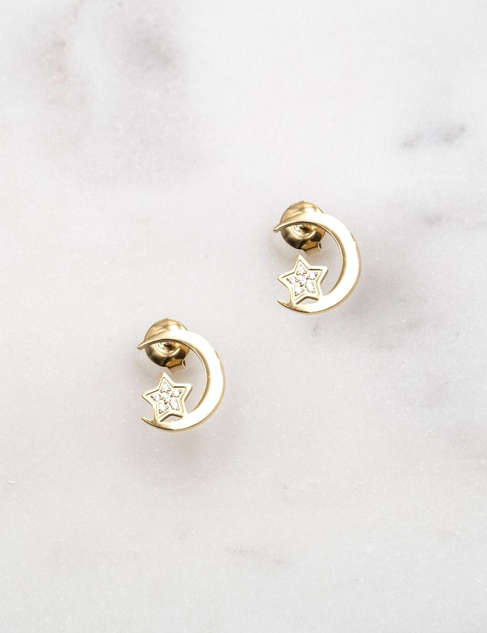 Boucles d'oreilles à puce motif lune et étoile embellie de strass.