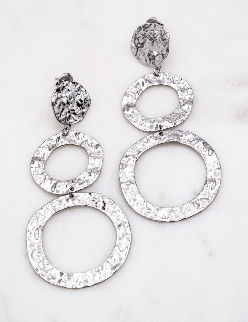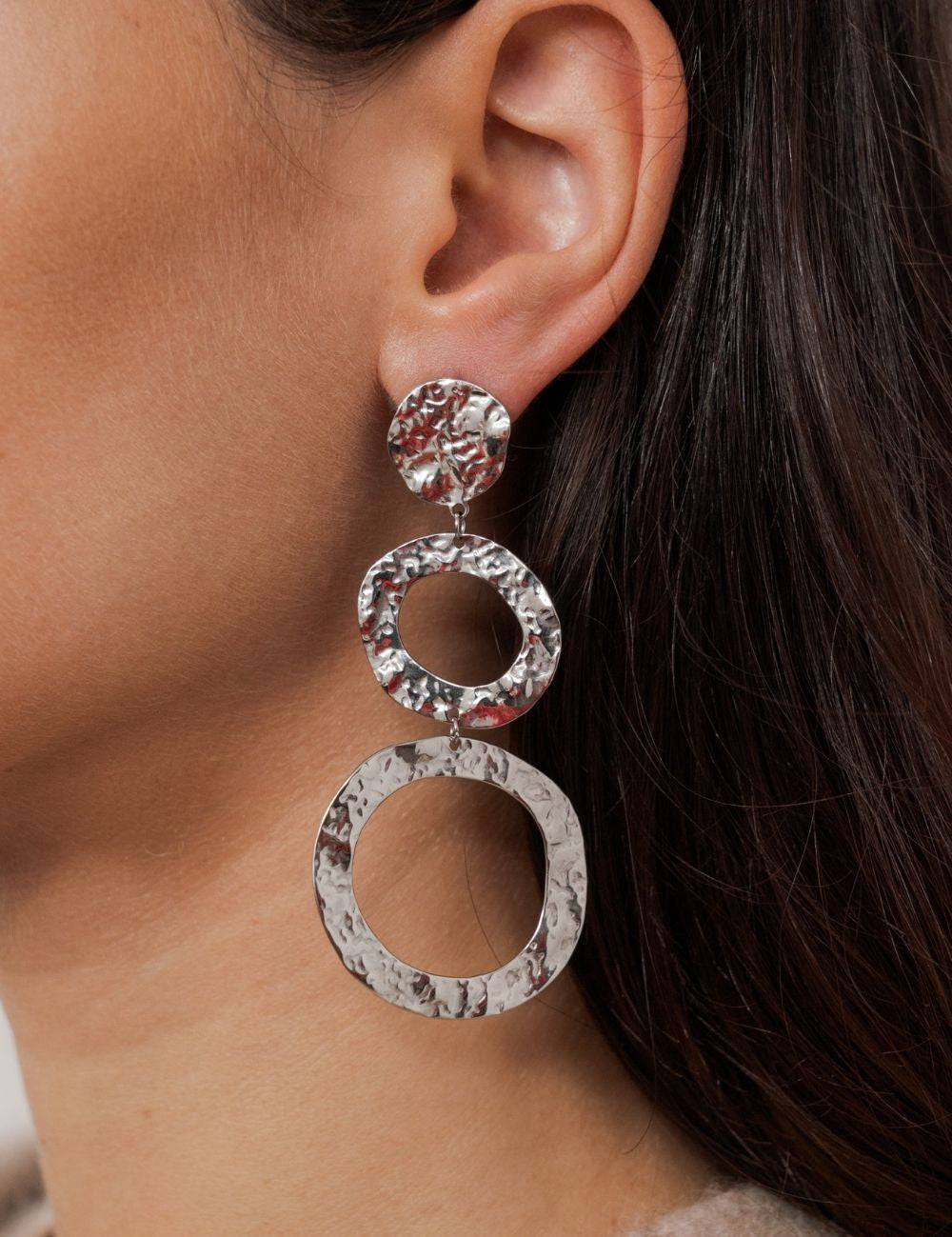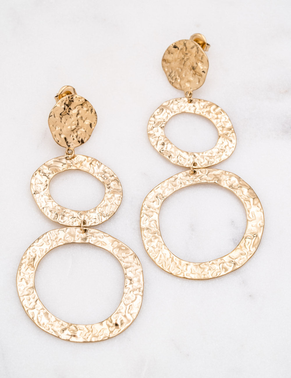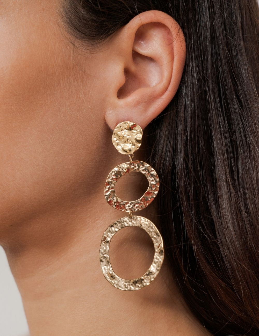 Boucles d'oreilles à puce effet martelé composées deux anneaux avec fermoir papillon.