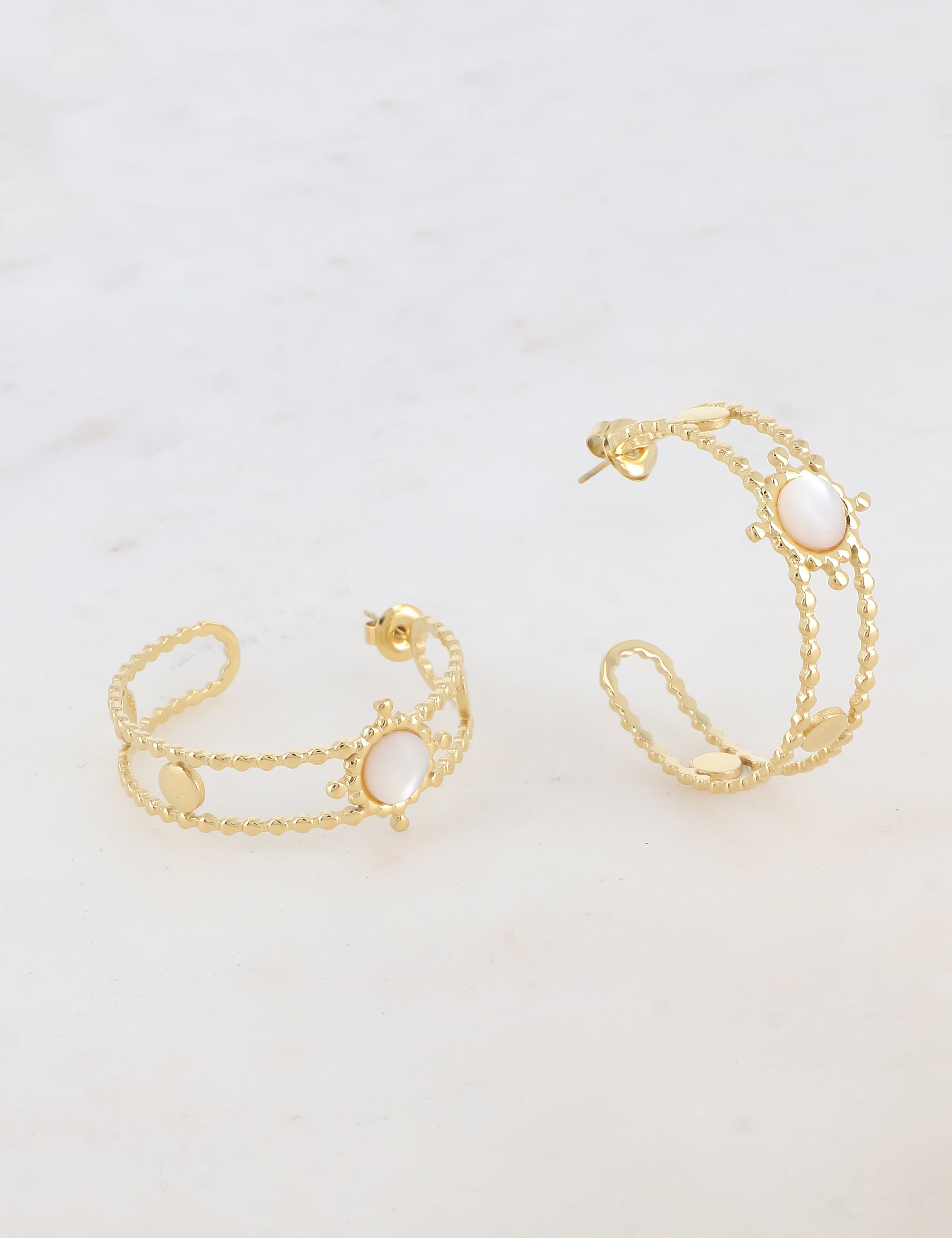 Boucles d'oreilles type créoles graphiques à puce 2 rangs sertie d'une pierre naturelle.
