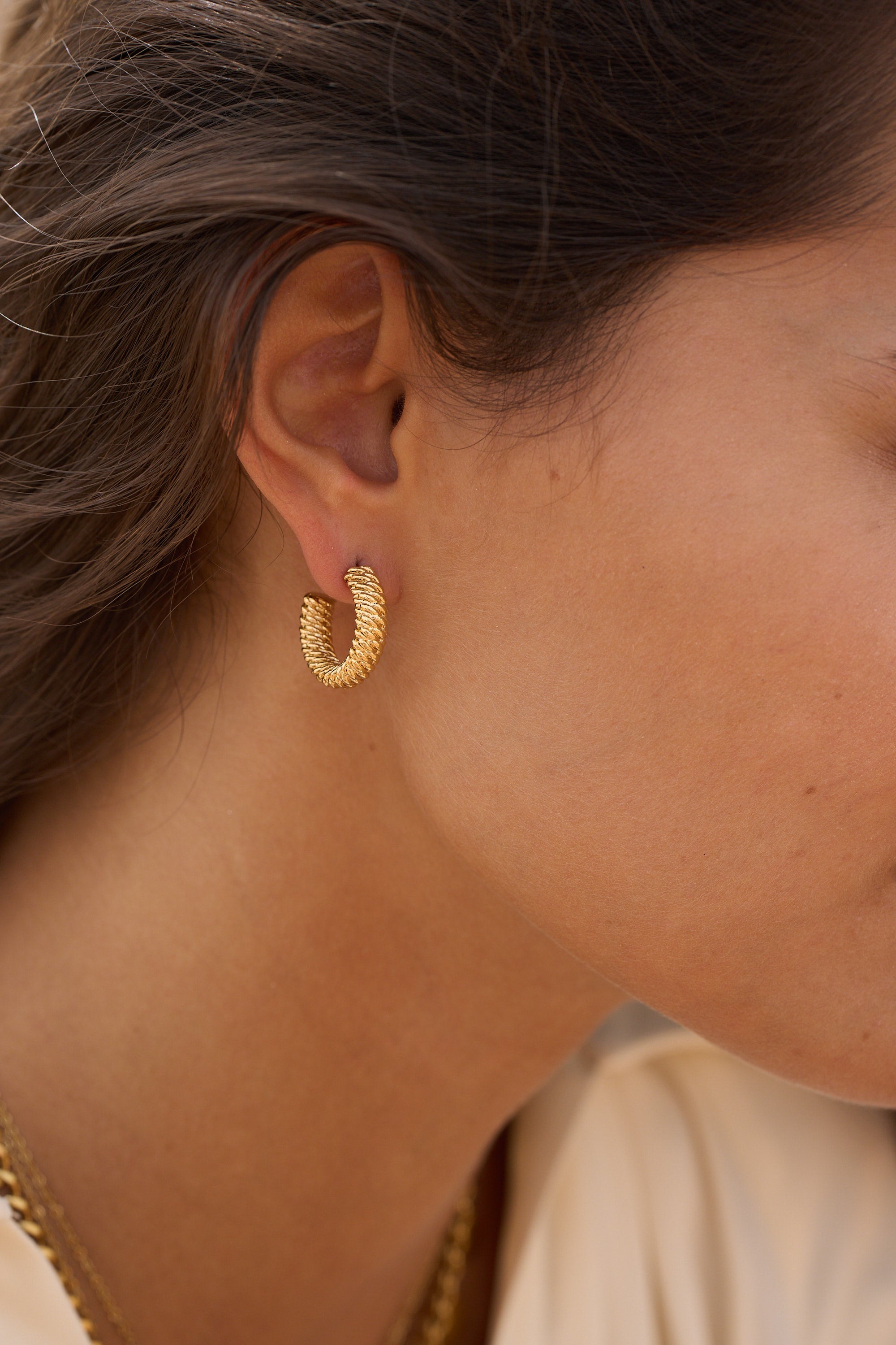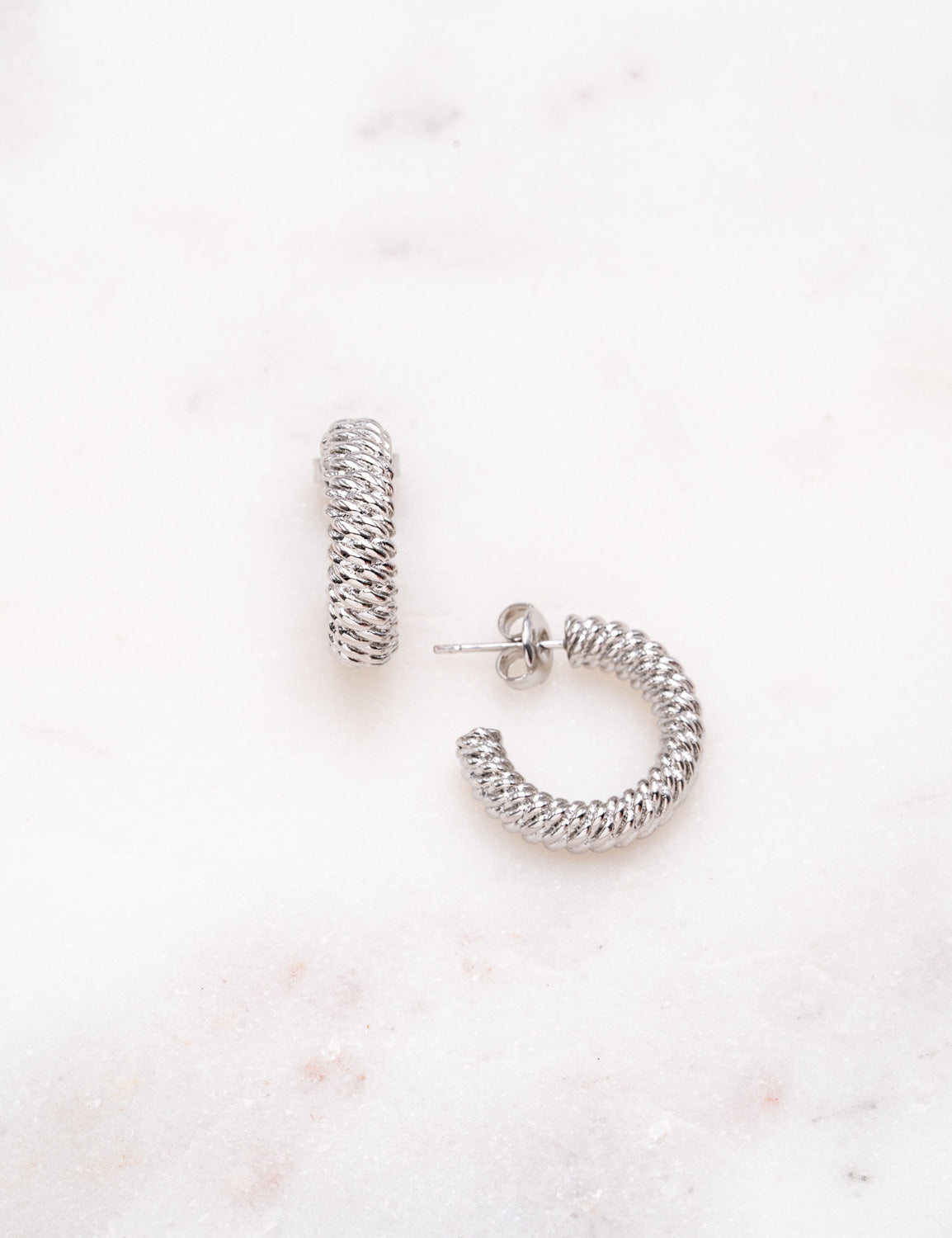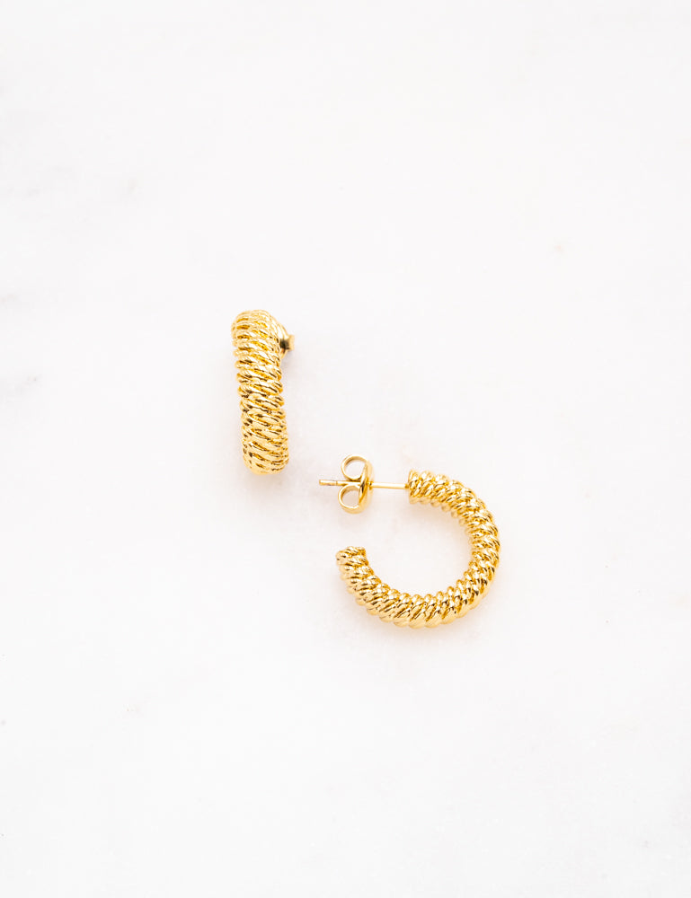 Boucles d'oreilles graphiques type créoles à puce texturées effet torsadé. Fermoir papillon.