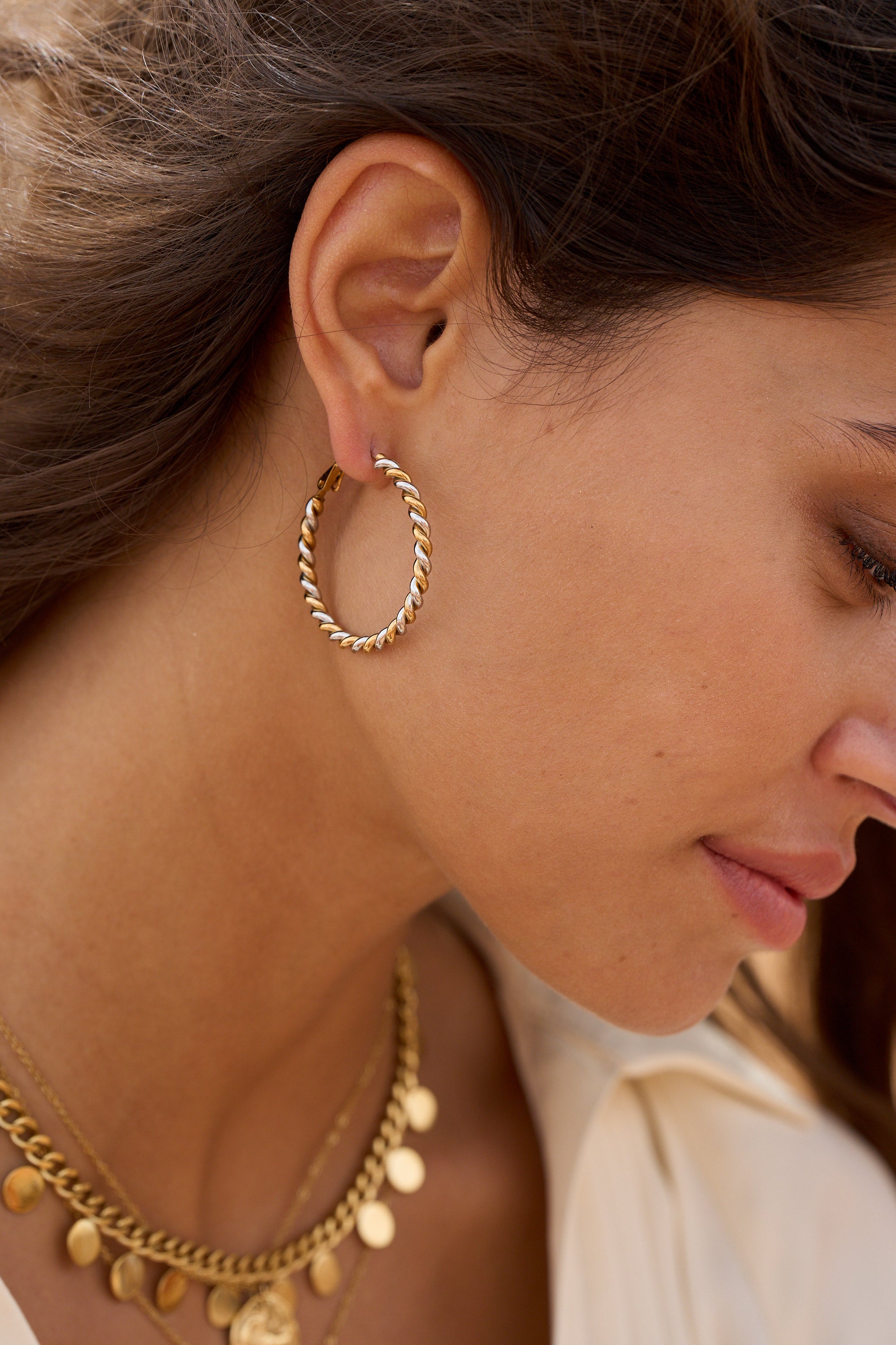 Boucles d'oreilles graphiques bicolores (doré et argenté) type créoles texturées effet torsadé. Fermoir cliquet.