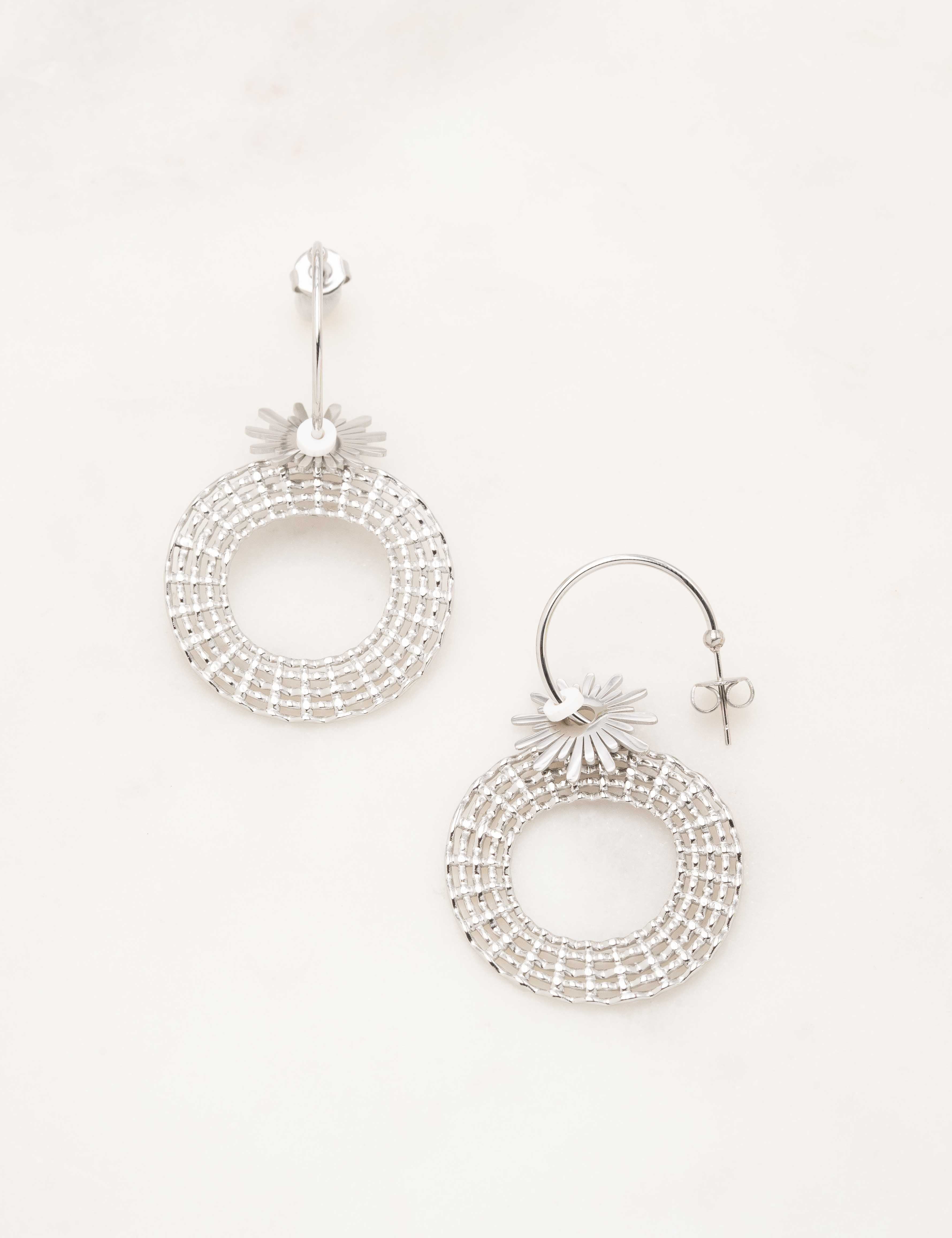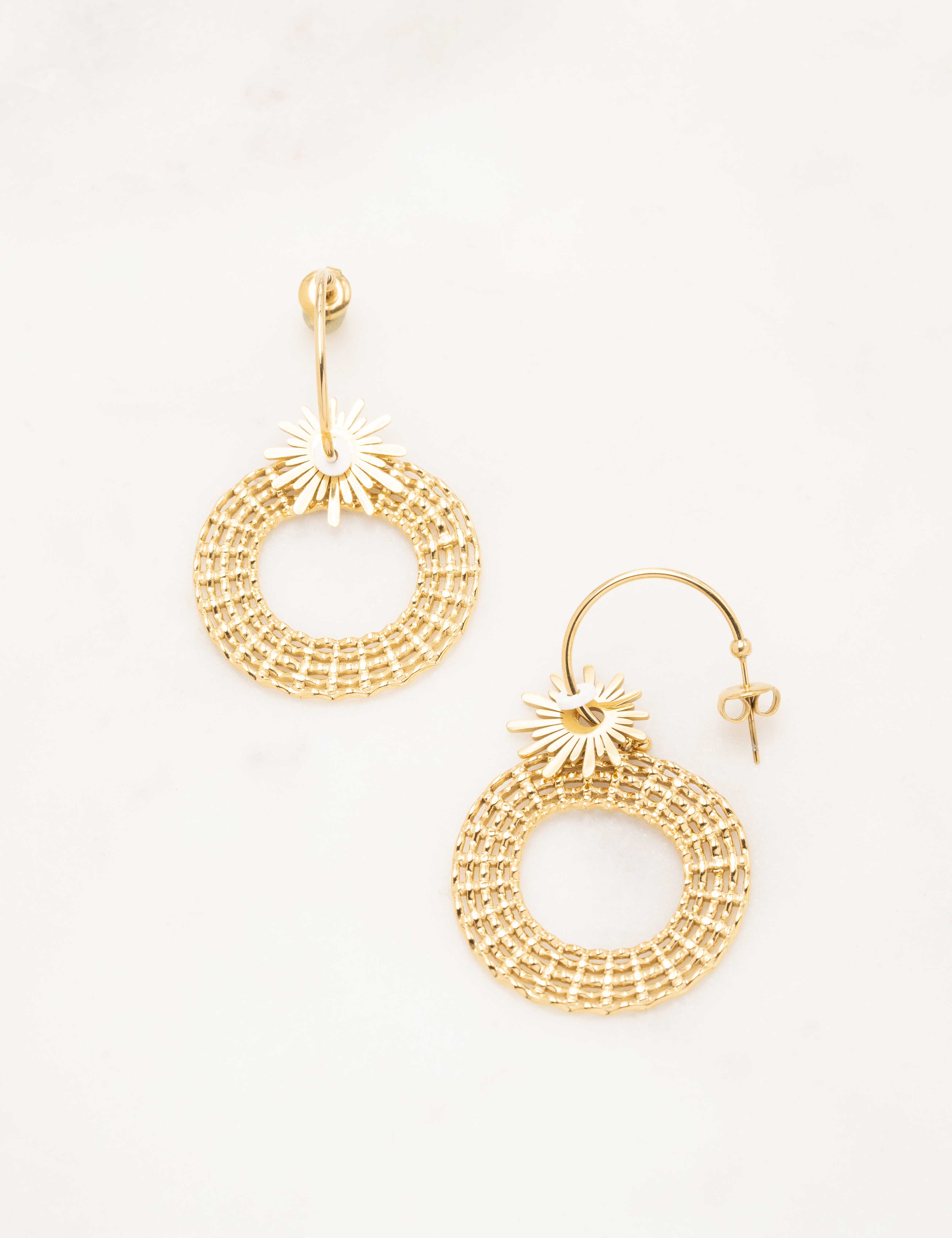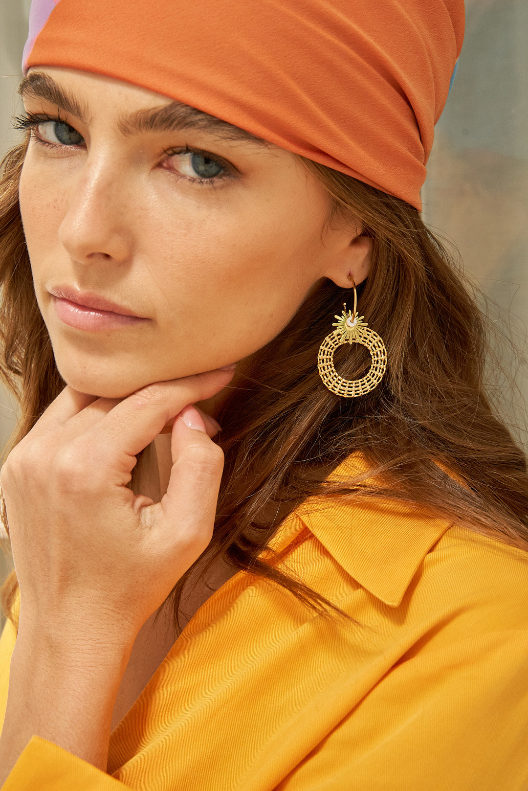 Boucles d'oreilles type créoles à puce composées d'une pièce graphique texturée, d'une petite pièce étoilée et d'une perle Heishi. Fermoir papillon.
