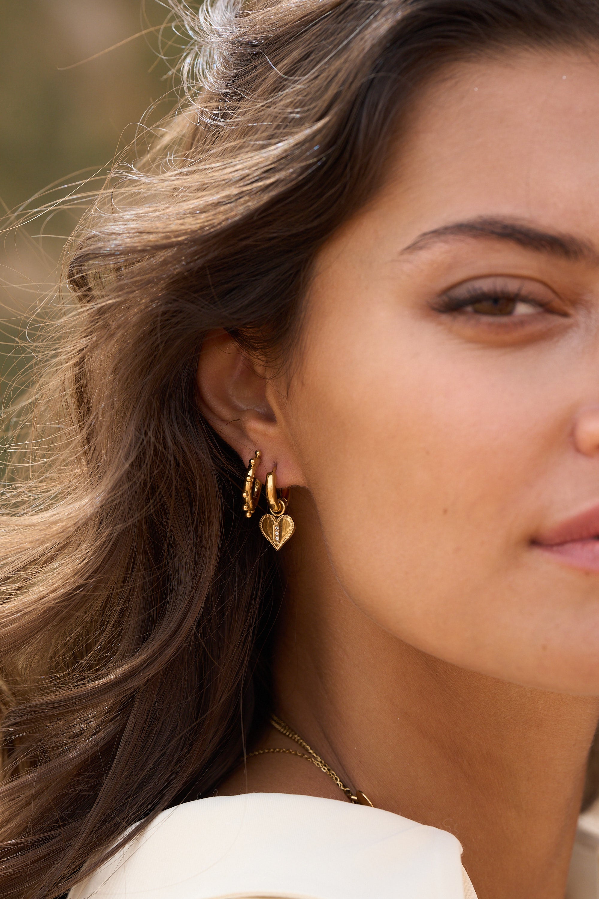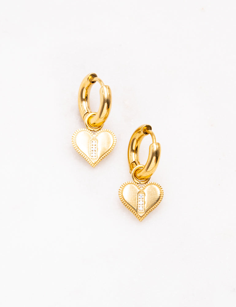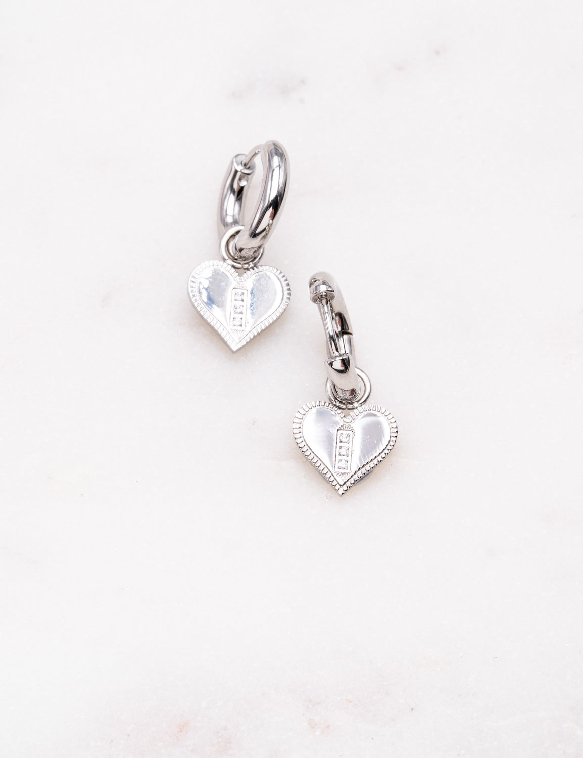 Boucles d'oreilles type créoles composées d'une pièce en forme de coeur texturé et serti de strass. (oxyde de zirconium). Fermoir charnière.