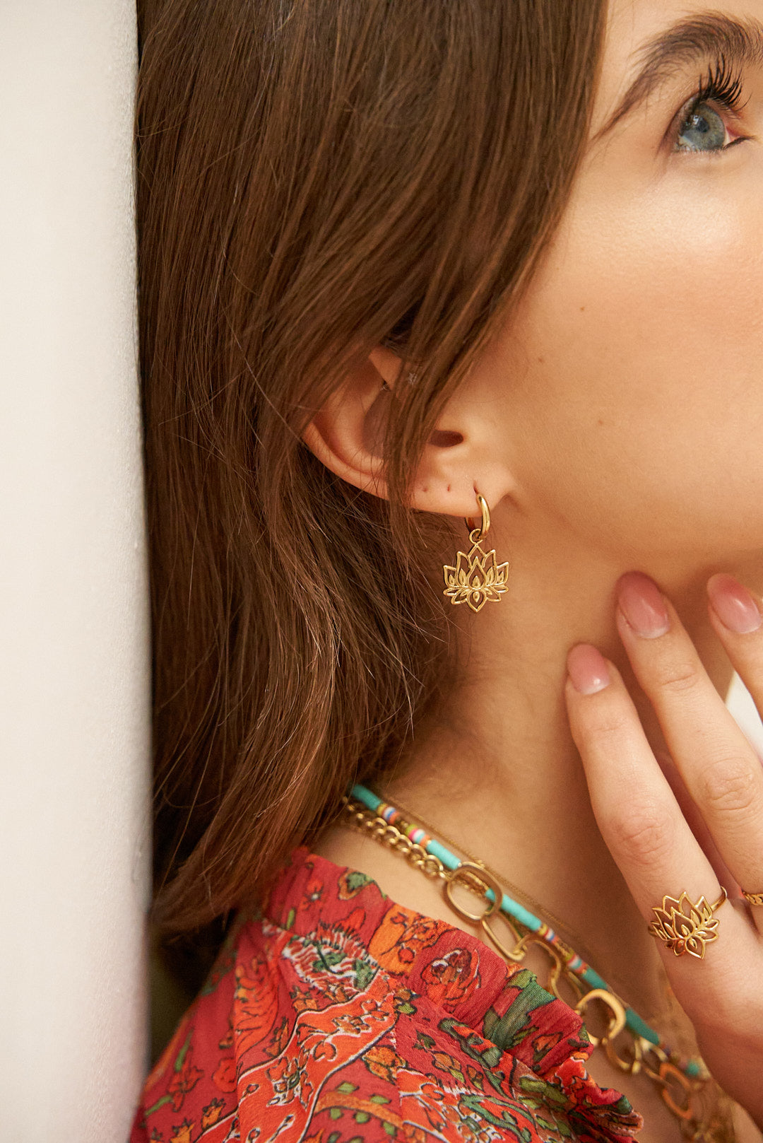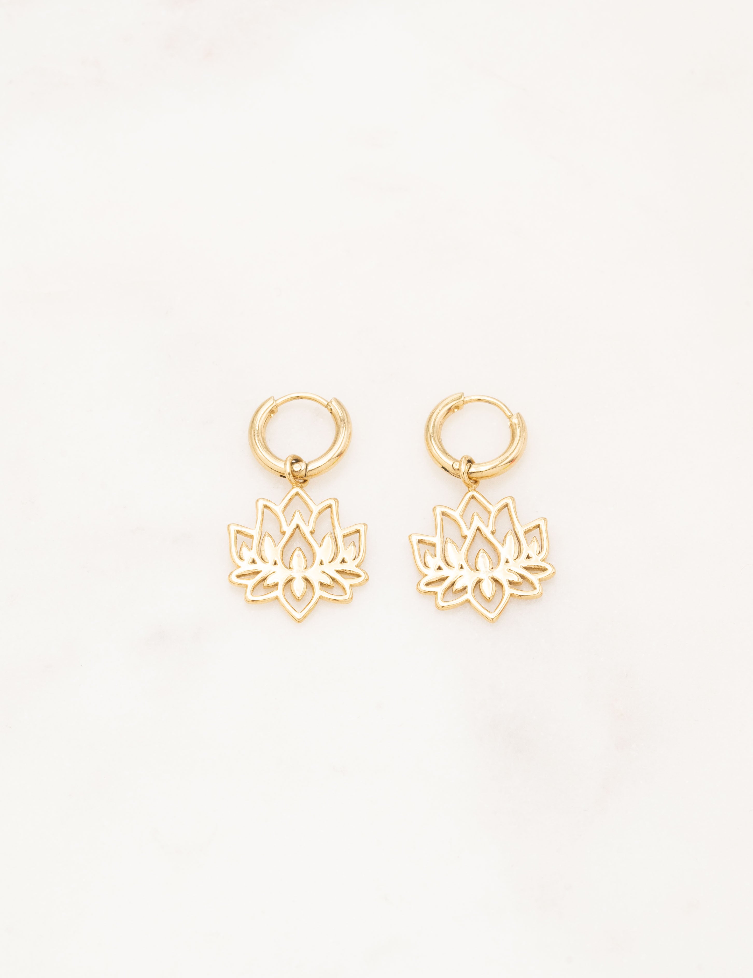 Boucles d'oreilles type créoles composées d'un pendant graphique ajouré au motif fleur de lotus. Fermoir charnière.