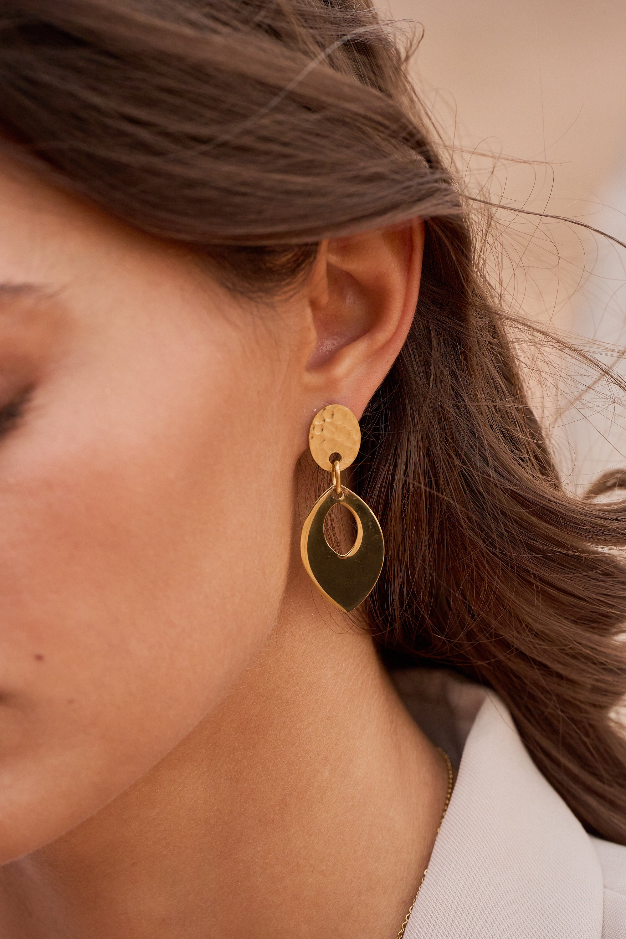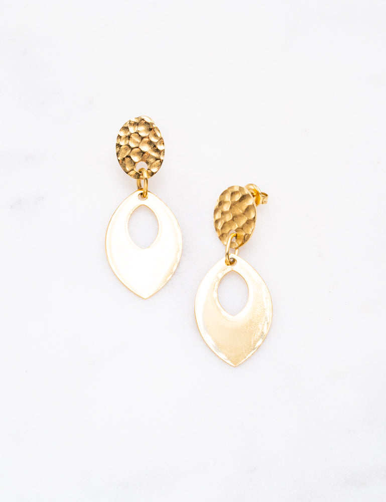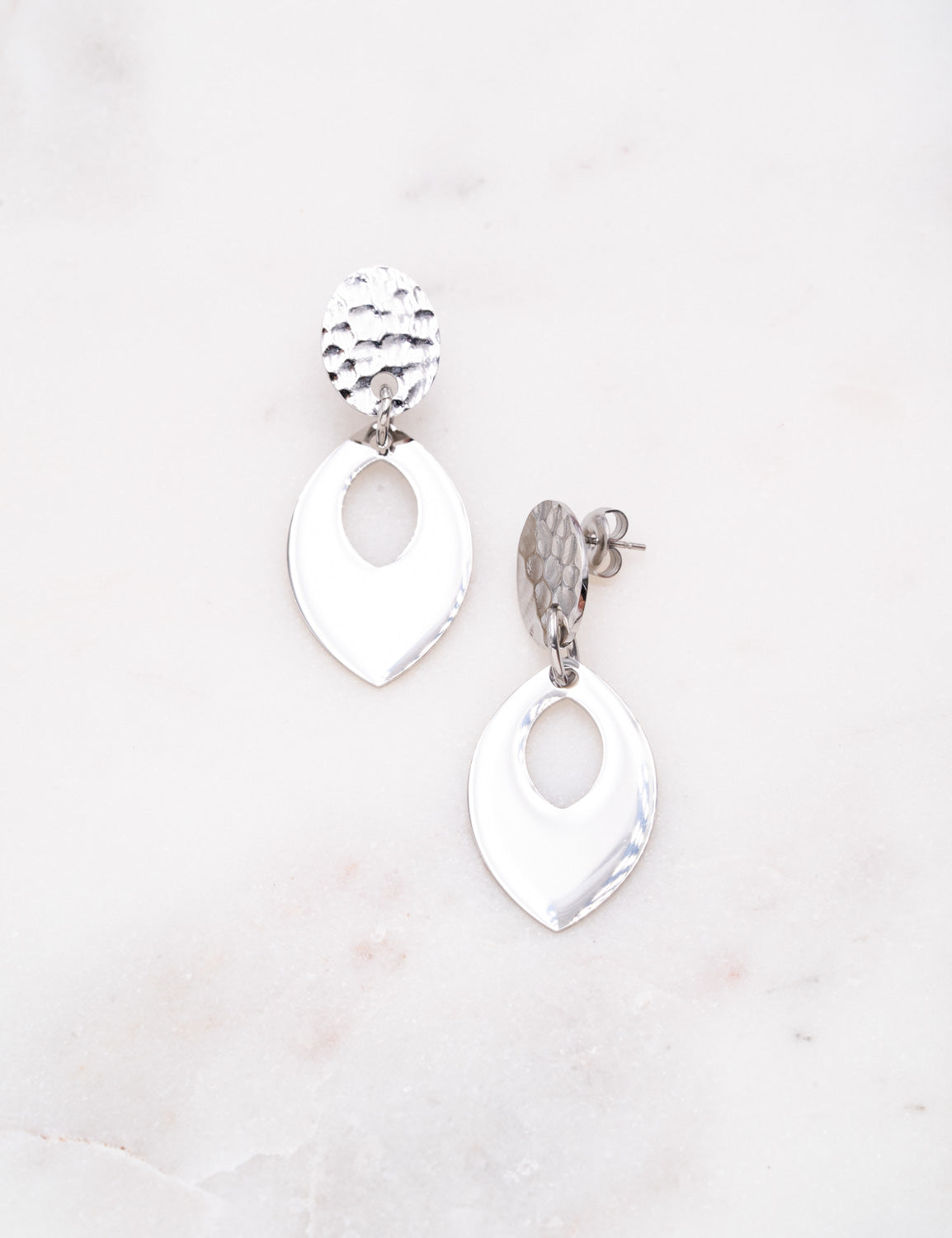 Boucles d'oreilles à puce composées d'une pièce martelée et d'un pendant graphique lisse et ajouré. Fermoir papillon.