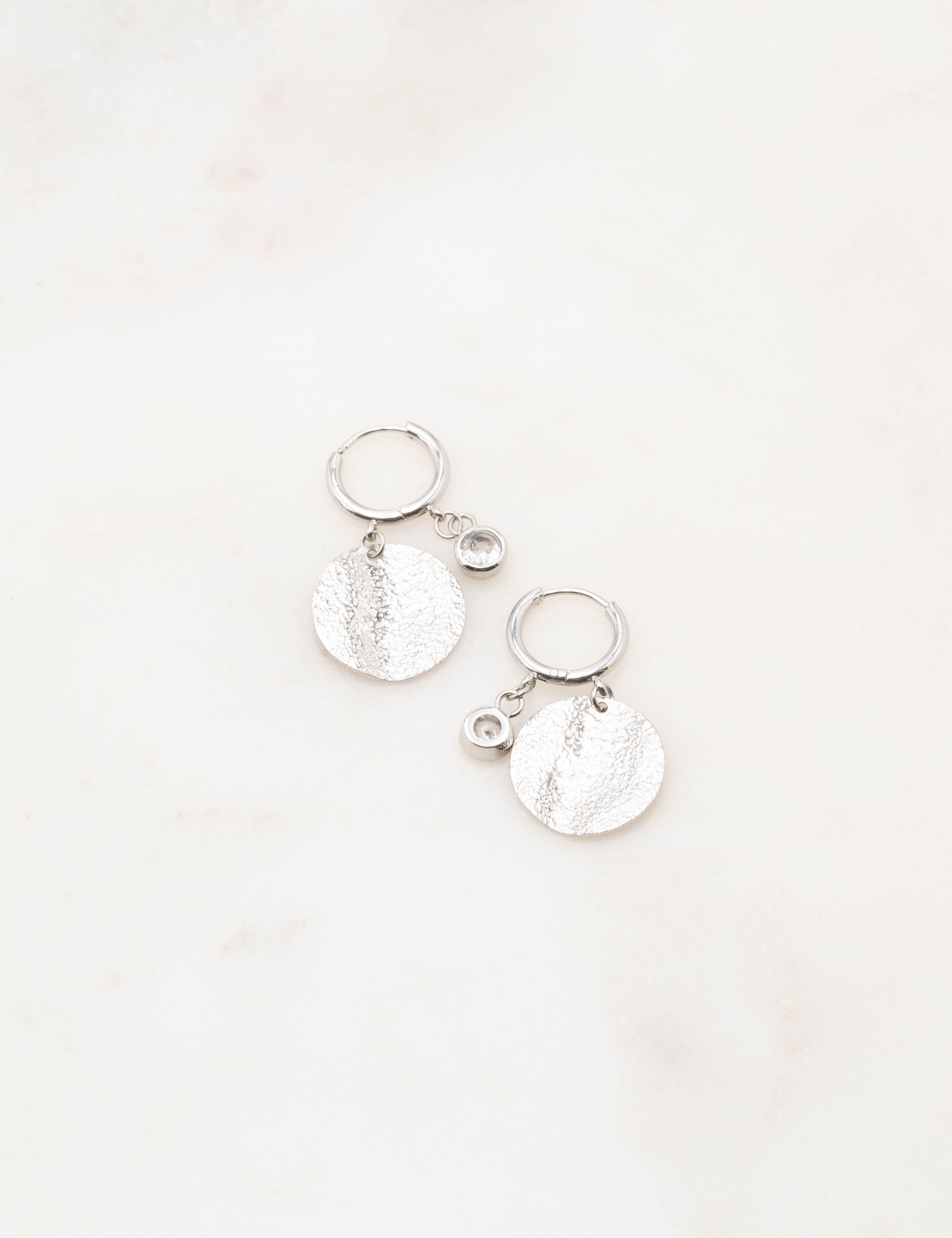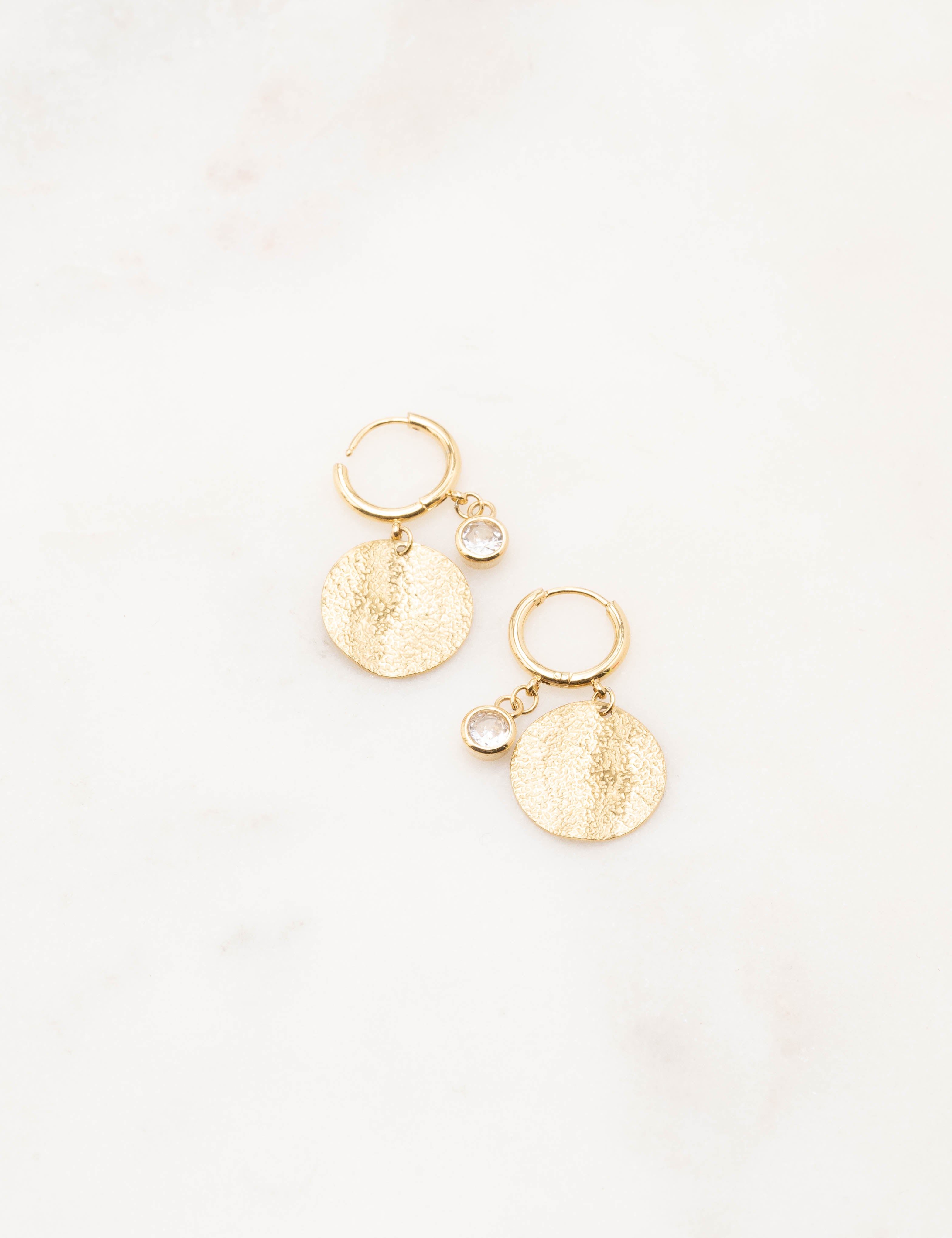 Boucles d'oreilles type créoles composées d'une pampille martelée et d'une pampille strassée. Fermoir charnière.