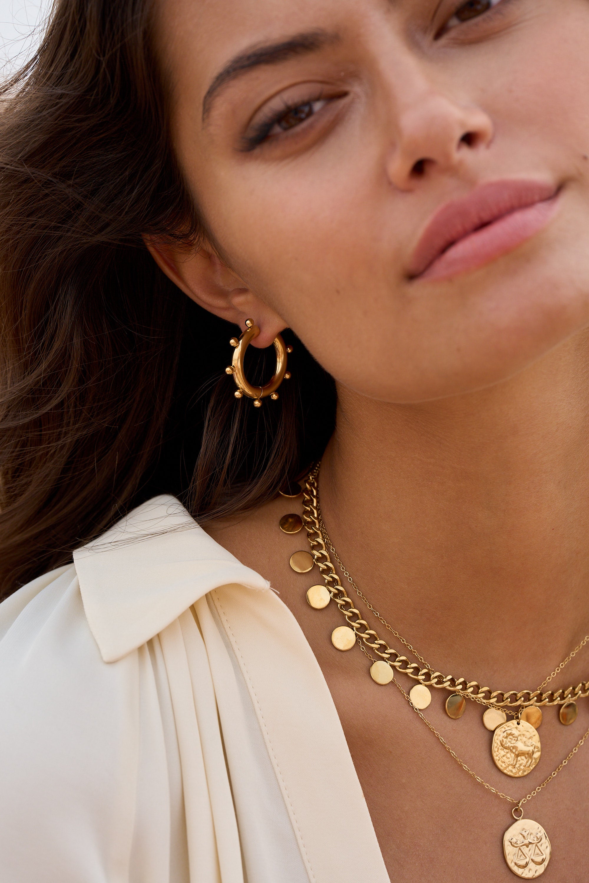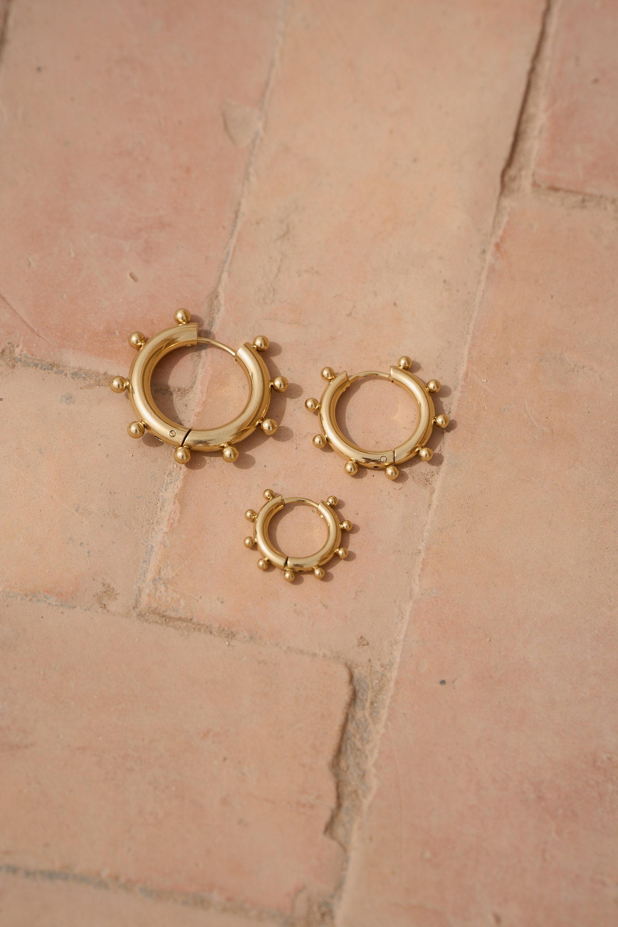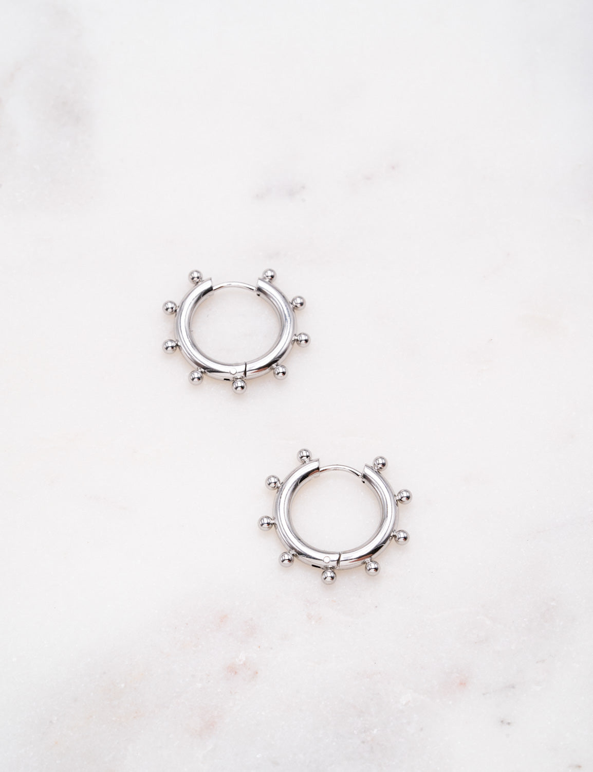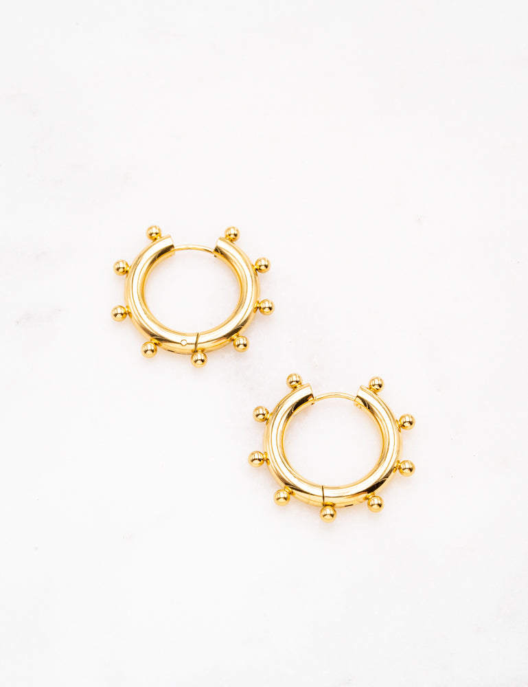 Boucles d'oreilles type créoles à fermoir charnière embellies de 9 petites boules.